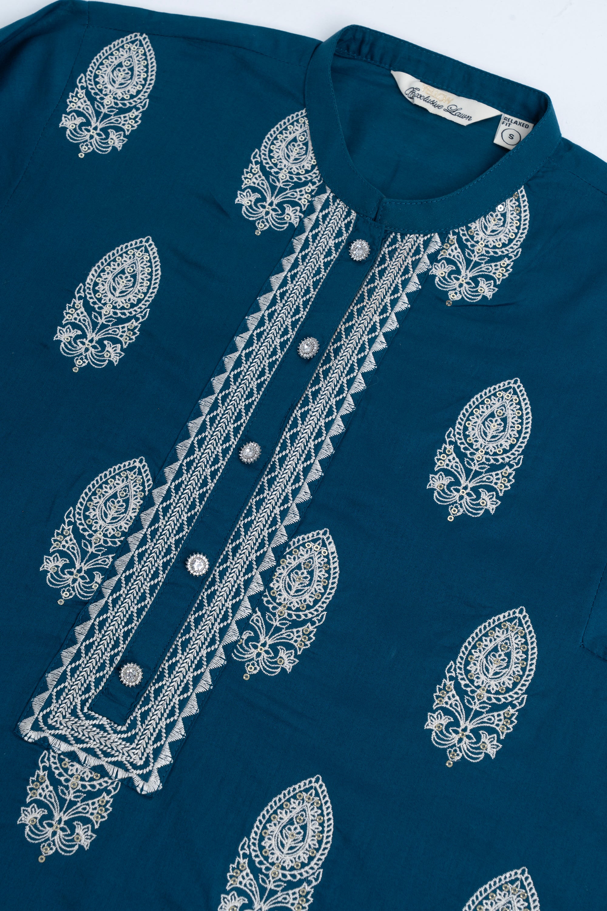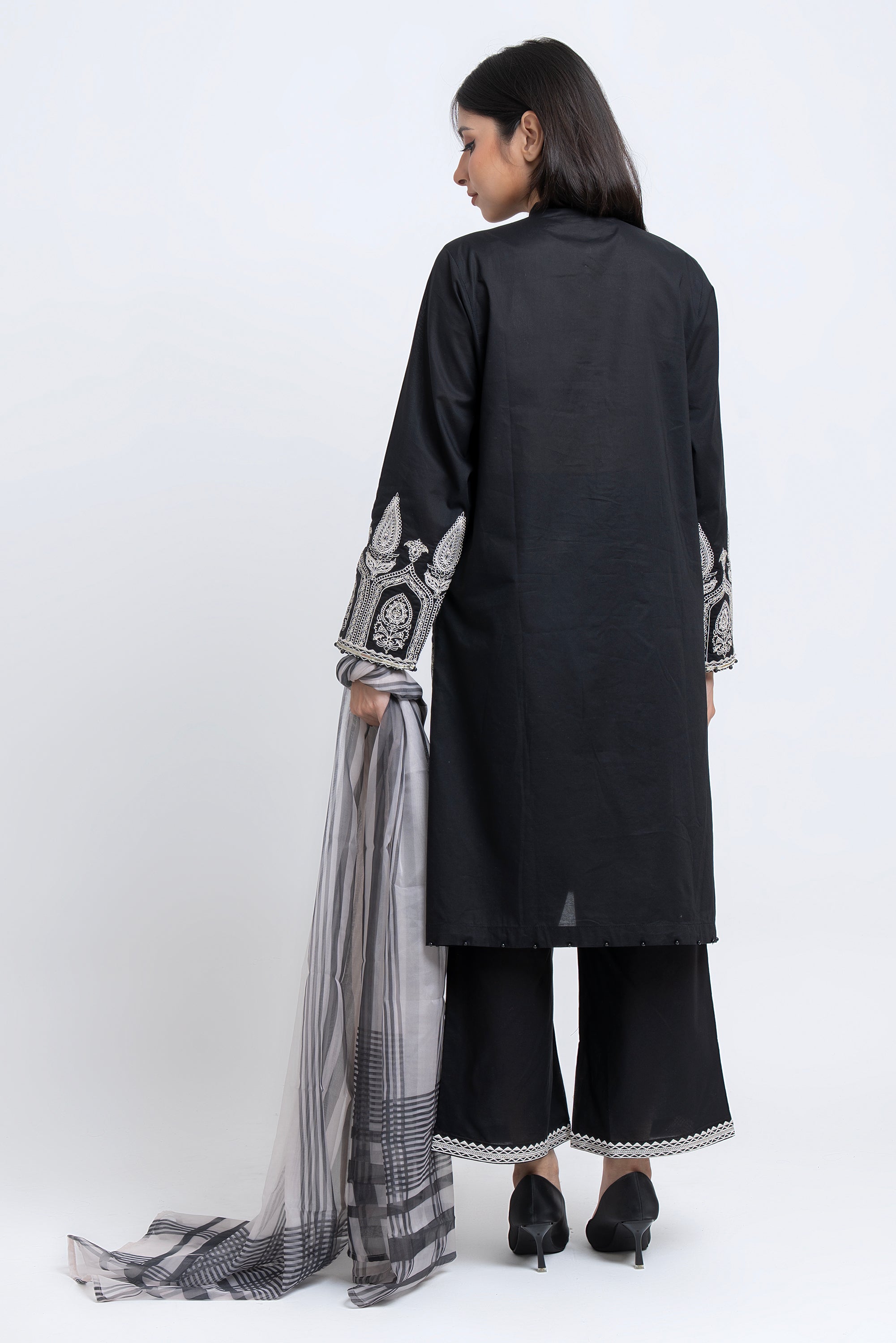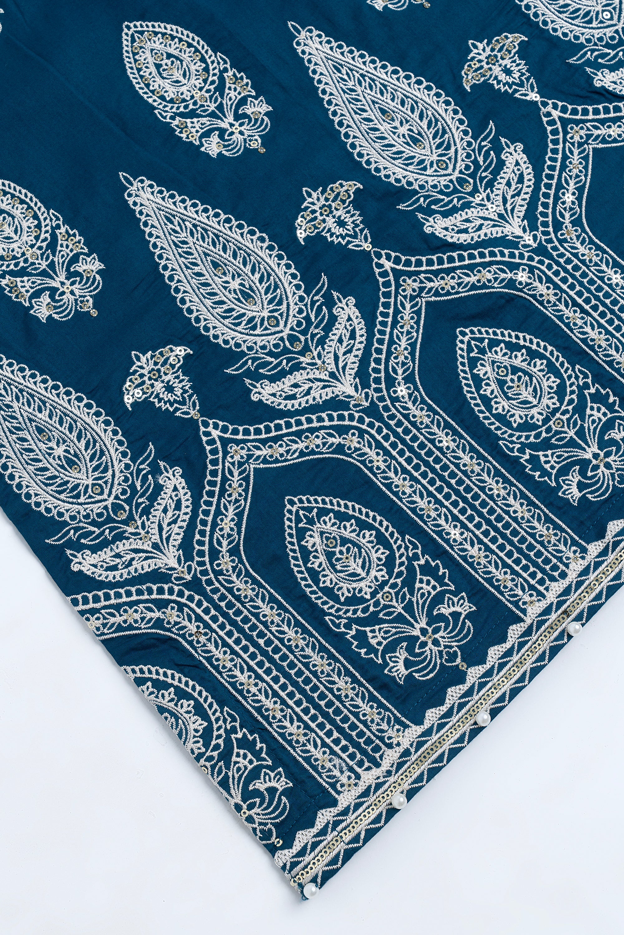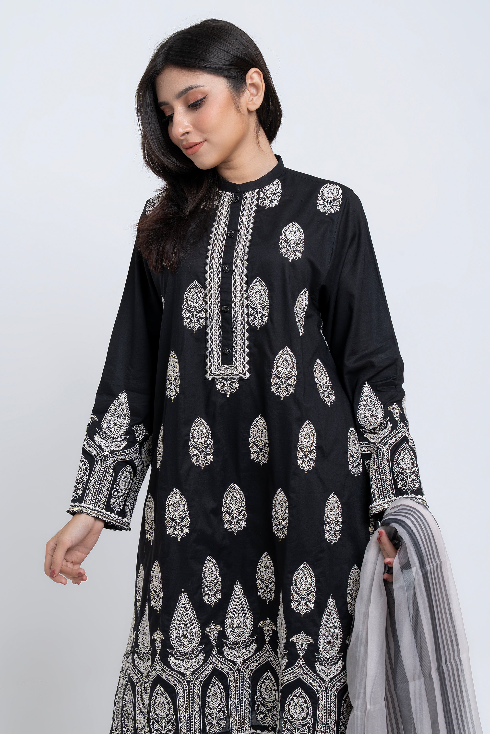 Elevate your elegance with our stunning ready-to-wear 3-Piece Lawn Salwar Kameez Suit, beautifully adorned with full front sequins embroidery. Designed with full sleeves featuring embroidered border and beads detailing, and tailored in a relaxed fit with a square armhole, the kameez is finished with a gracefully embellished neckline with decorative buttons.Paired with a solid dyed relaxed pant embellished with embroidered border and a luxurious printed organza dupatta, this ensemble is perfect for festive occasions or for adding timeless sophistication to your everyday wardrobe.