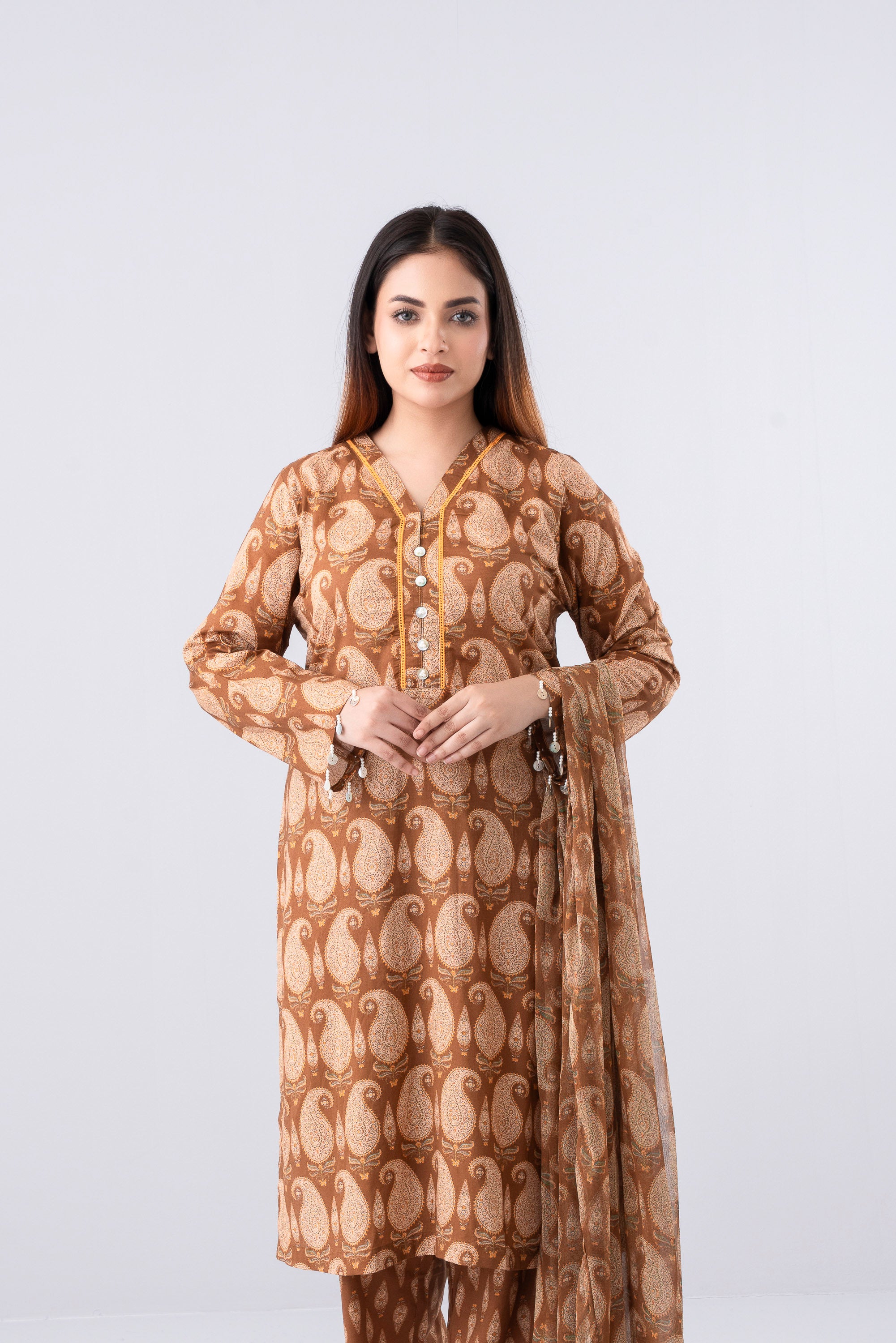 Elevate your elegance with our stunning ready-to-wear 3-Piece Lawn Salwar Kameez Suit, paired with a matching printed chffon dupatta and matching printed trouser. Embellished with delicate lace and decorative buttons and beaded tassels detailing, this ensemble exudes effortless sophistication—perfect for special occasions or to add refined charm to your everyday style.