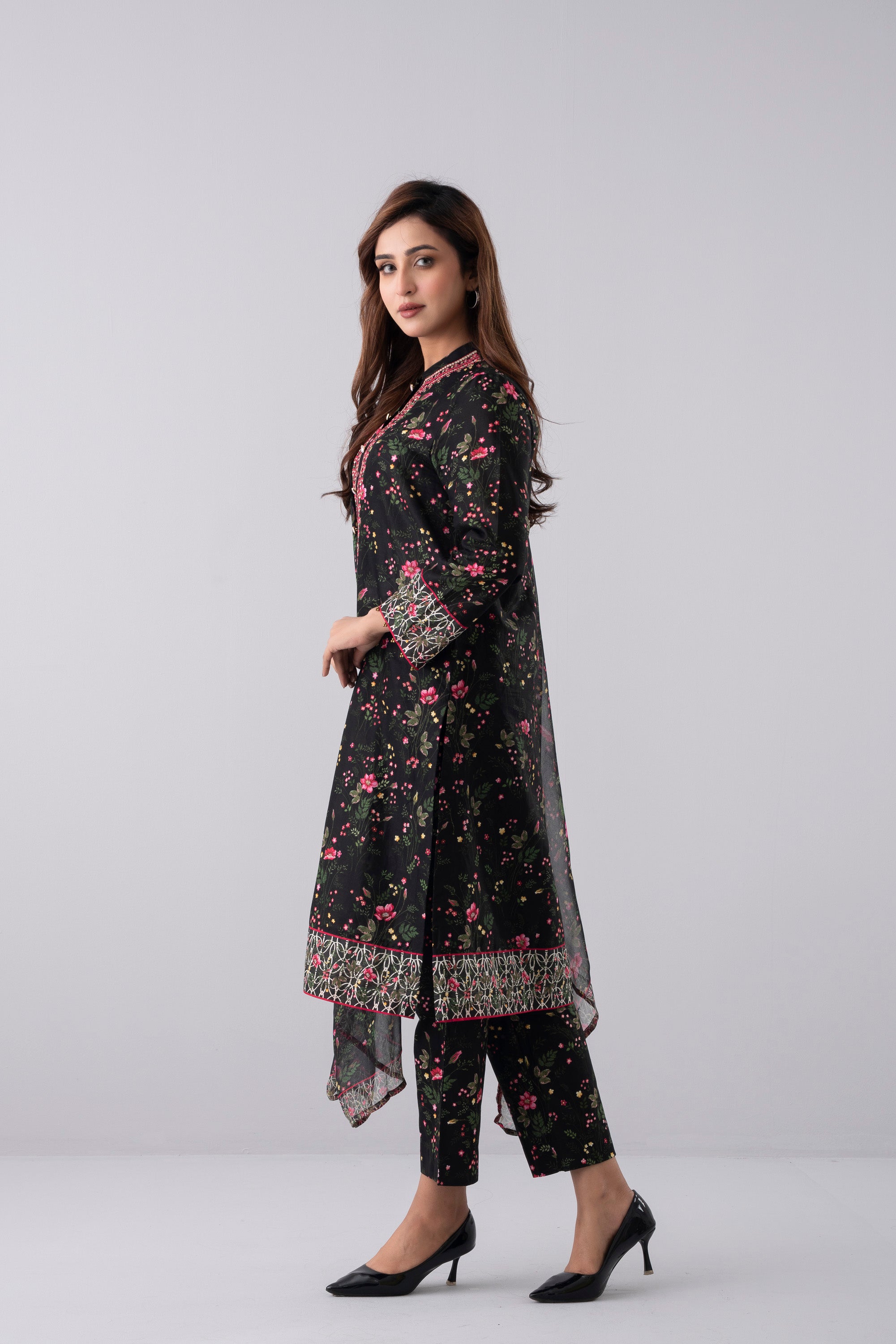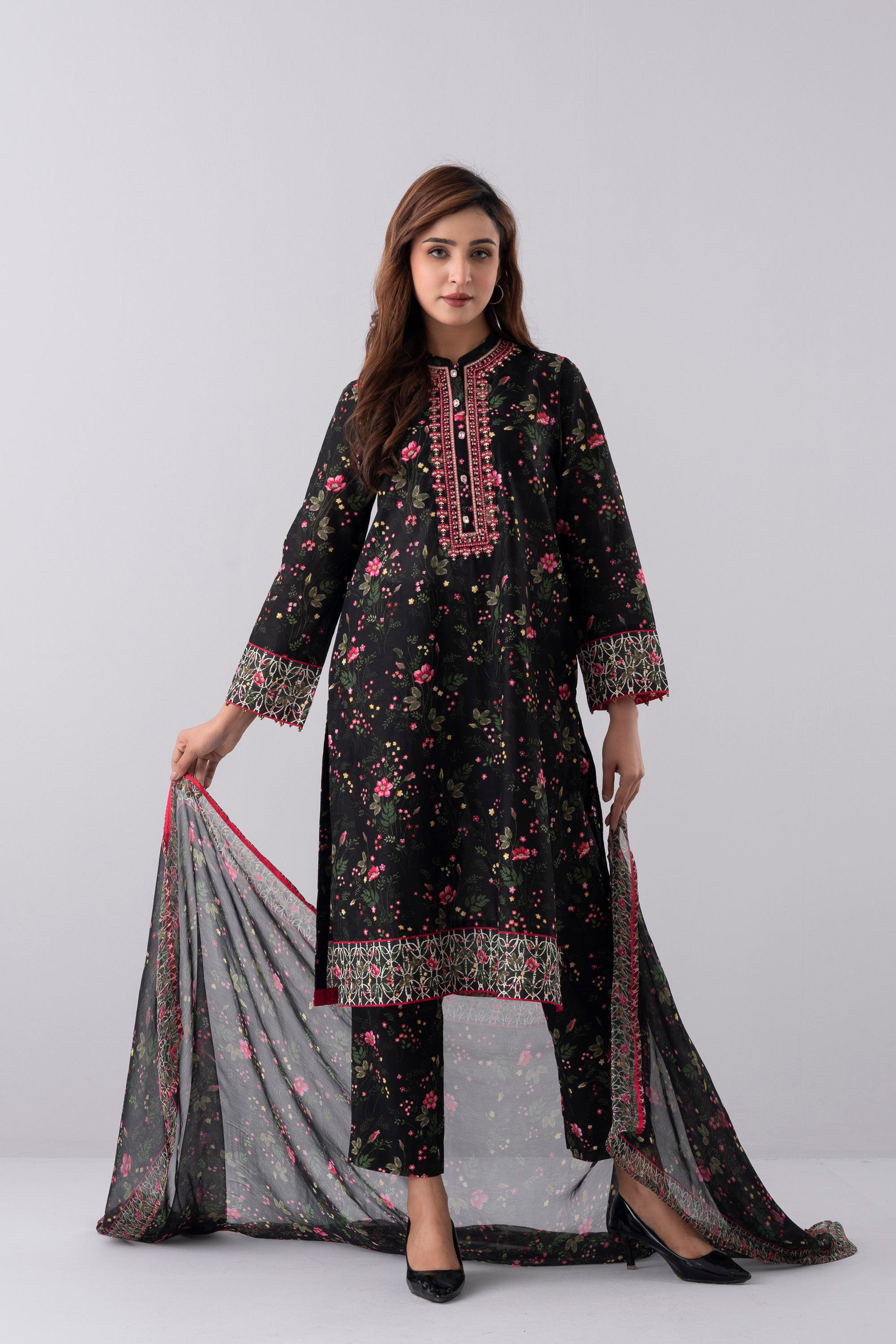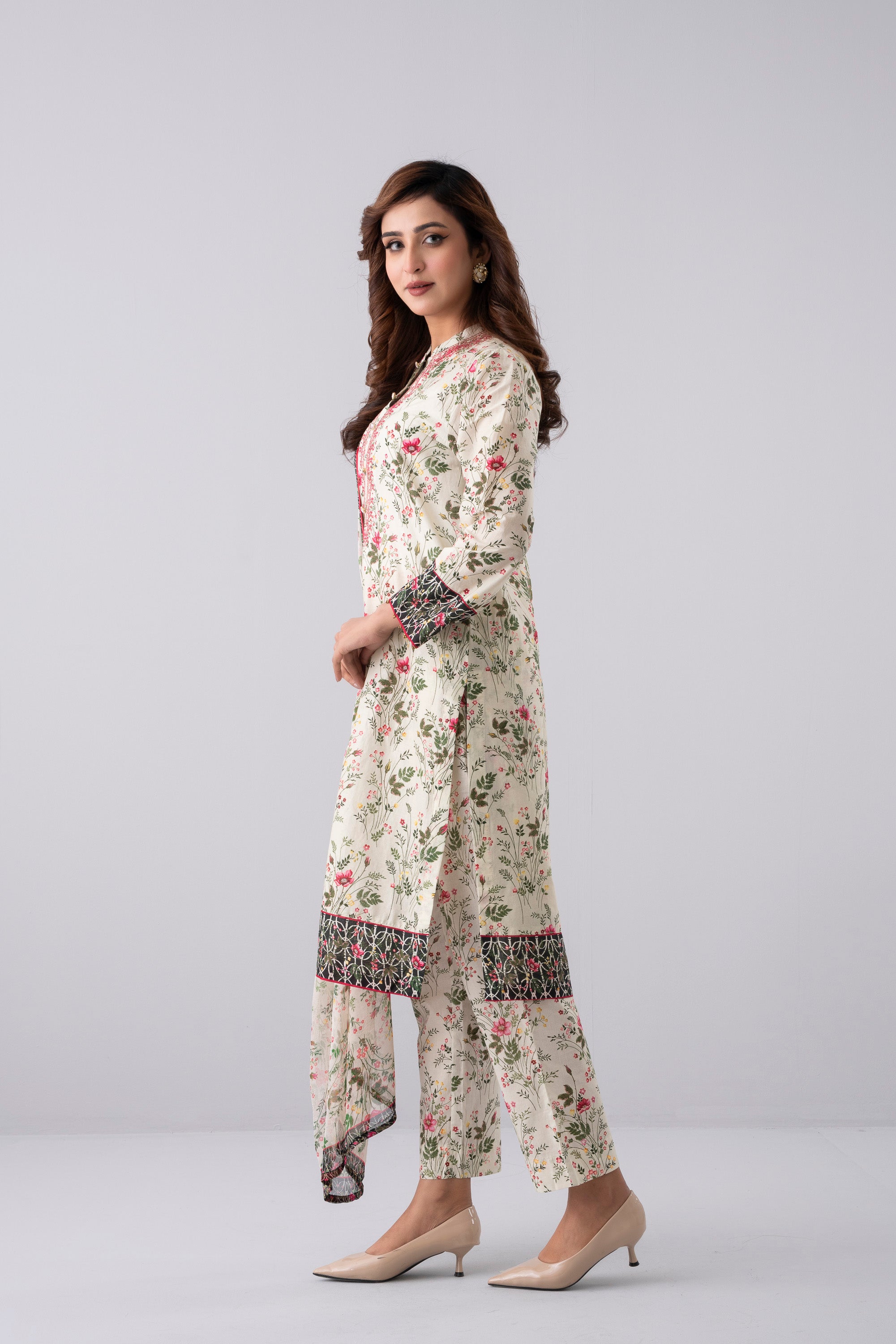 Elevate your elegance with our stunning ready-to-wear 3-Piece Lawn Salwar Kameez Suit, paired with a chiffon dupatta and matching printed trouser. The ensemble is beautifully adorned with embroidery, decorative buttons, and 3-set golden bead detailing, creating a refined and elegant look. Perfect for special occasions or for adding luxury to your everyday wardrobe.
