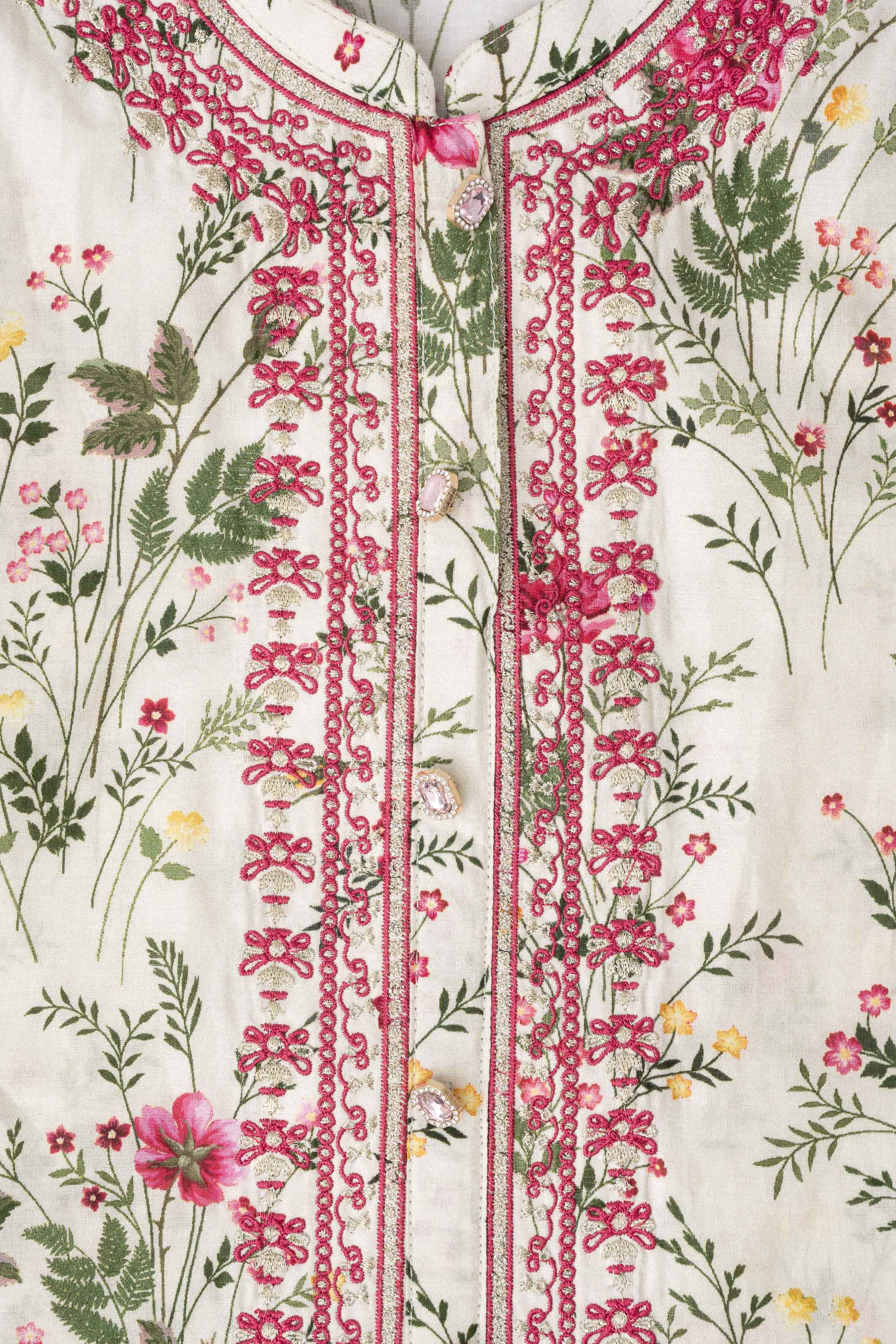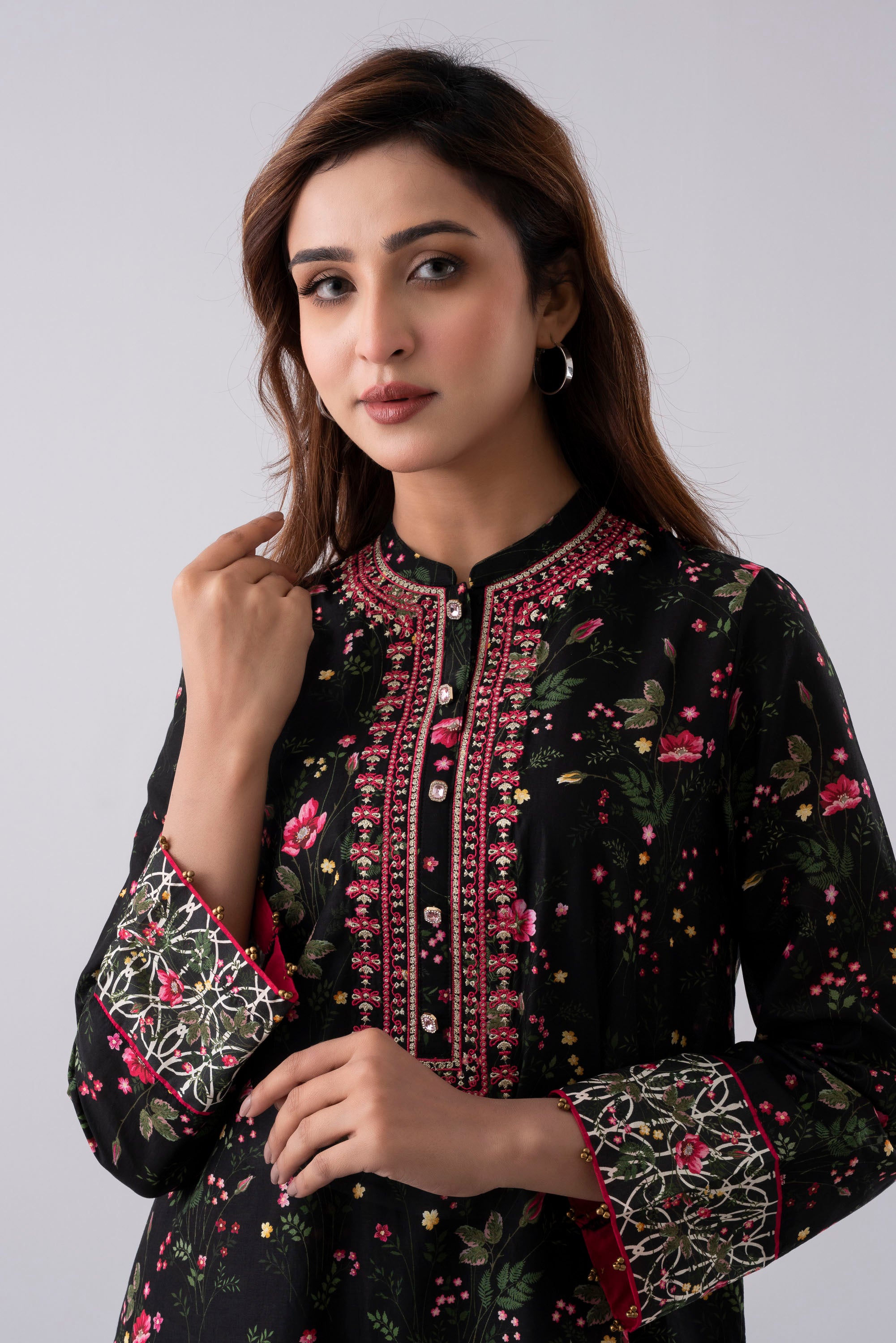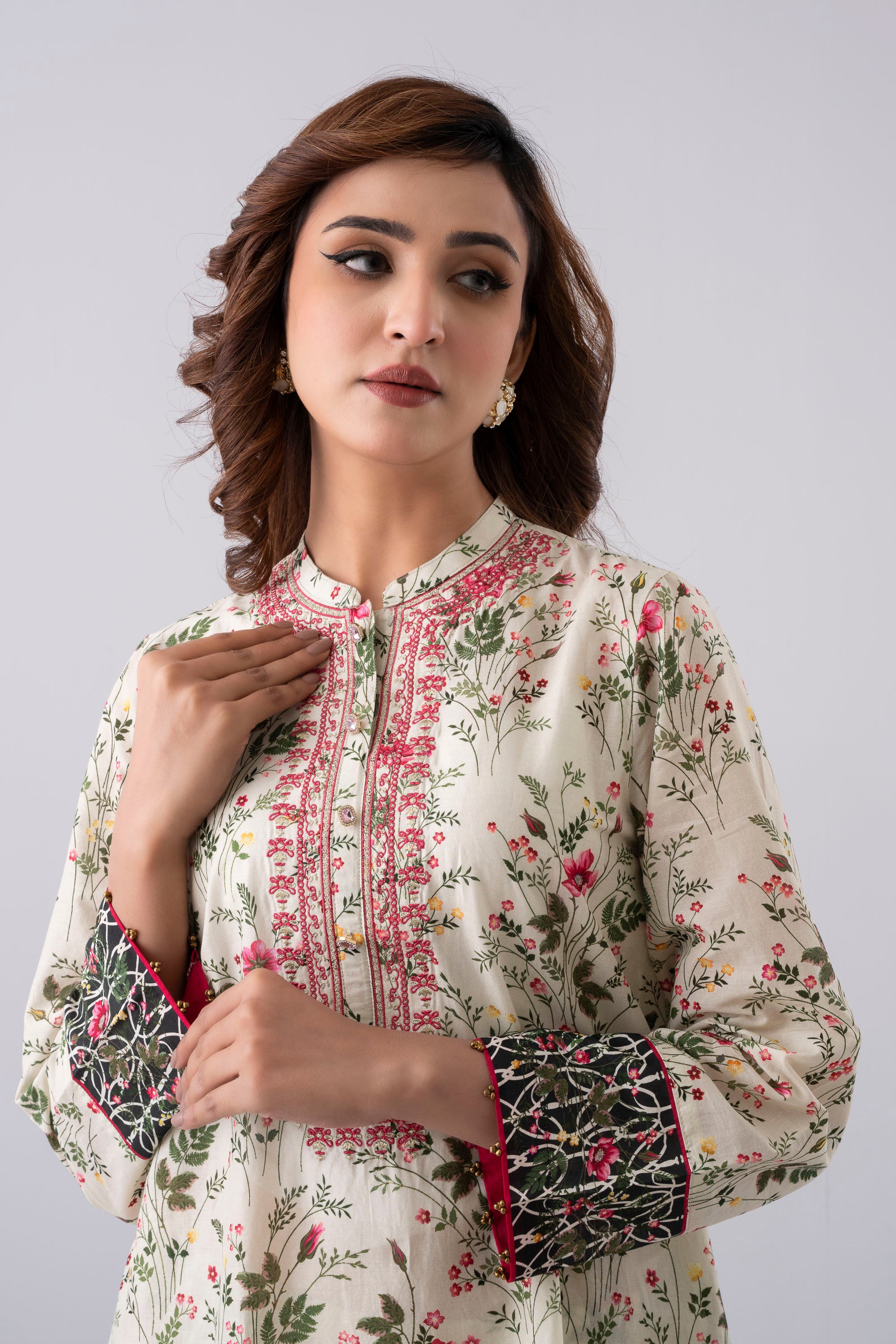 Elevate your elegance with our stunning ready-to-wear 3-Piece Lawn Salwar Kameez Suit, paired with a chiffon dupatta and matching printed trouser. The ensemble is beautifully adorned with embroidery, decorative buttons, and 3-set golden bead detailing, creating a refined and elegant look. Perfect for special occasions or for adding luxury to your everyday wardrobe.