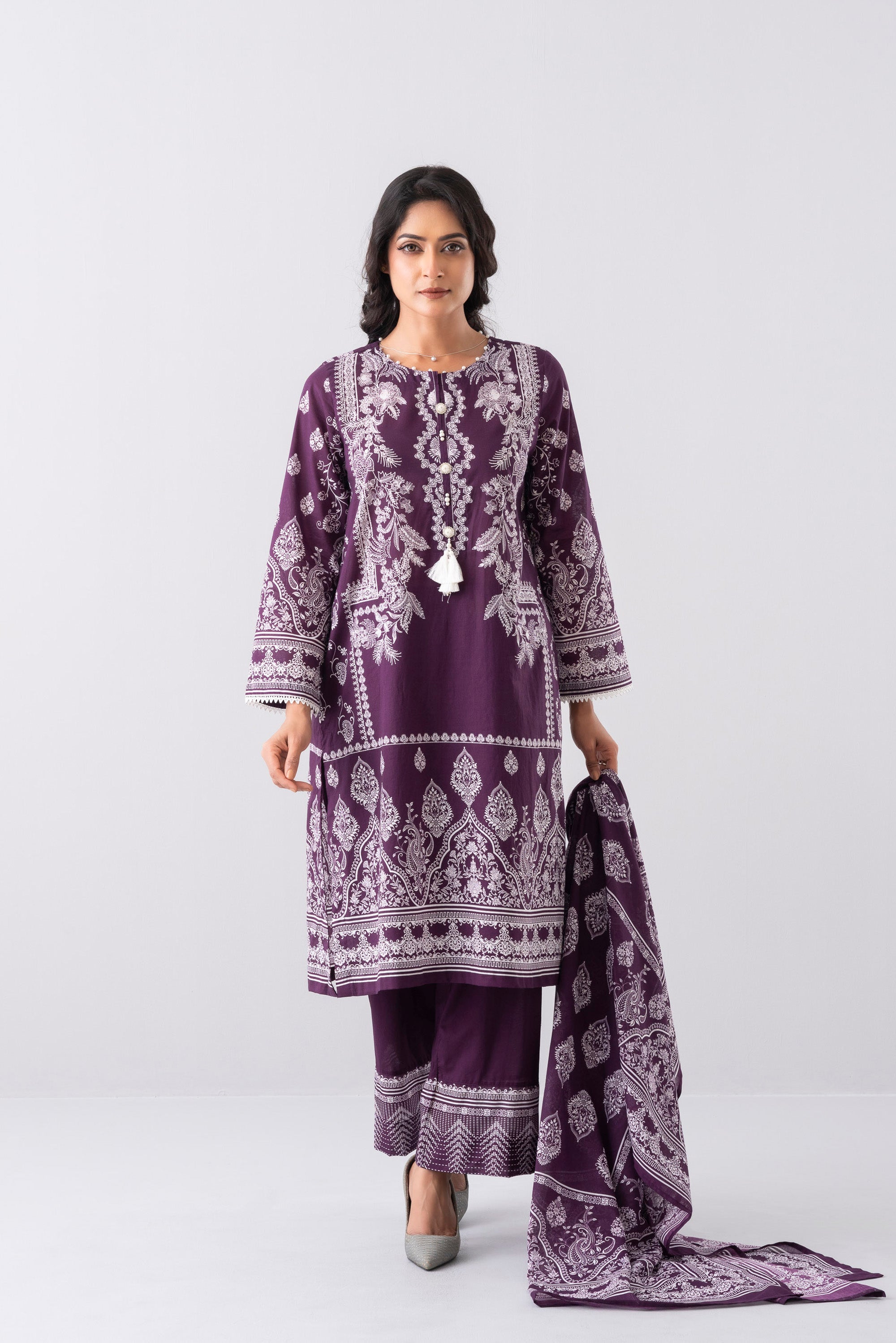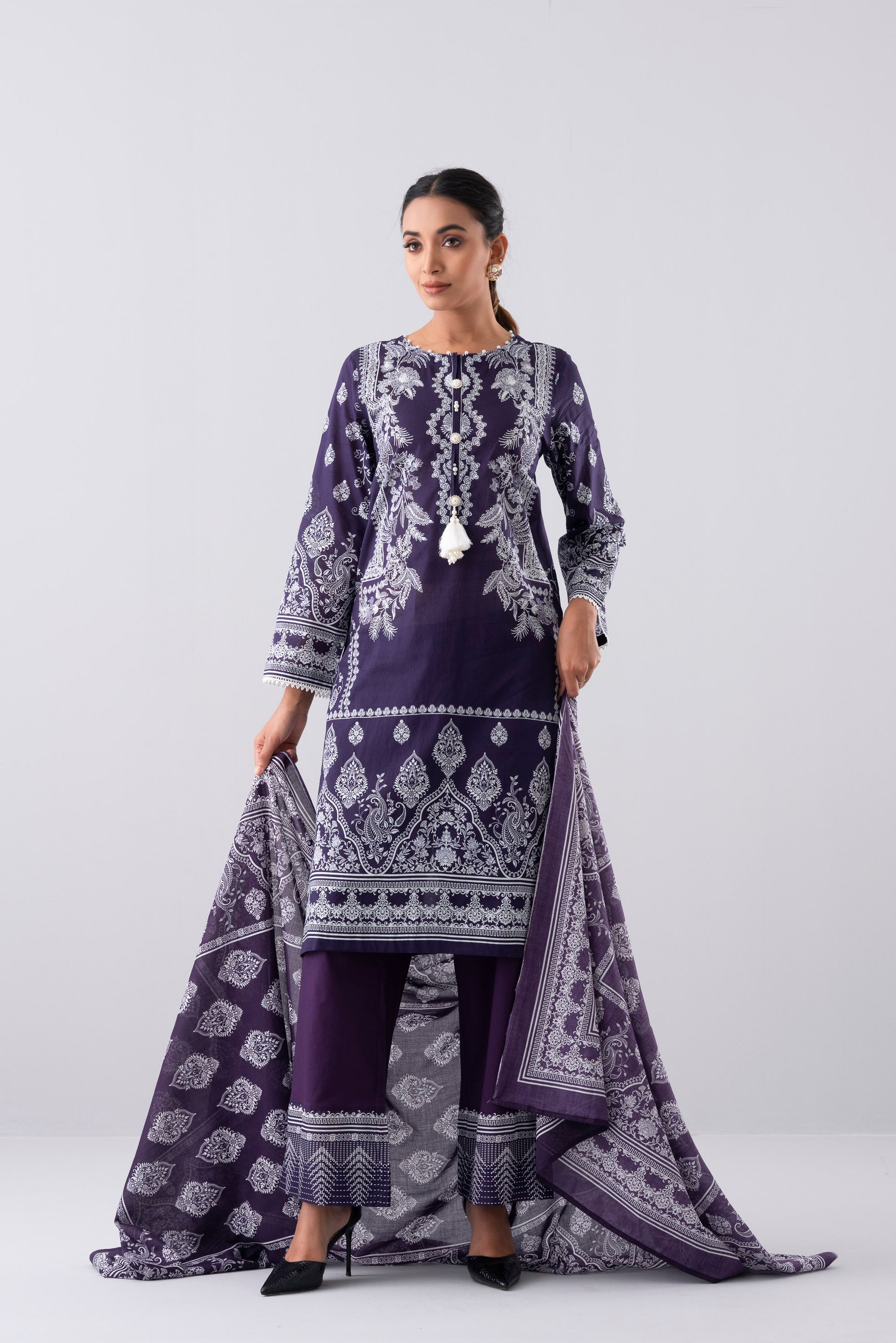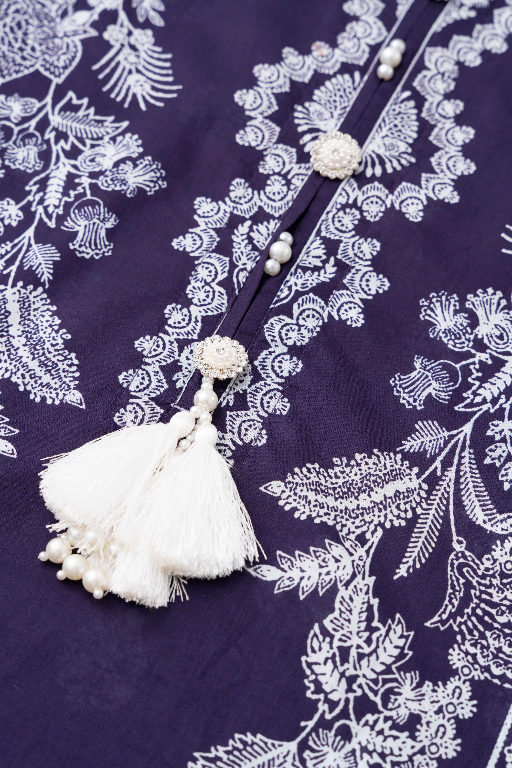 Elevate your elegance with our stunning ready-to-wear 3 Piece Lawn Salwar Kameez Suit with cotton dupatta and solid dyed trouser embellished with decorative buttons, tassel, lace and pearls detailing that exudes elegance and sophistication, perfect for special occasions or adds luxury to your everyday wardrobe.