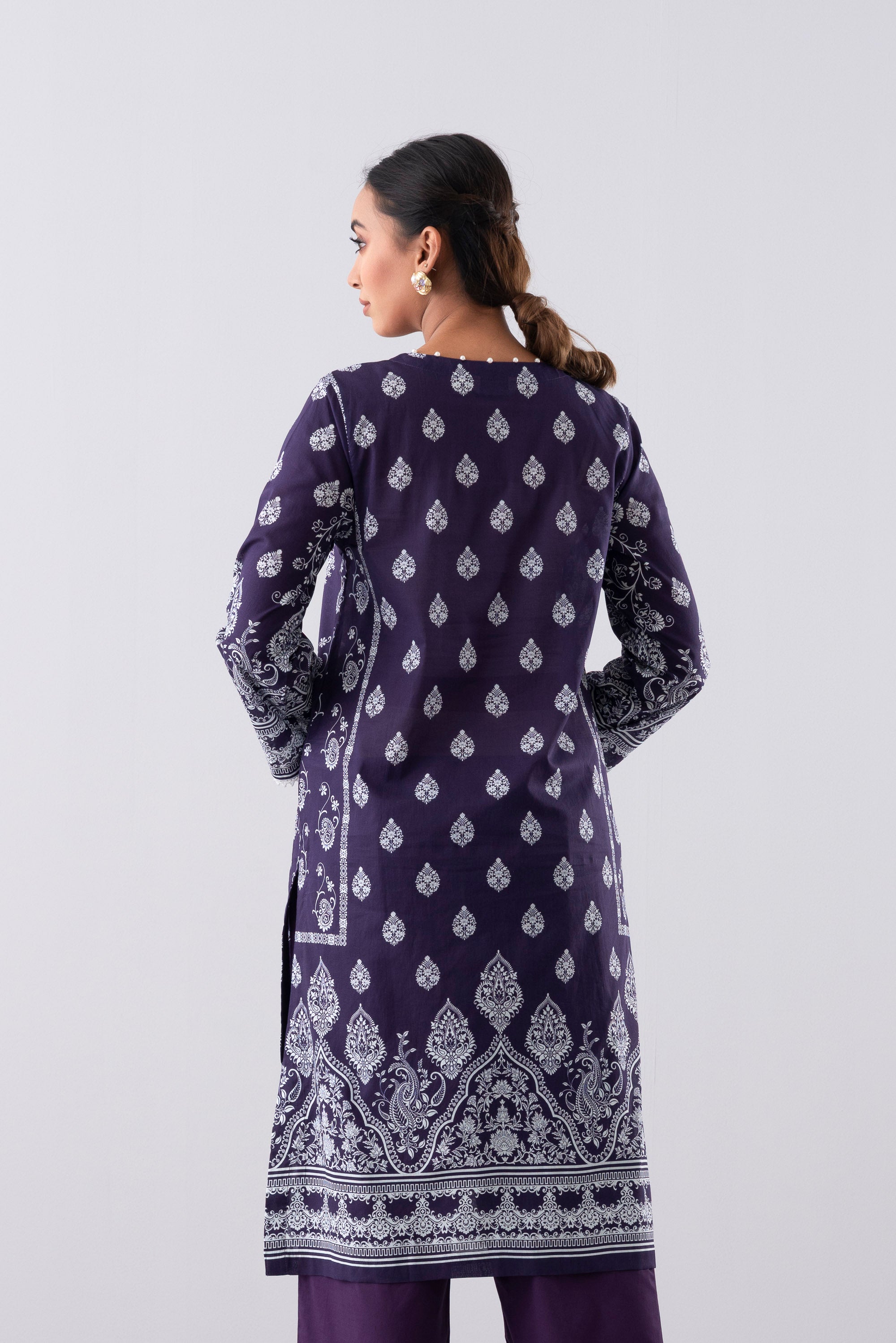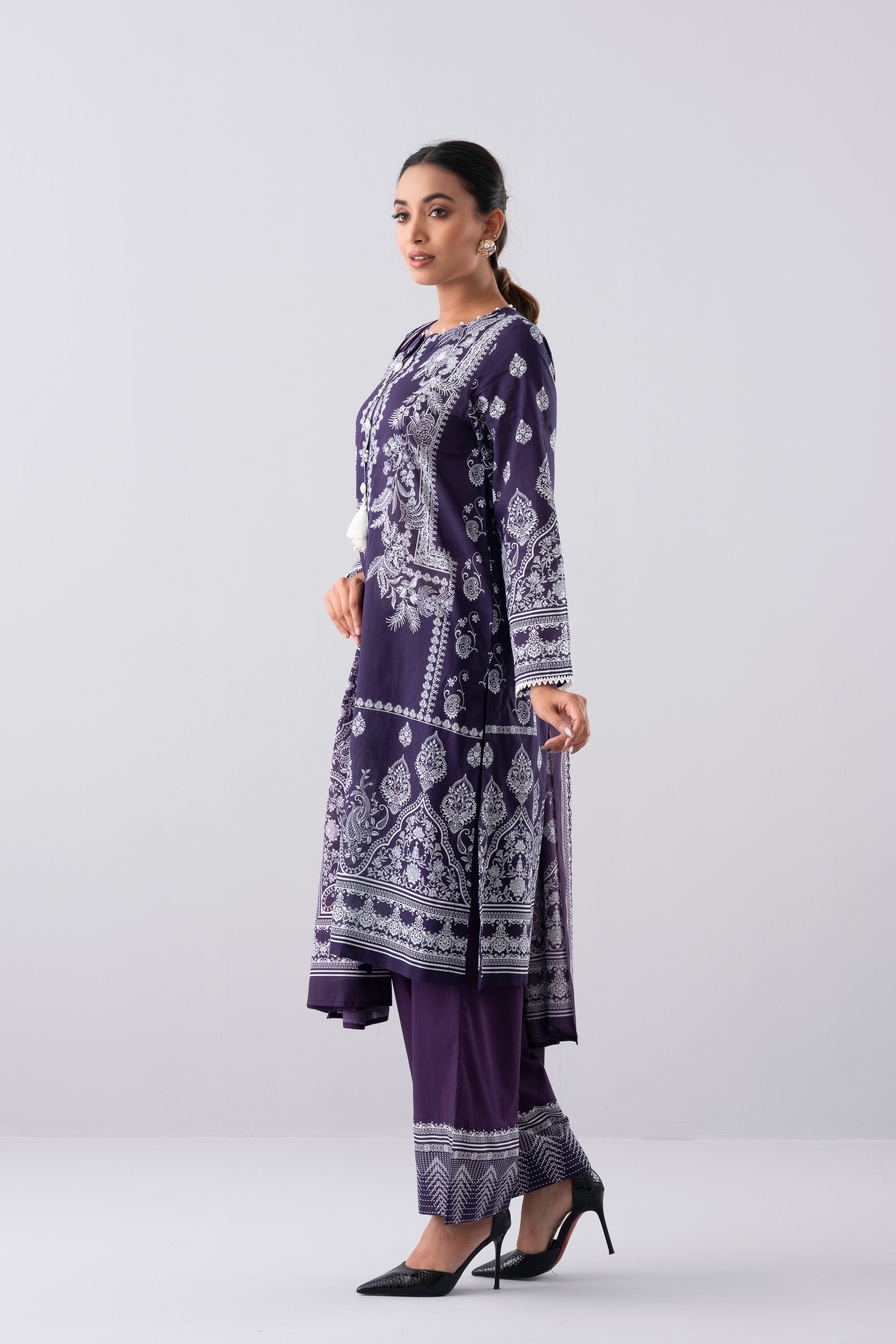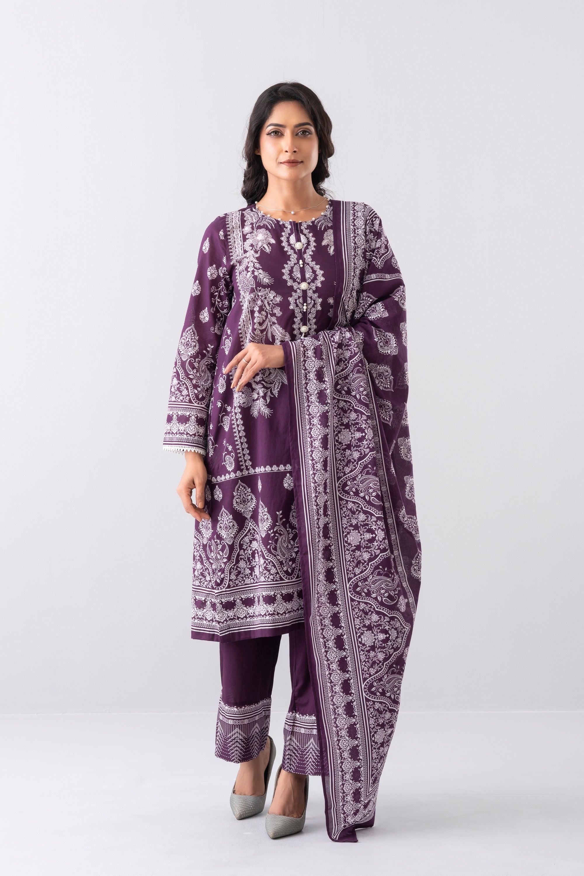 Elevate your elegance with our stunning ready-to-wear 3 Piece Lawn Salwar Kameez Suit with cotton dupatta and solid dyed trouser embellished with decorative buttons, tassel, lace and pearls detailing that exudes elegance and sophistication, perfect for special occasions or adds luxury to your everyday wardrobe.