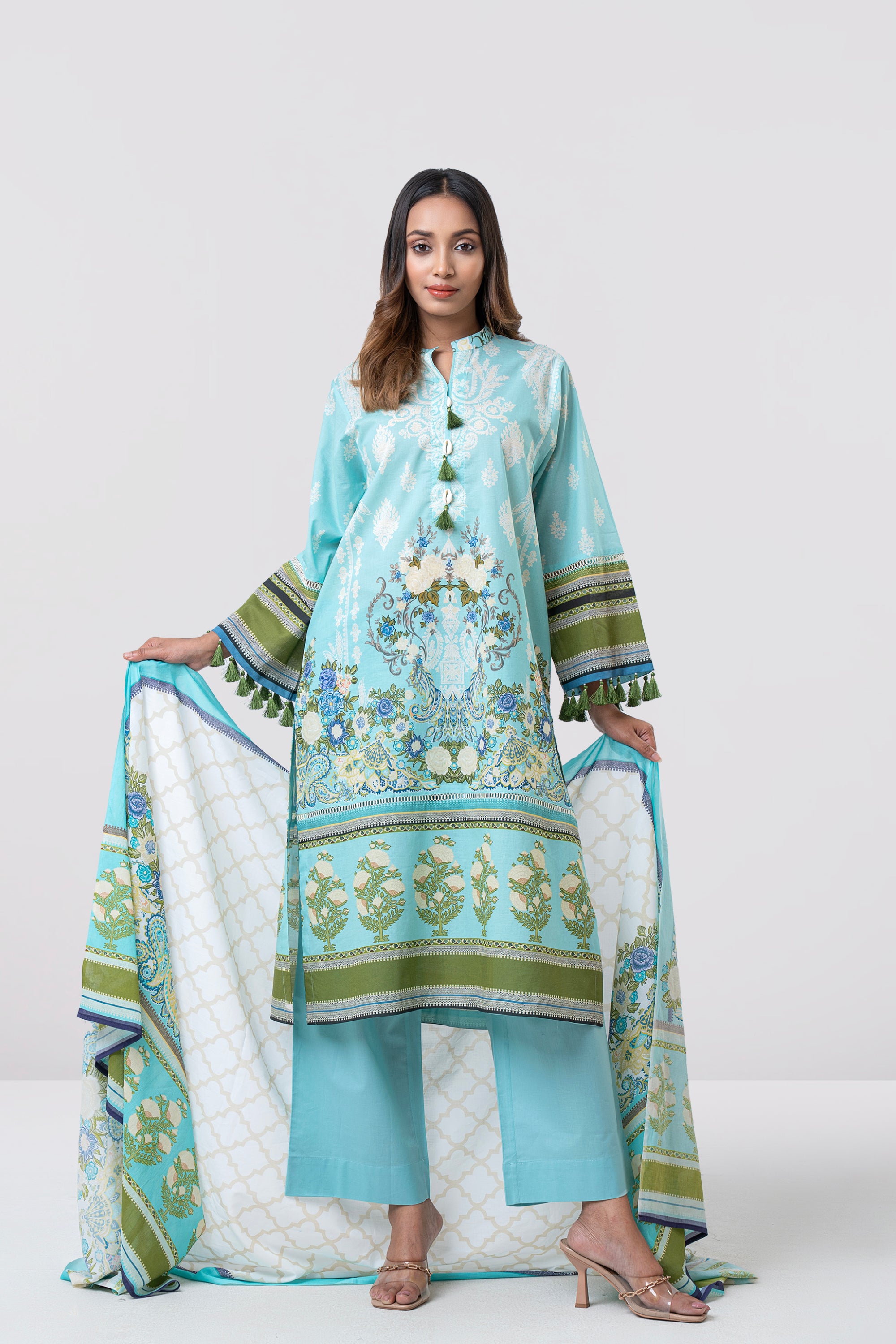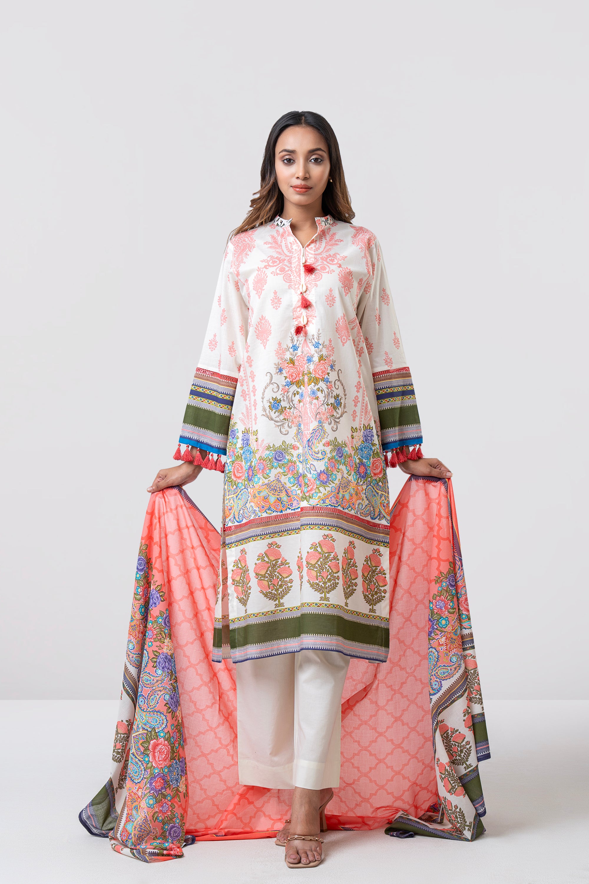 Elevate your elegance with our ready-to-wear Three-Piece Lawn Salwar Kameez Suit, crafted in digitally printed lawn and designed with a printed band collar embellished with cowry shells and beads. The long-length relaxed-fit kameez features lace detailing and tassels at the sleeves for a subtle stylish touch. Paired with a printed cotton dupatta and a solid dyed trouser, this set is perfect for special occasions or effortless everyday wear.