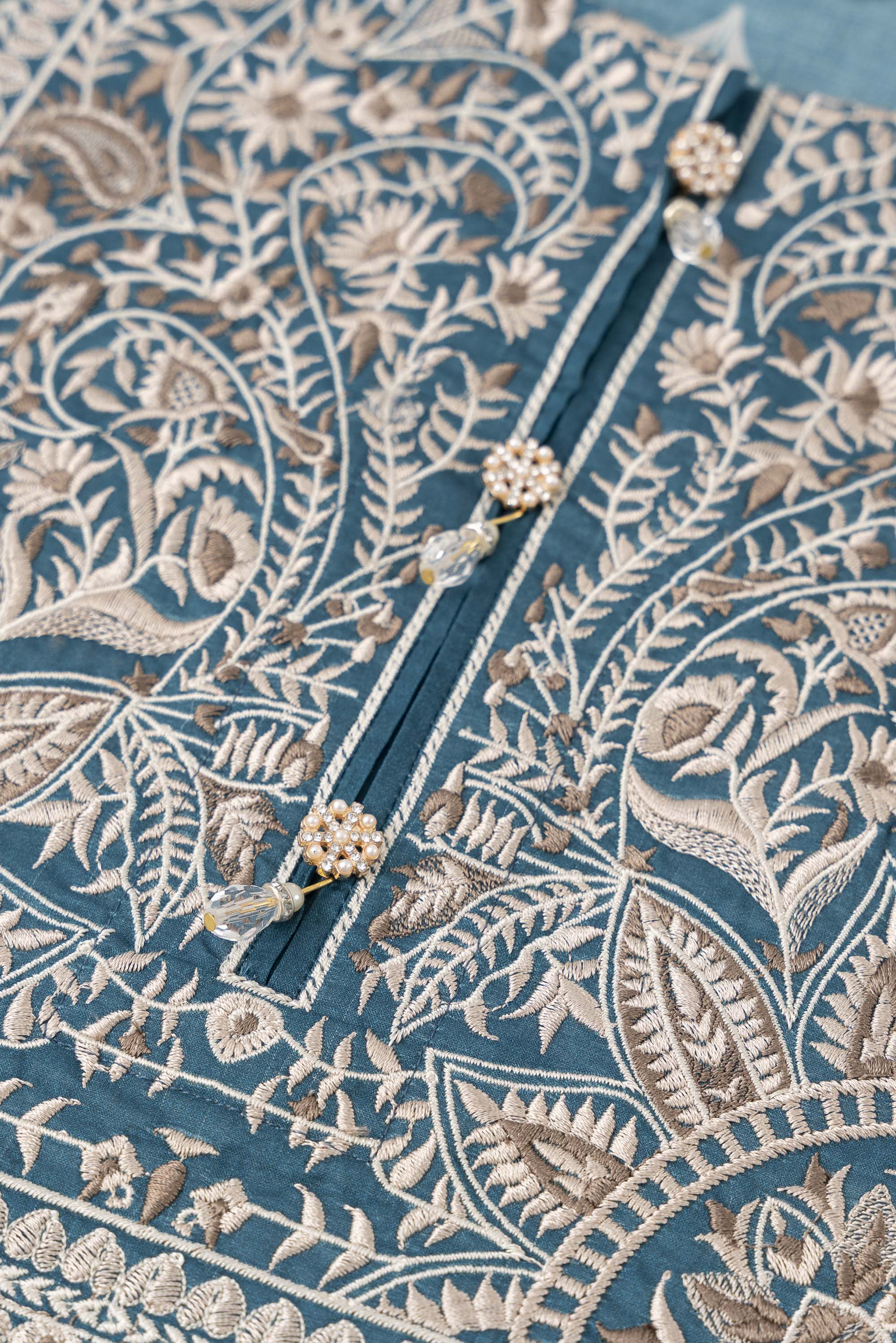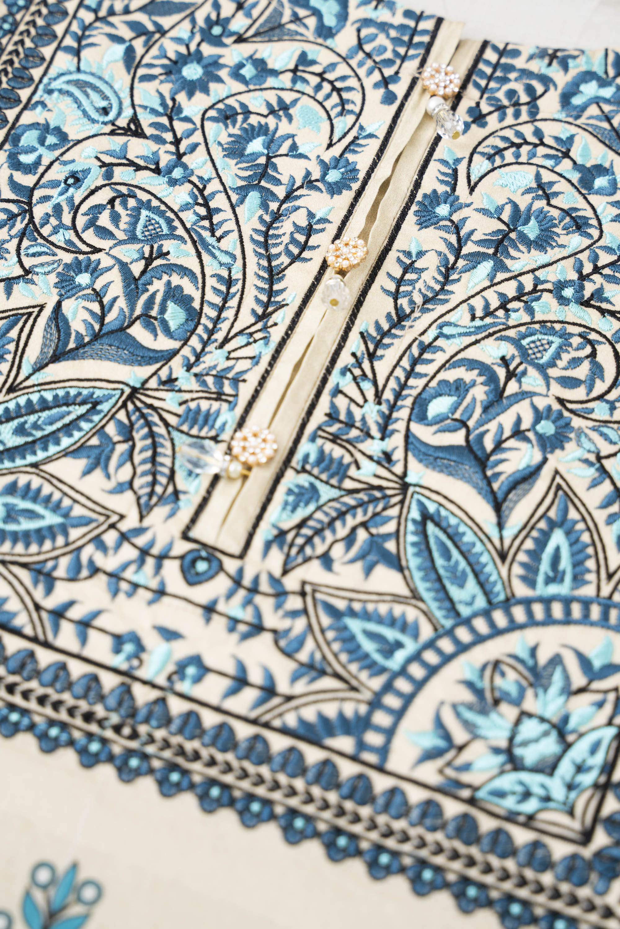Elevate your elegance with our stunning ready-to-wear 3-Piece embroidered Lawn Salwar Kameez Suit, paired with a luxurious silk dupatta and solid dyed trouser. The ensemble is beautifully detailed with intricate embroidery, decorative buttons at the neckline, and delicate crystal embellishments at the sleeve hem—creating a refined and graceful look. Designed in a relaxed fit silhouette, this outfit offers both comfort and sophistication, making it perfect for special occasions or for adding a touch of elegance to your everyday wardrobe.