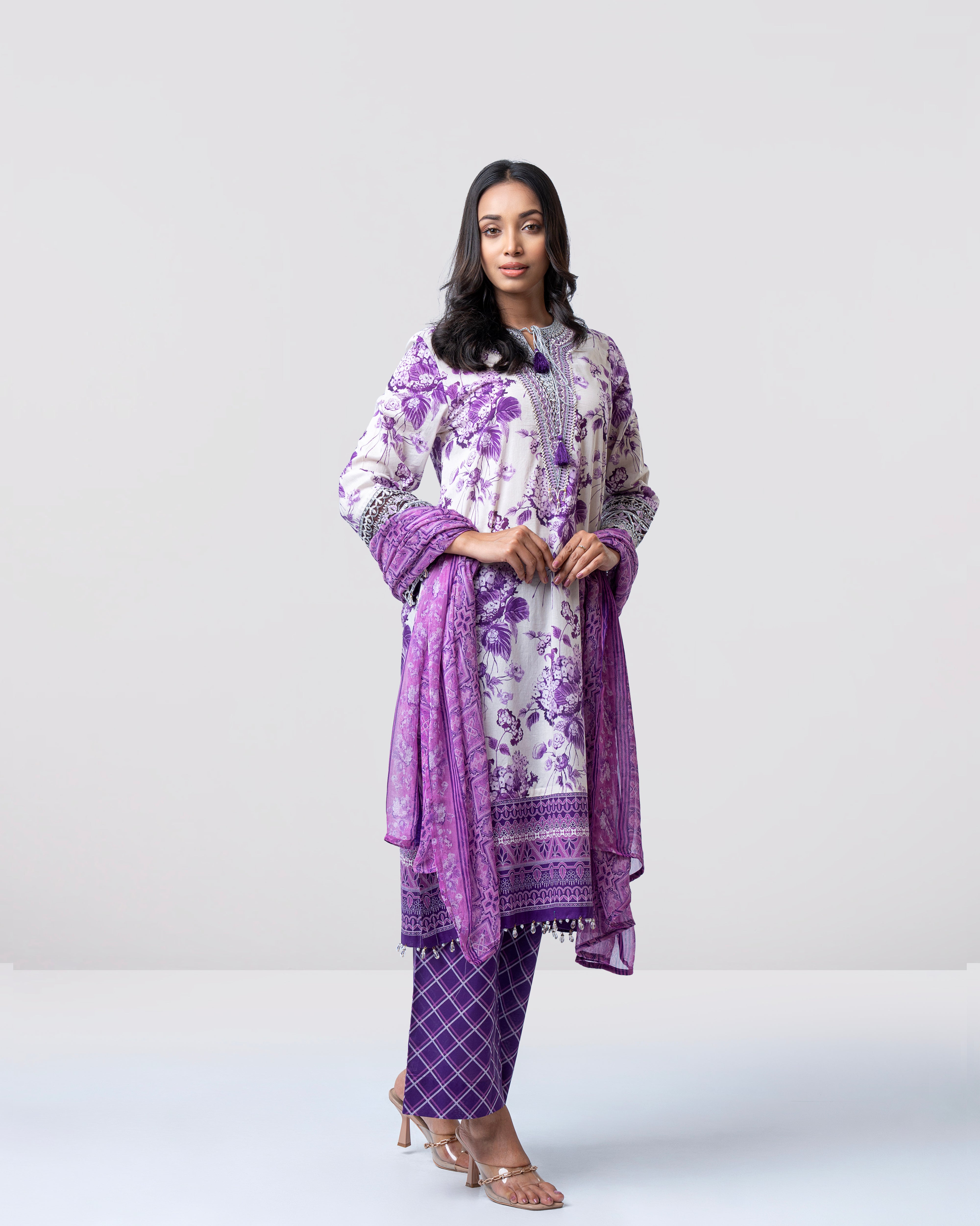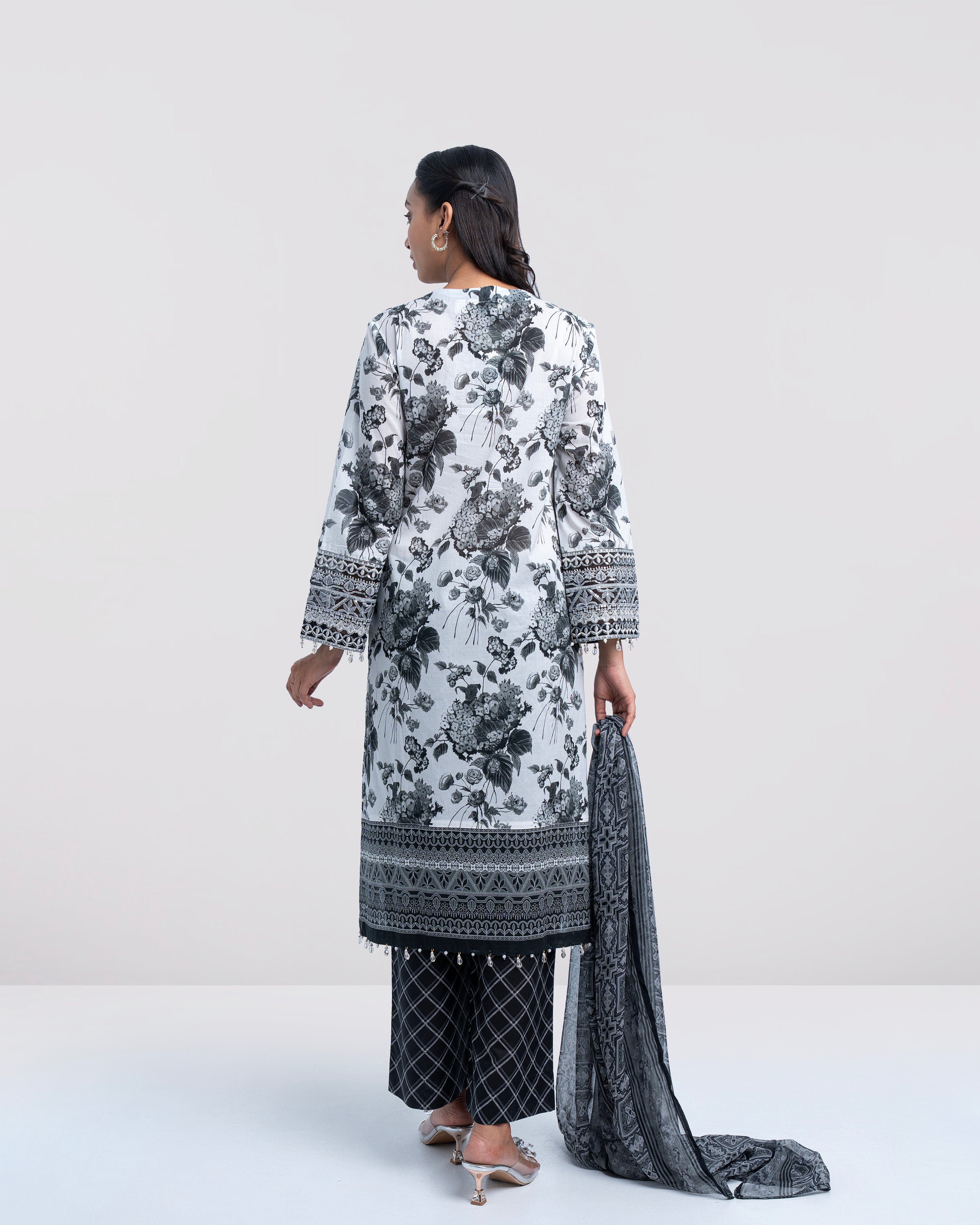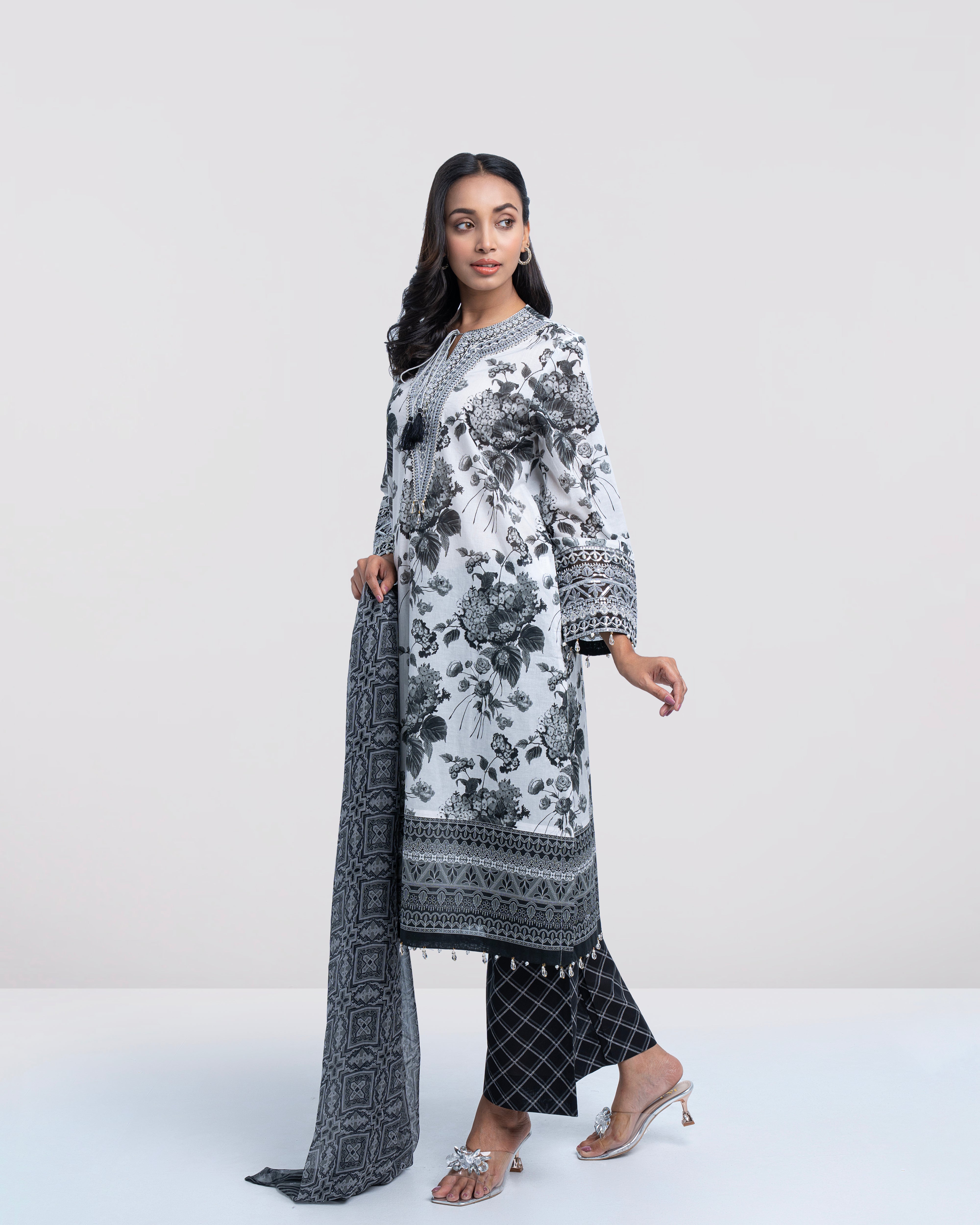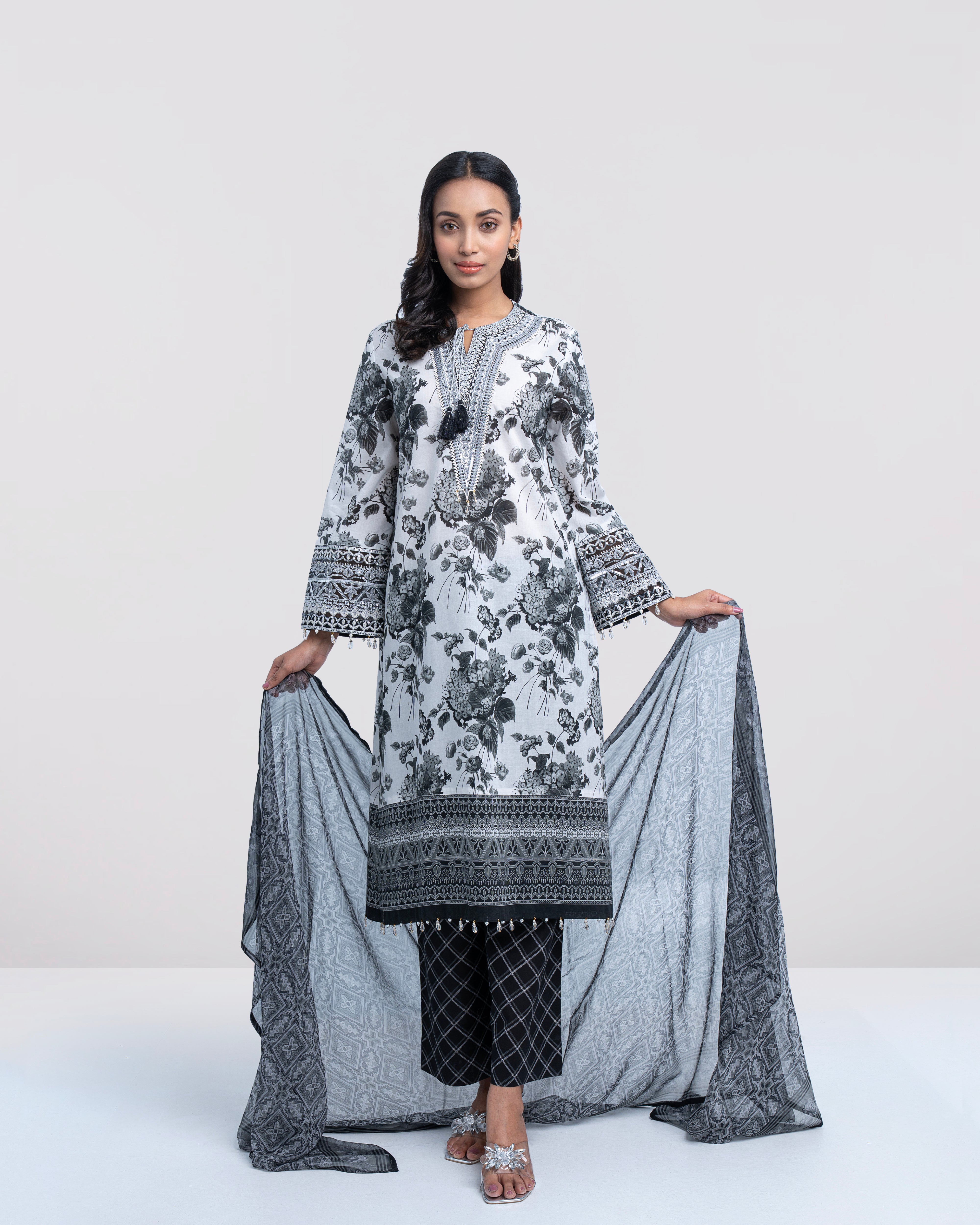 Elevate your elegance with our stunning ready-to-wear 3-Piece digitally printed Lawn Salwar Kameez Suit, paired with a digitally printed chiffon dupatta and matching printed trouser. The ensemble is beautifully embellished with lurex and sequin embroidery on organza, decorative tassels, and crystal and pearls detailing at the sleeves and bottom hem—creating a refined and elegant look. Perfect for special occasions or for adding a touch of luxury to your everyday wardrobe.