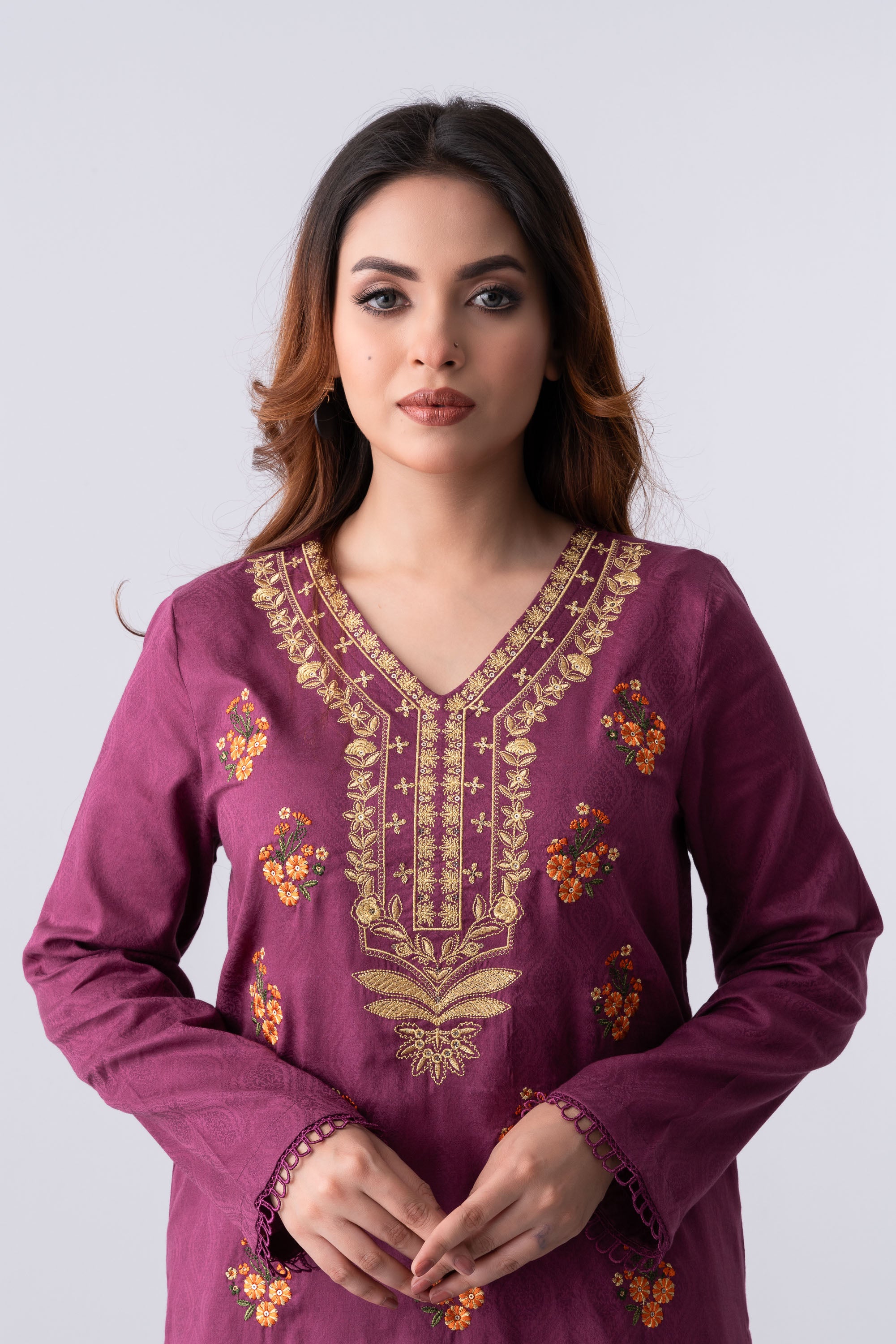 Elevate your elegance with our ready-to-wear Three-Piece Lawn Salwar Kameez Suit, which features intricate full lurex embroidery on premium jacquard fabric and is enhanced with delicate lace detailing for a refined touch. Paired with a luxurious digitally printed silk dupatta and a stylish metallic printed flared palazzo, this ensemble exudes sophistication—perfect for special occasions or effortlessly elevating your everyday wardrobe.