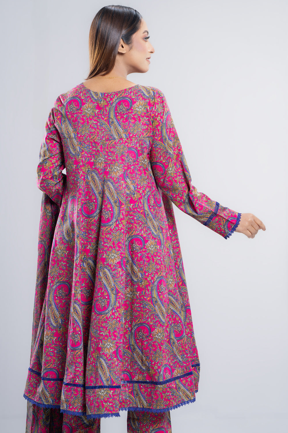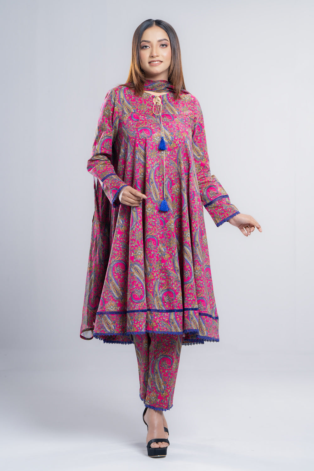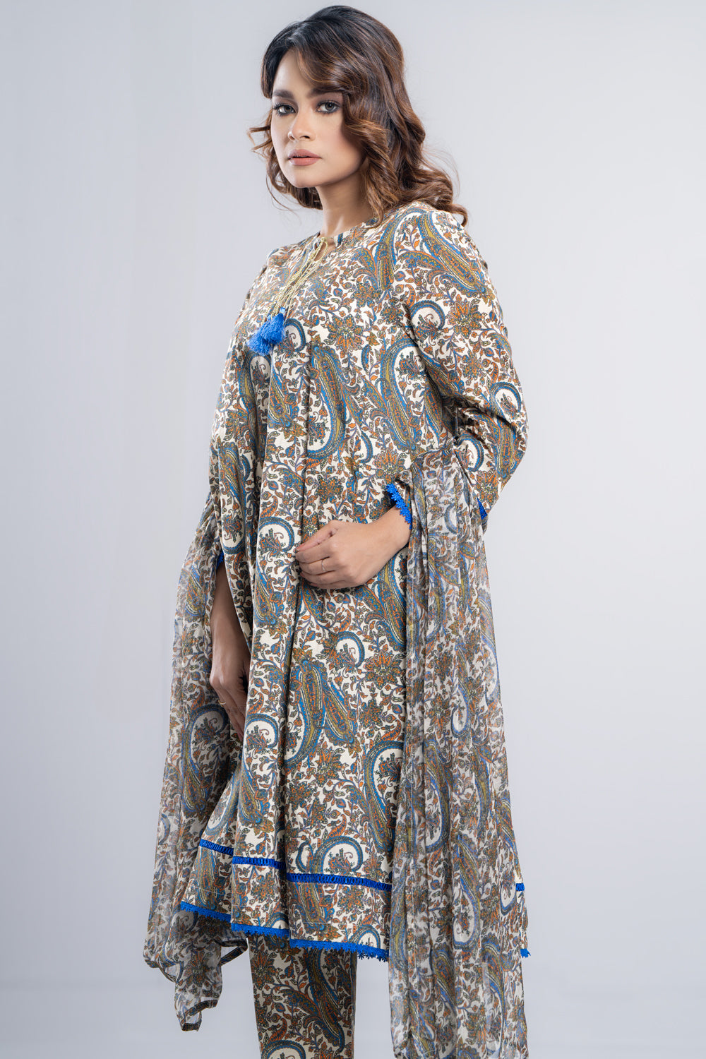 Elevate your elegance with our stunning ready-to-wear 3 Piece Lawn Salwar Kameez Suit with chiffon dupatta and matching printed smart pants. Featuring an empire line cut with a graceful flare and a matching print on the top, bottom, and dupatta. This piece is adorned with tassels and decorative lace at the sleeves and hem. Combining comfort and elegance, perfect for special occasions or adds luxury to your everyday wardrobe.