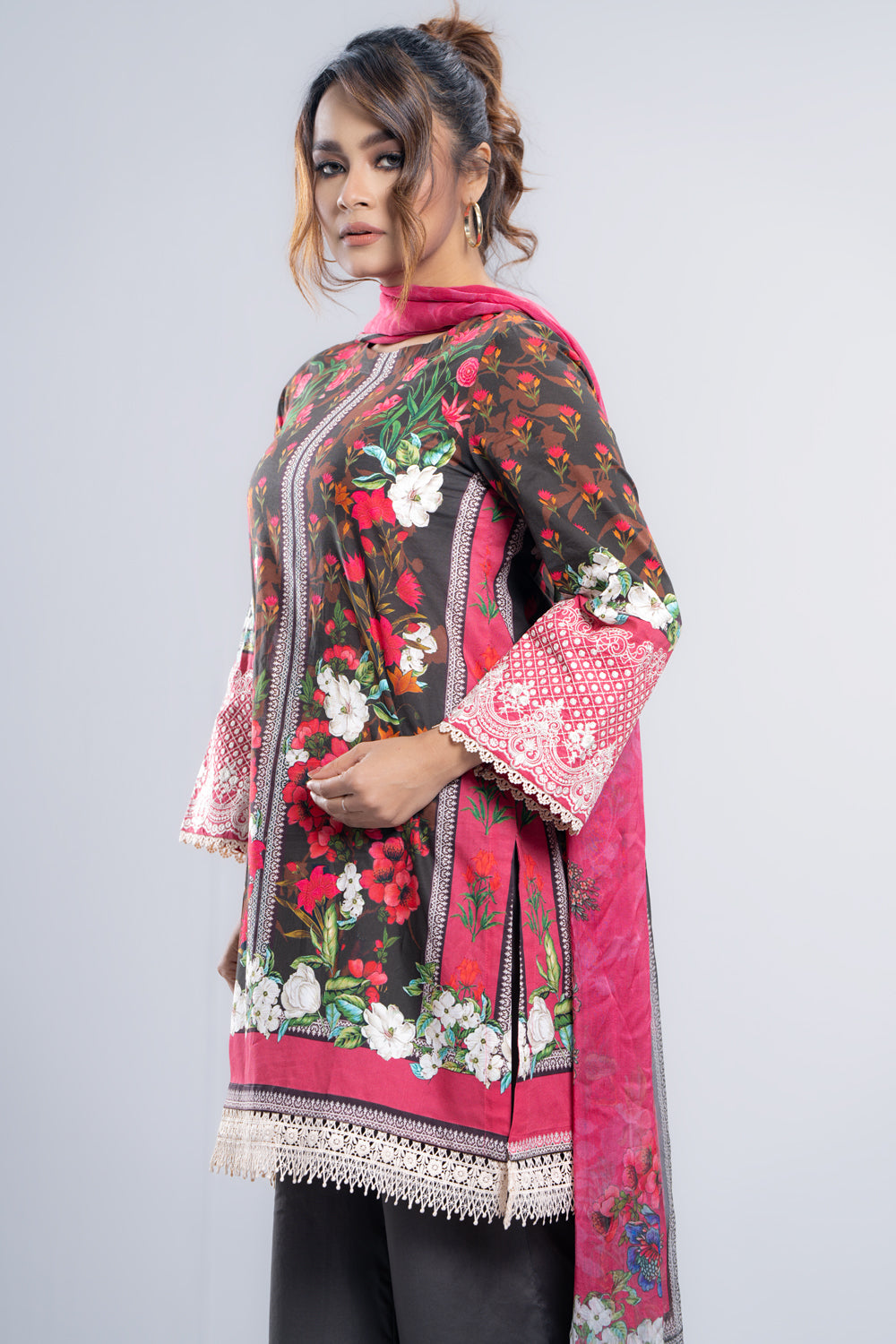Elevate your elegance with our stunning ready-to-wear 3 Piece Lawn Salwar Kameez Suit with chiffon dupatta and solid dyed Palazzo embellished with embroidery at sleeve and decorative lace detailing that exudes elegance and sophistication,perfect for special occasions or adds luxury to your everyday wardrobe.