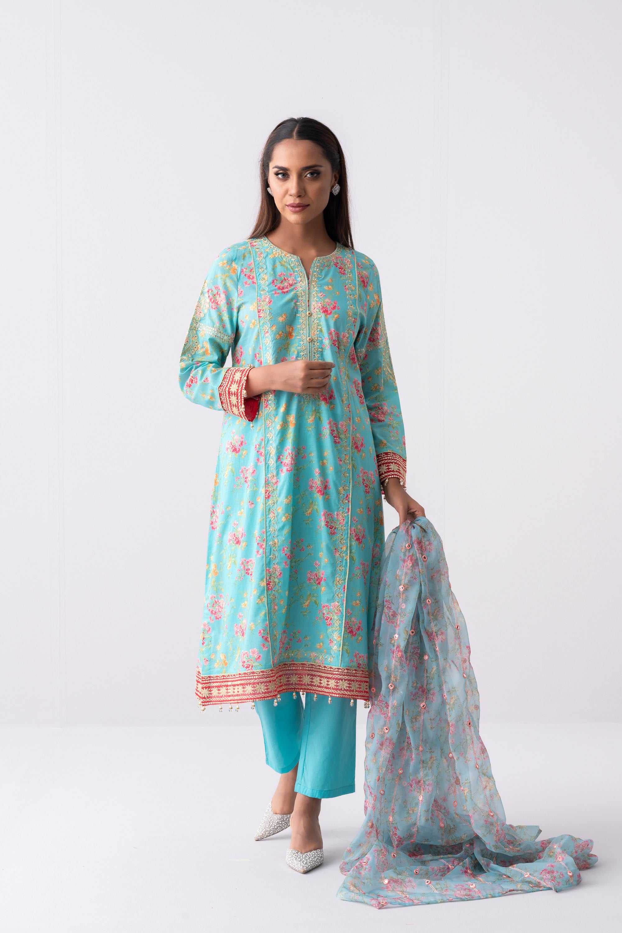 Elevate your elegance with our stunning ready-to-wear 3 Piece Lawn Salwar Kameez Suit, featuring full lurex sequin embroidery on the front and sleeves, complemented by a contrast organza border with lurex embroidery at the sleeves and bottom hem. Adorned with decorative buttons, gold lace and beaded tassels for an extra touch of sophistication, the look is completed with a matching printed organza dupatta embellished with embroidery and delicate dollar work, paired with a solid dyed smart pant—offering the perfect blend of luxury and charm, ideal for special occasions or elevating your everyday wardrobe.