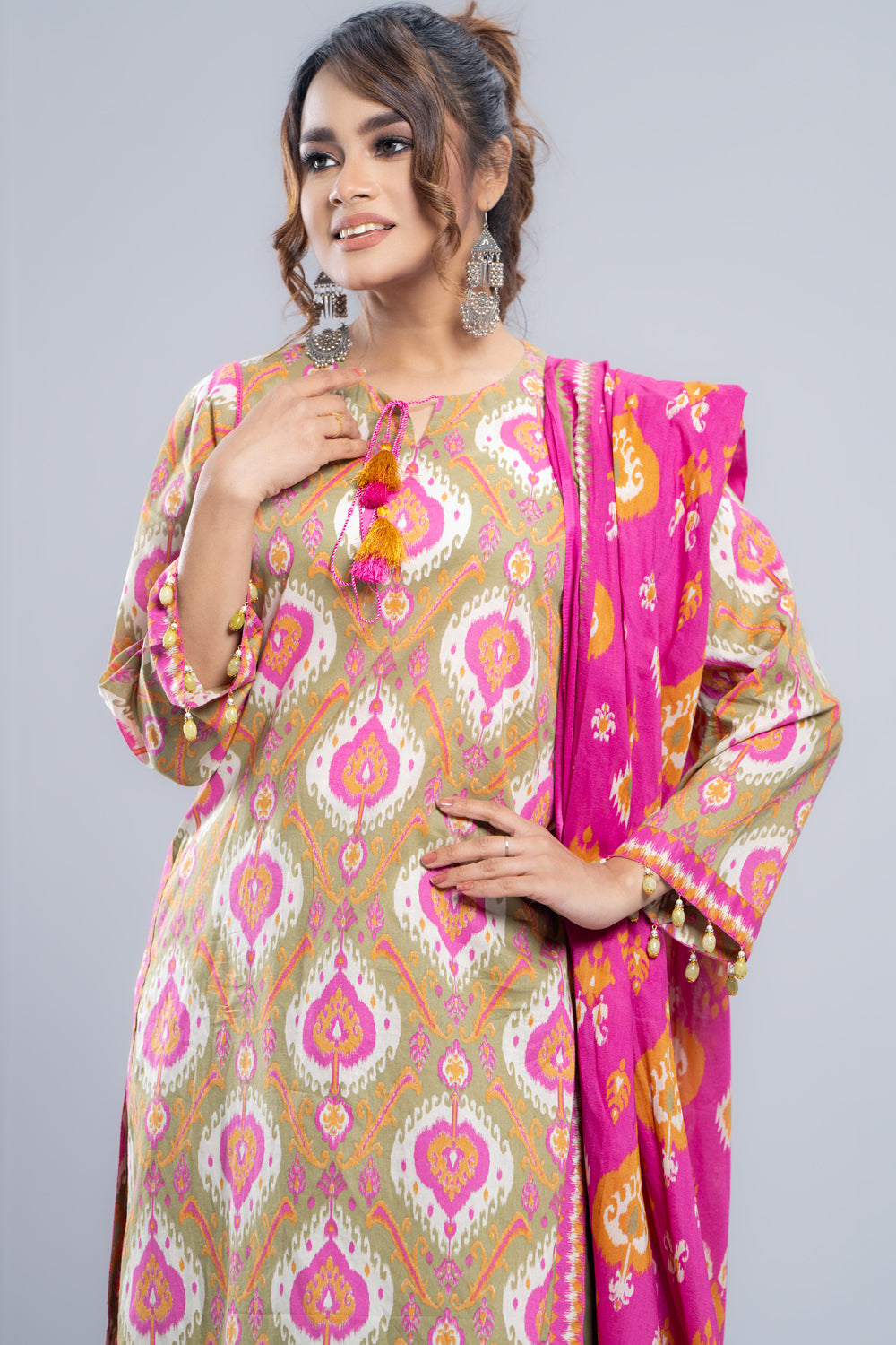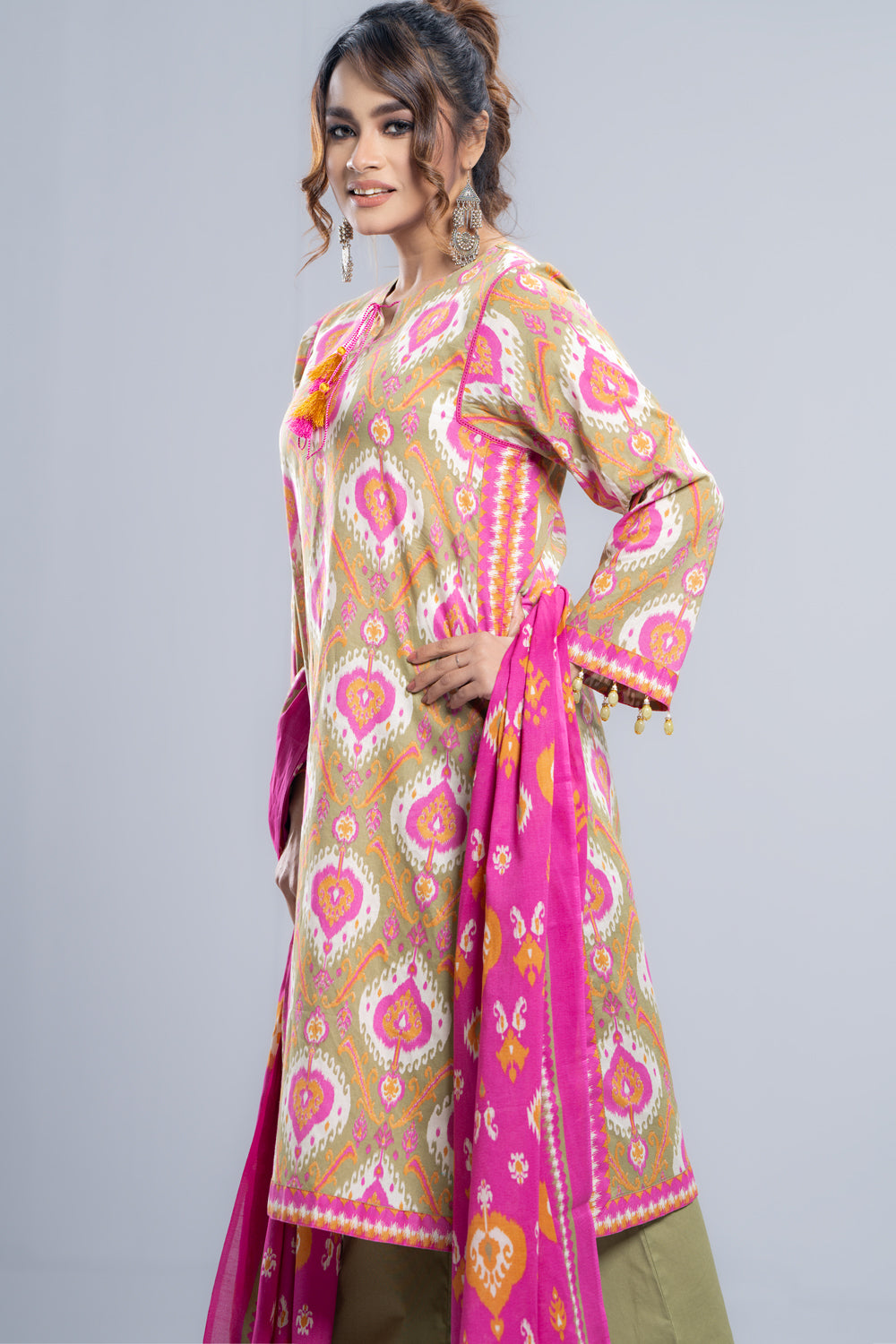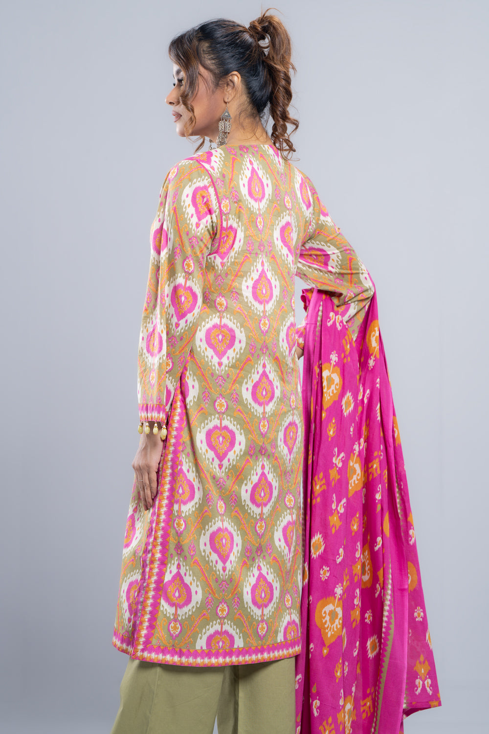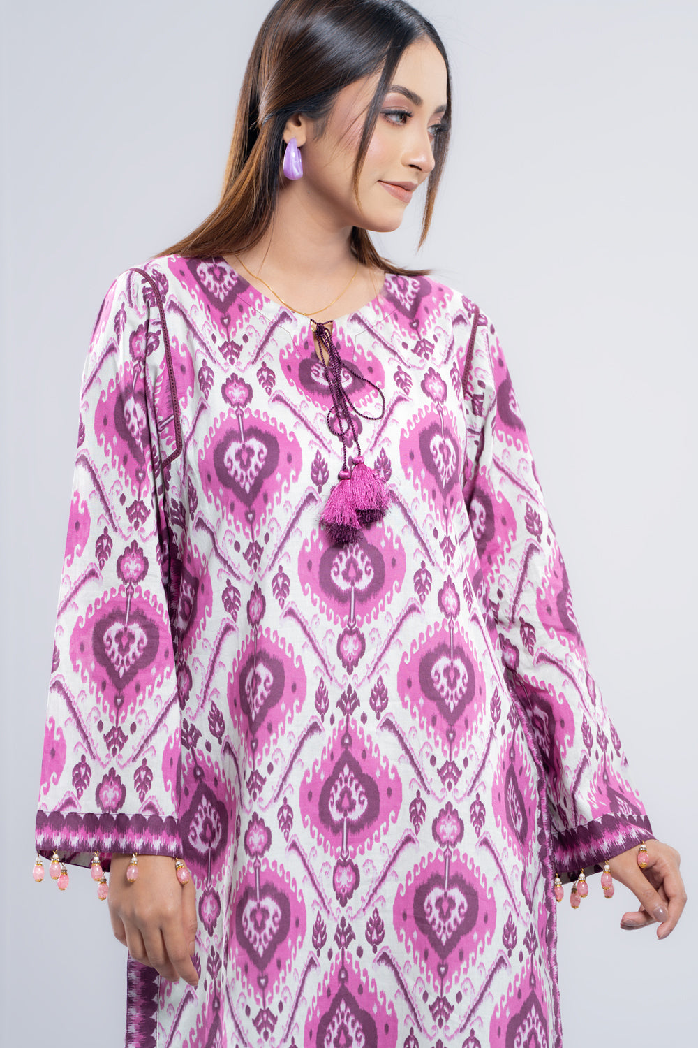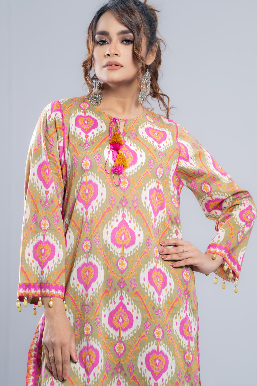 Elevate your elegance with our stunning ready-to-wear 3 Piece Lawn Salwar Kameez Suit with cotton dupatta and solid dyed trouser embellished with decorative beads & tassel detailing that exudes elegance and sophistication,perfect for special occasions or adds luxury to your everyday wardrobe.
