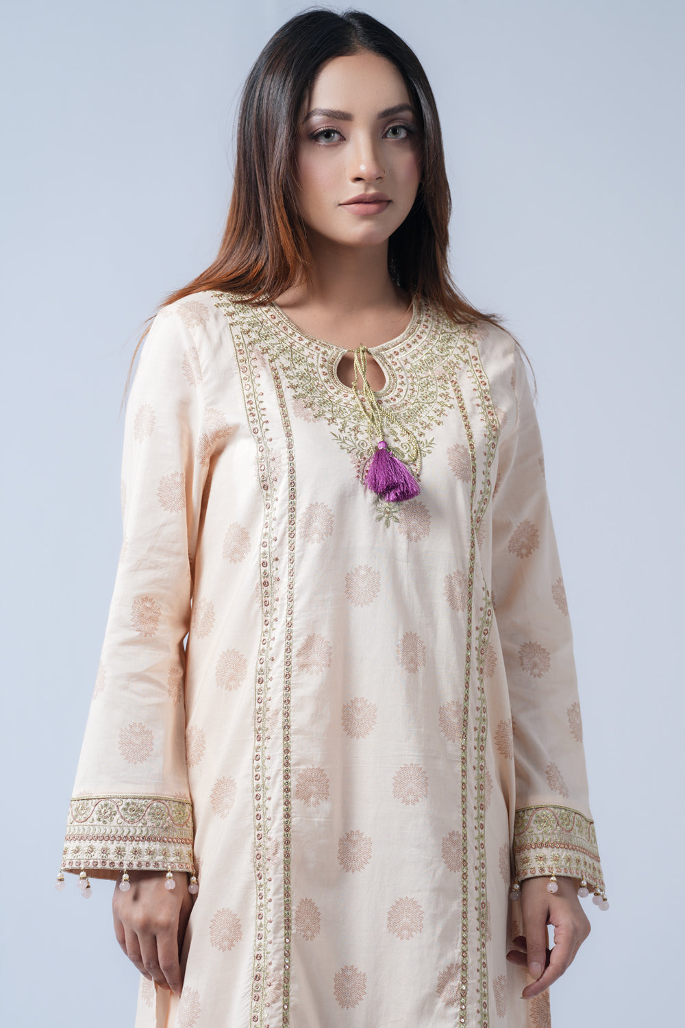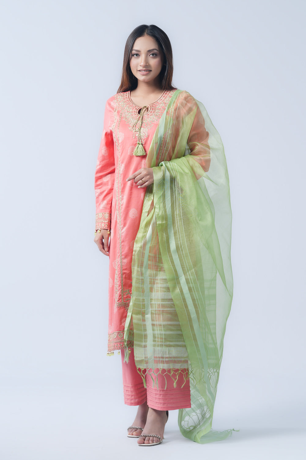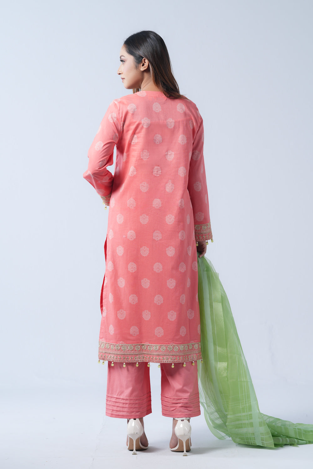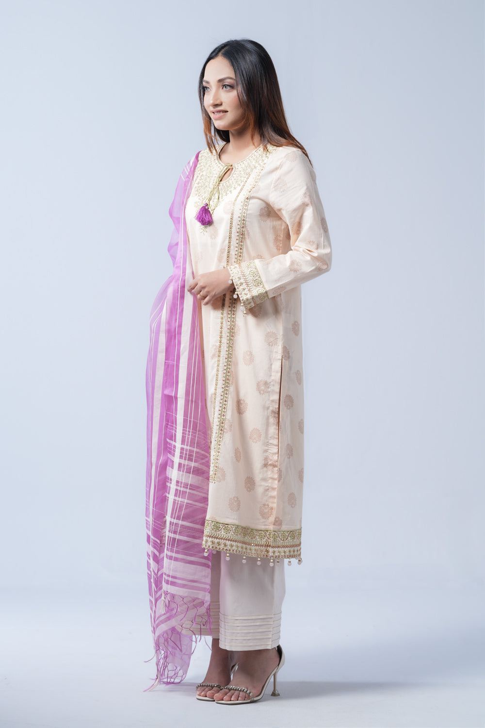 Elevate your elegance with our stunning ready-to-wear 3-piece lawn salwar kameez suit, which features intricate full lurex embroidery on premium lawn fabric and is enhanced with gold lace, decorative tassels, a keyhole, and decorative bead detailing for a refined touch. Paired with a luxurious handloom yarn dyed Muslin silk dupatta and solid-dyed trousers, this ensemble exudes sophistication—perfect for special occasions or effortlessly elevating your everyday wardrobe.