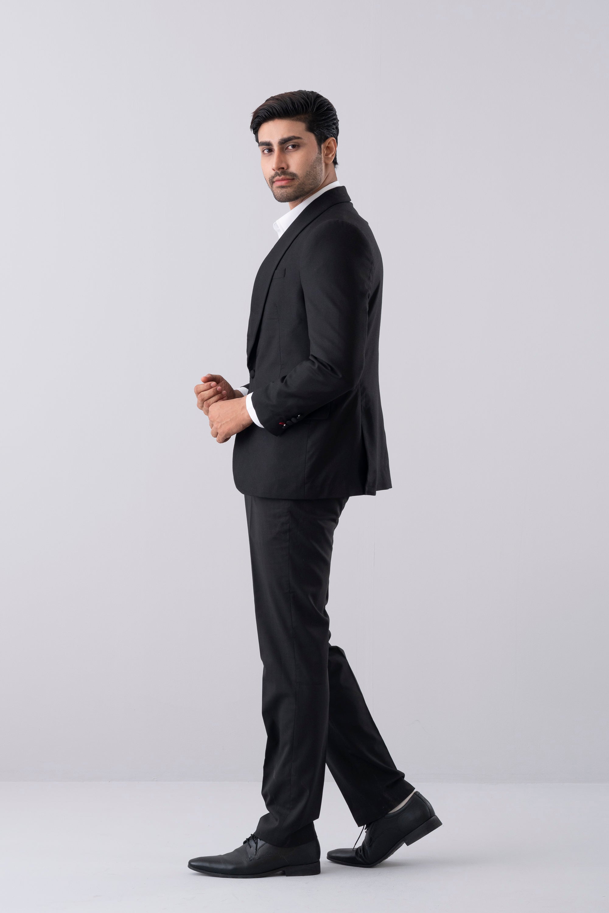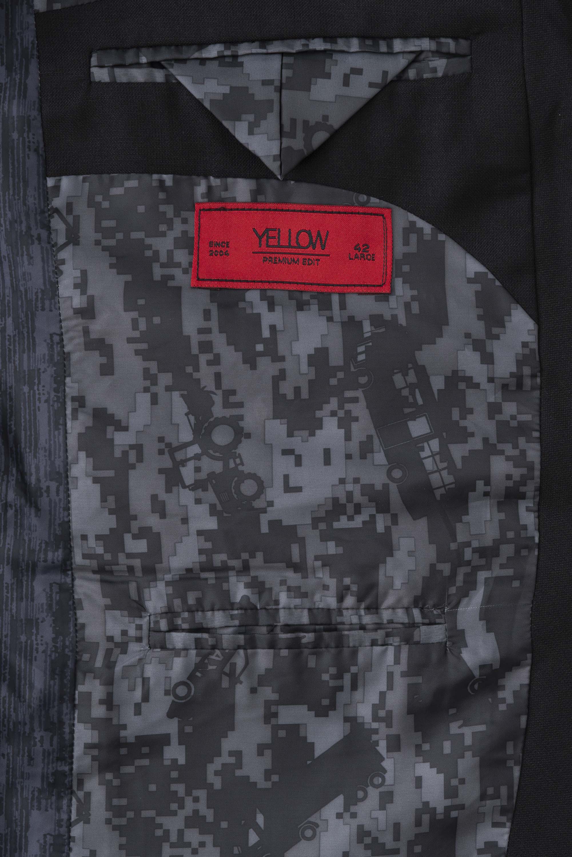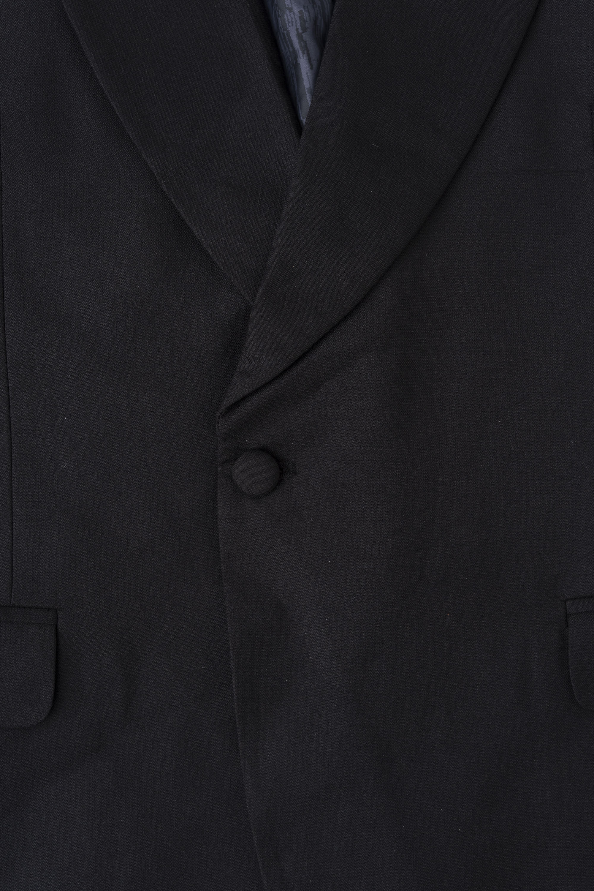 Tailored from premium dobby fabric, this regular-fit blazer features a structured silhouette and a sleek shawl collar for a sophisticated look. Two side vents ensure comfort and ease of movement, while the contrast interior lining, fabric-covered buttons, and contrast buttonhole detailing add understated luxury perfect for evening events and formal occasions.