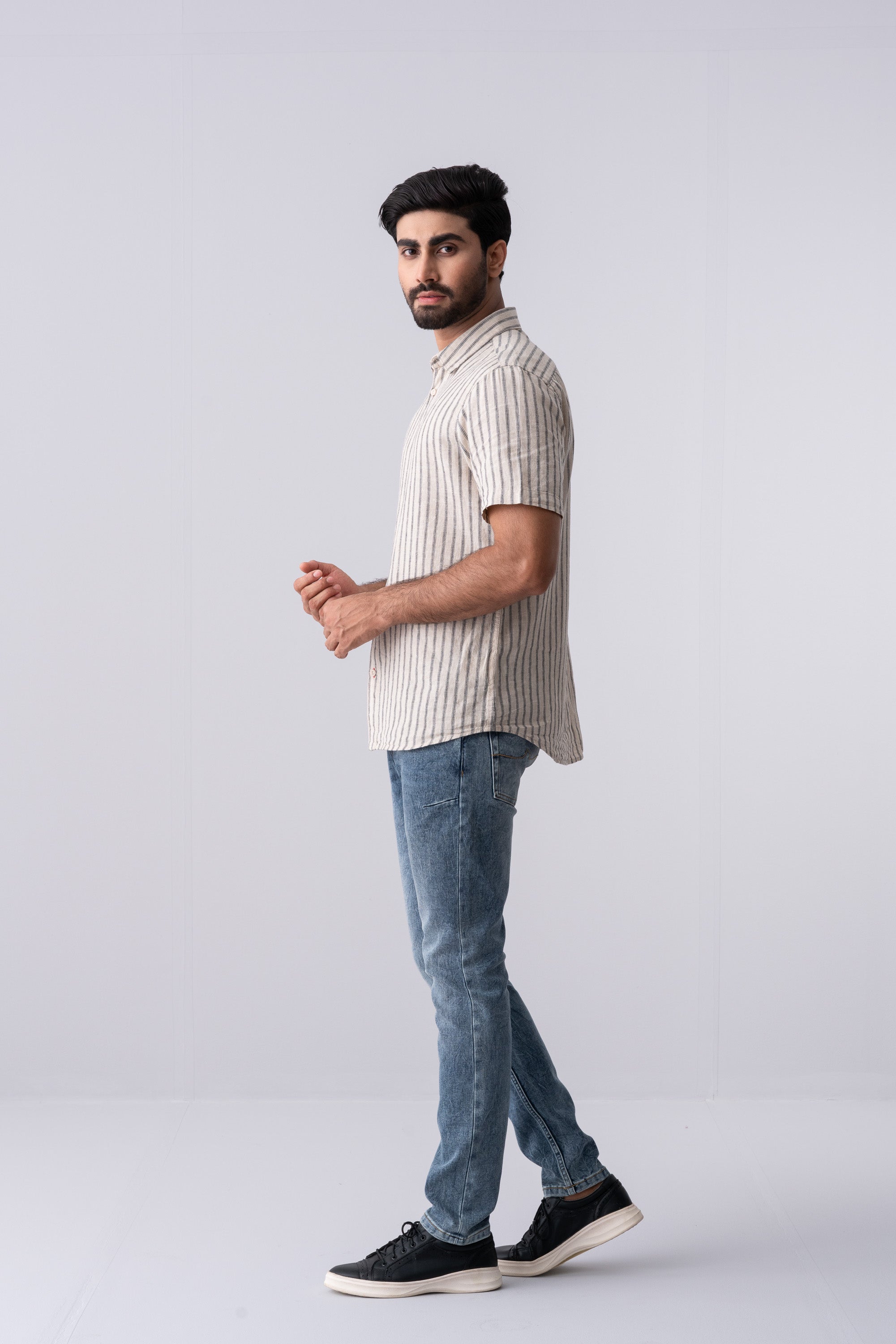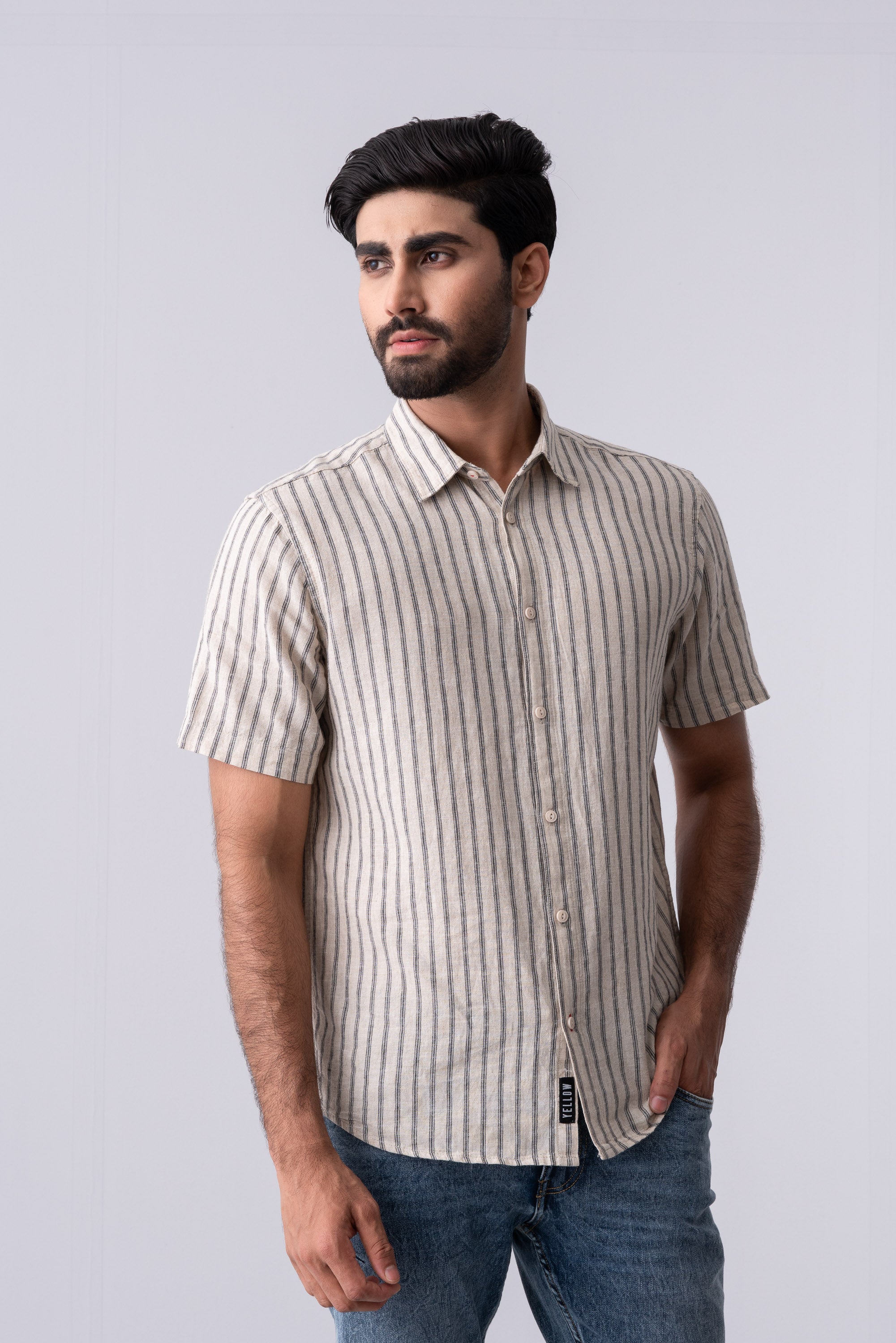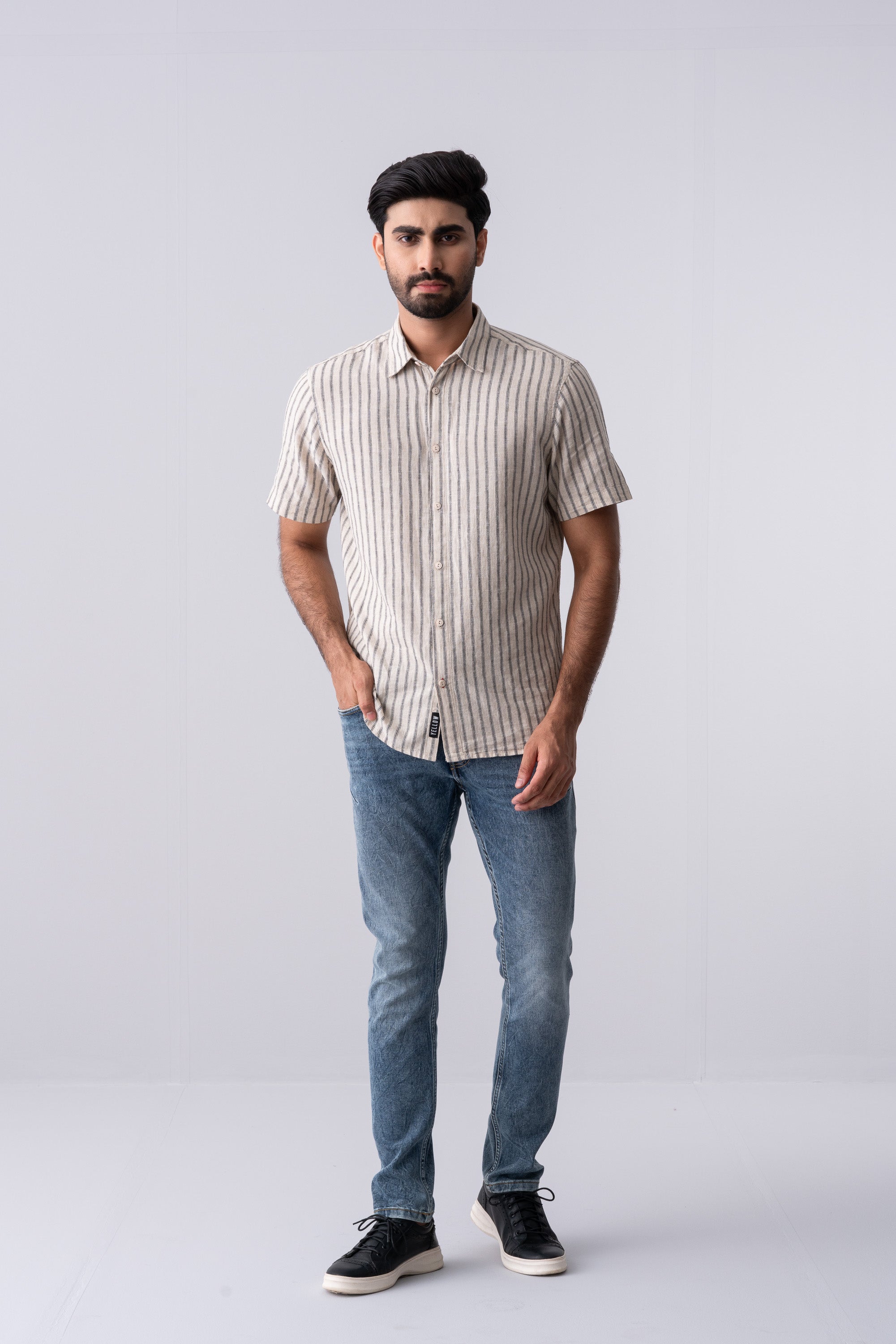 Refresh your wardrobe with this short sleeve regular stripe shirt, a perfect balance of timeless design and modern detailing. Featuring a classic striped pattern, this shirt offers a sleek and versatile look, ideal for both casual and smart-casual occasions. The decorative loop with button on the back adds a unique touch, elevating the style with subtle sophistication. Crafted from soft, breathable fabric, it ensures maximum comfort throughout the day.