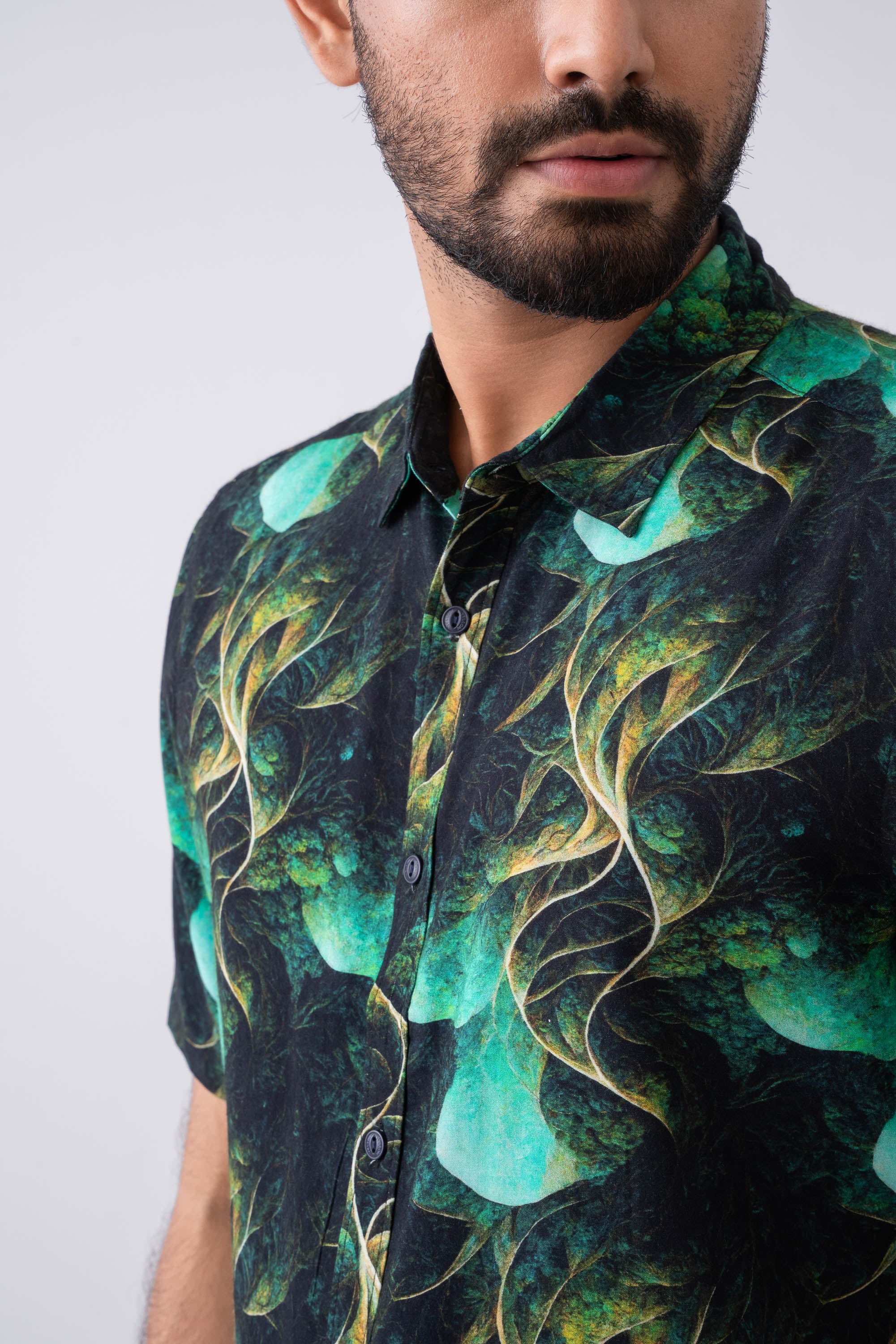 Stand out in style with this slim fit short sleeve shirt, featuring a bold abstract-inspired digital print for a modern, artistic edge. Crafted from lightweight, breathable fabric, it offers a tailored silhouette that flatters the form without sacrificing comfort. The digitally printed design delivers crisp detail and vibrant color, making it a go-to piece for casual outings, summer evenings, or elevated everyday wear. Pair it with tailored shorts or slim jeans for a sharp, effortless look.