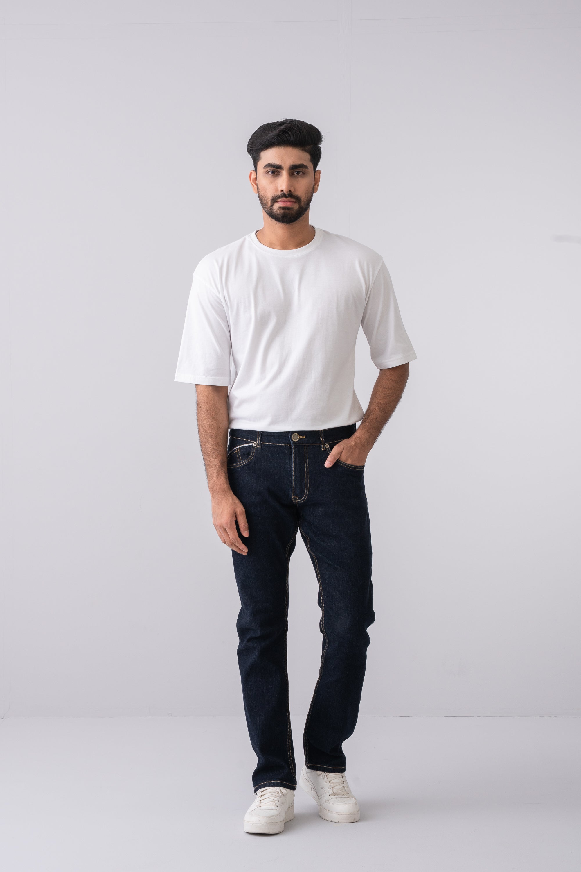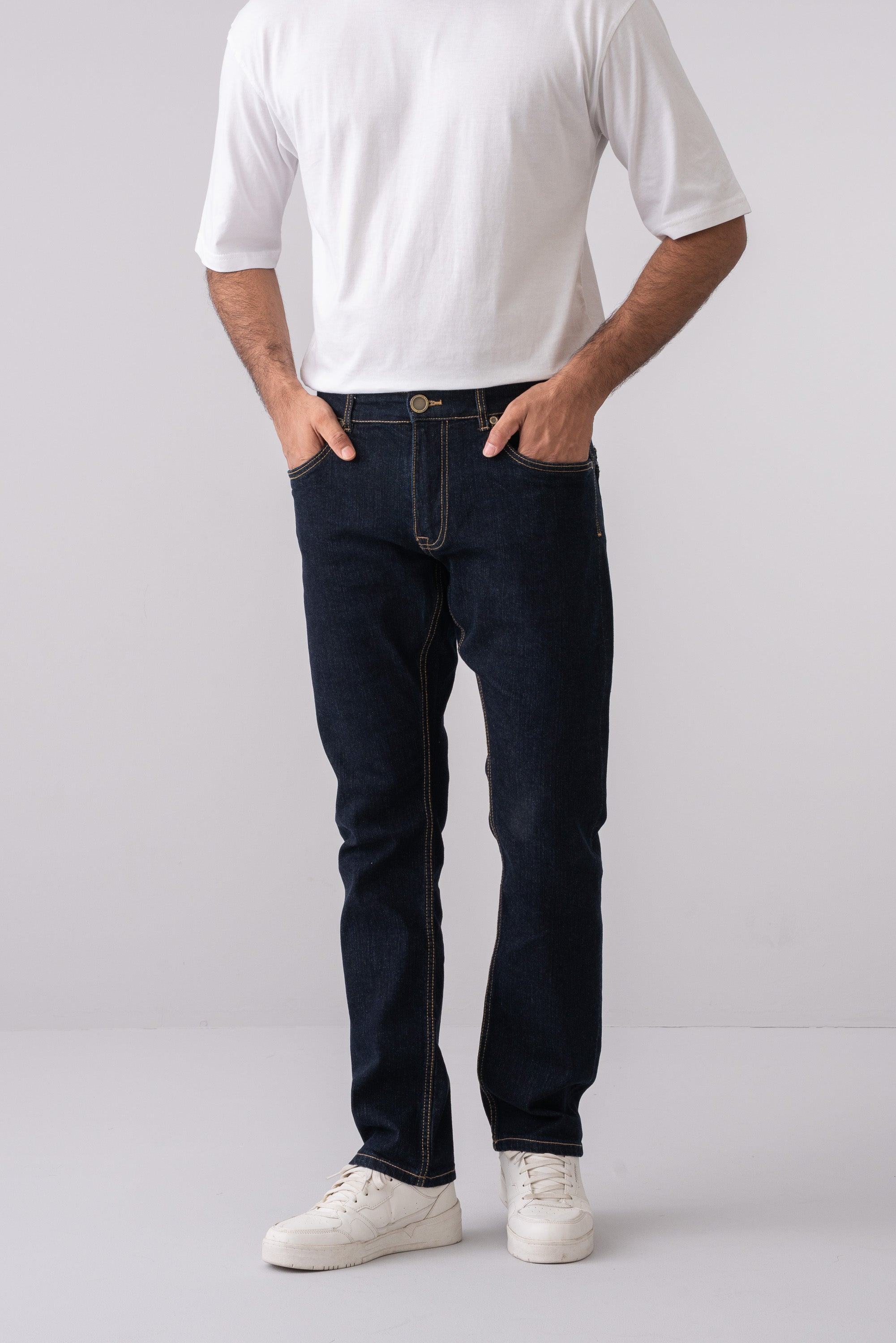 Navy selvedge fabric with coin pocket gives these stretch jeans a smart twist.This garments made with special fabric made from yarn that gives the customer super comfy wearing experiences. Belt loops,Zip fly & button fastening with YELLOW branded Buttons. Brand Signature at back pocket. Straight fit with Extra-soft to the touch, excellent stretch and recovery to the body yet are still easy to wear.