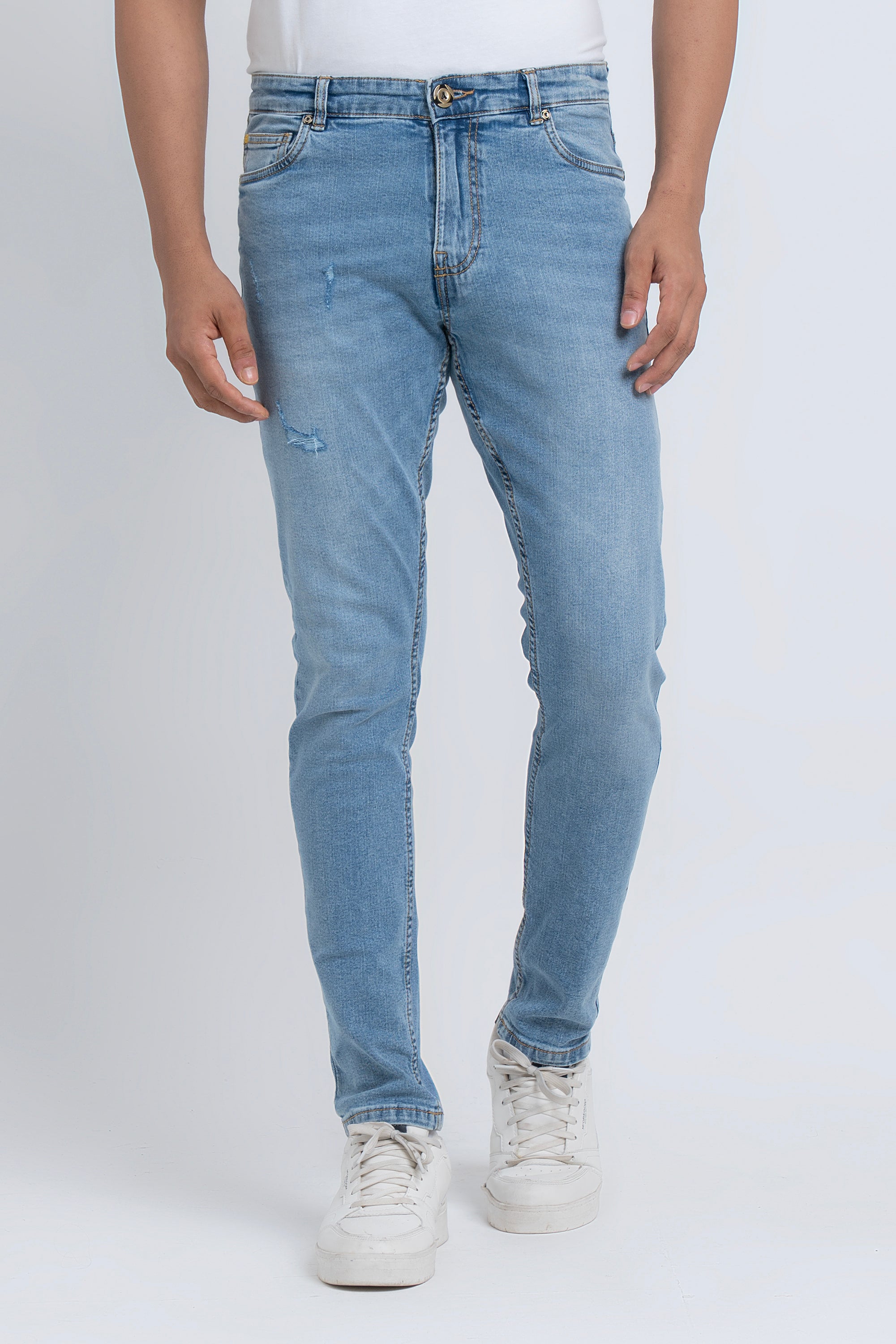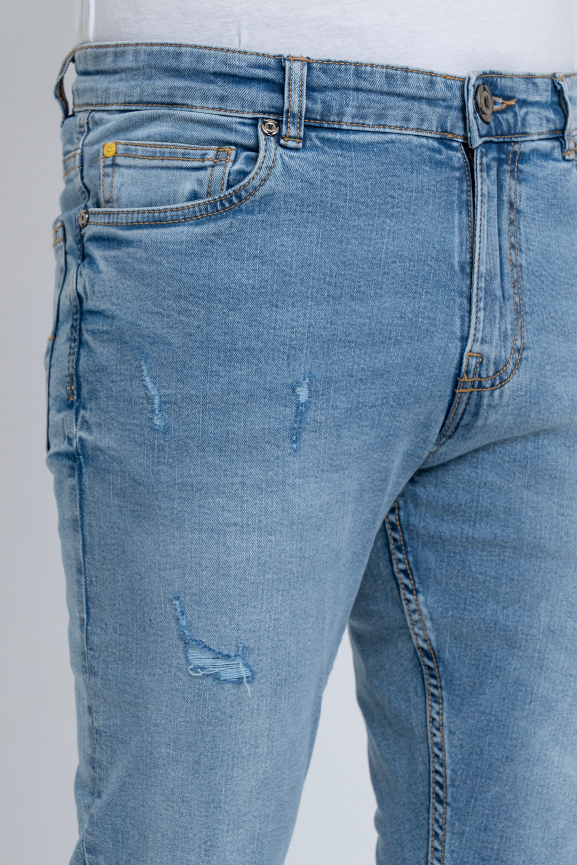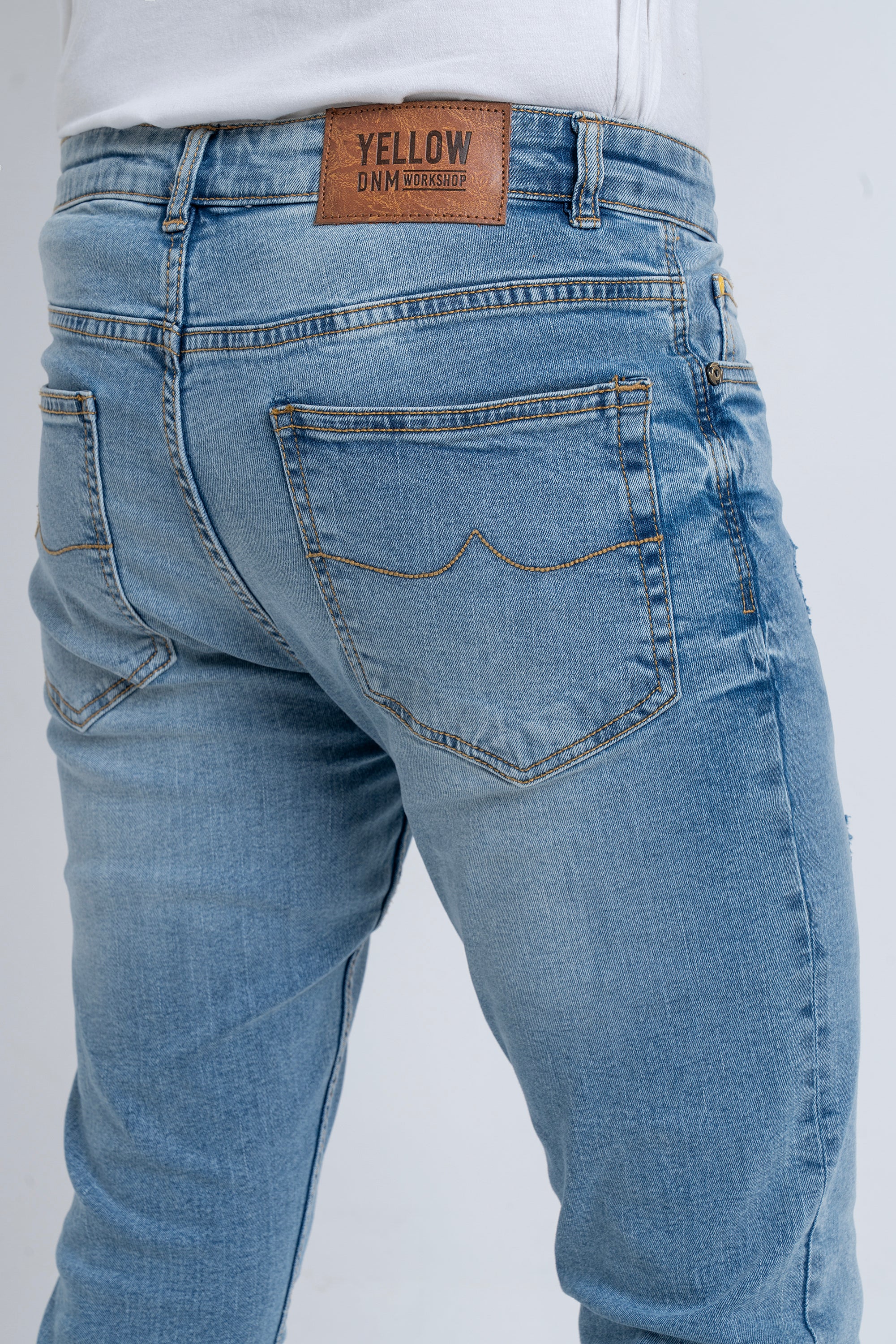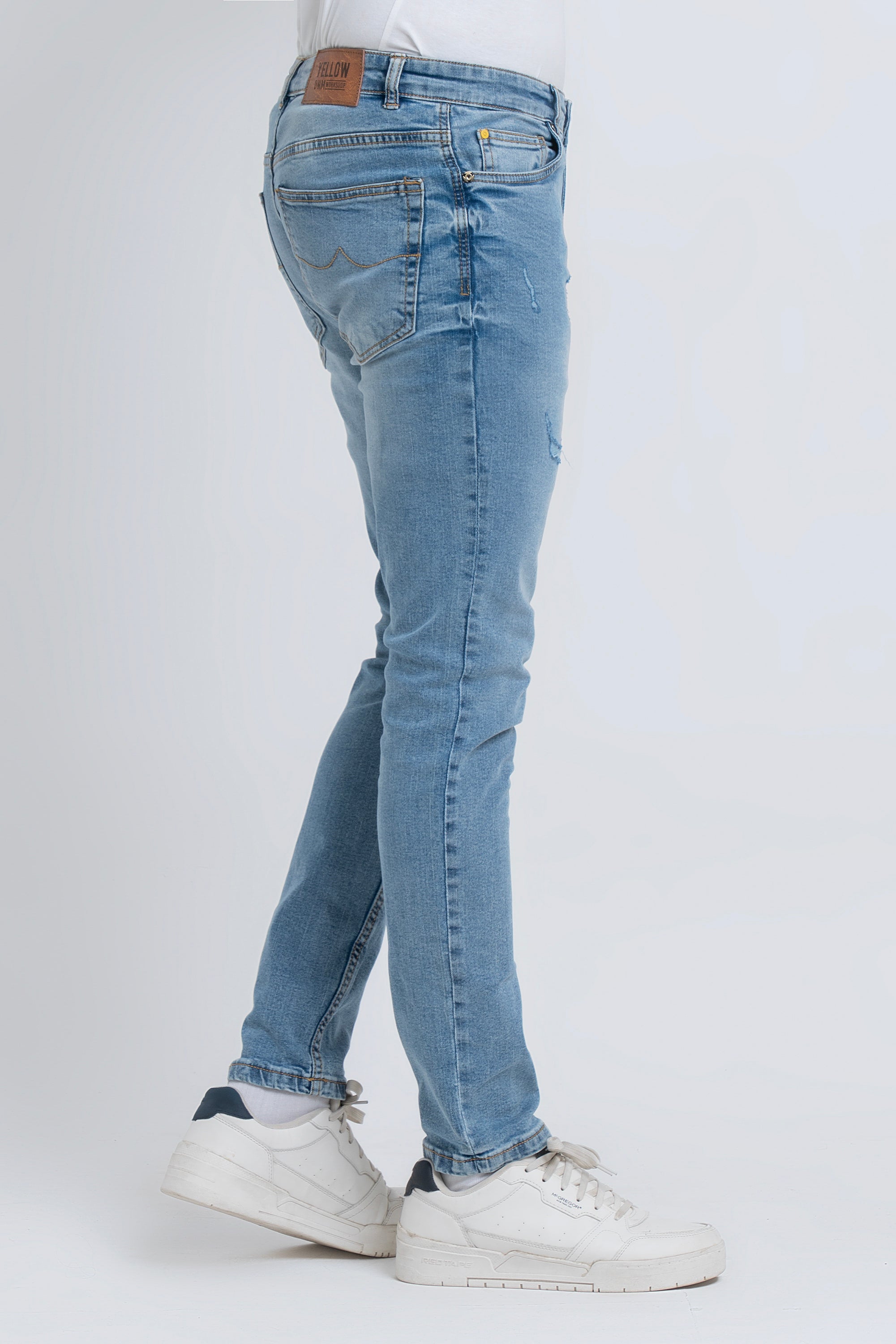 Blue fabric with coin pocket detailing gives these stretch jeans a smart twist.This garments made with special fabric made from yarn that gives the customer super comfy wearing experiences. Belt loops,Zip fly & button fastening with YELLOW branded Buttons Signature embroidery at waist inside, brand Signature at back pocket. Tapered fit with Extra-soft to the touch, excellent stretch and recovery to the body yet are still easy to wear.