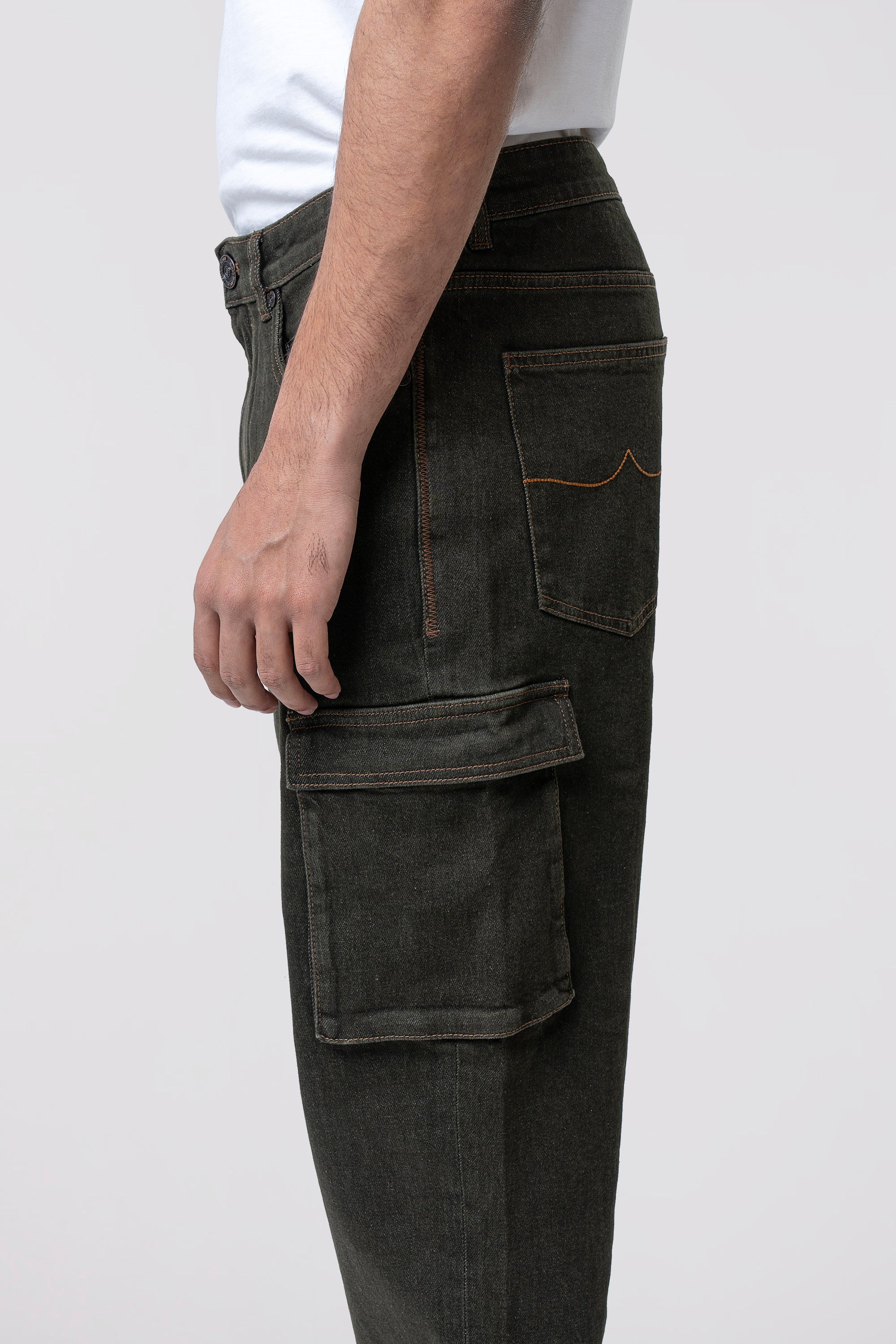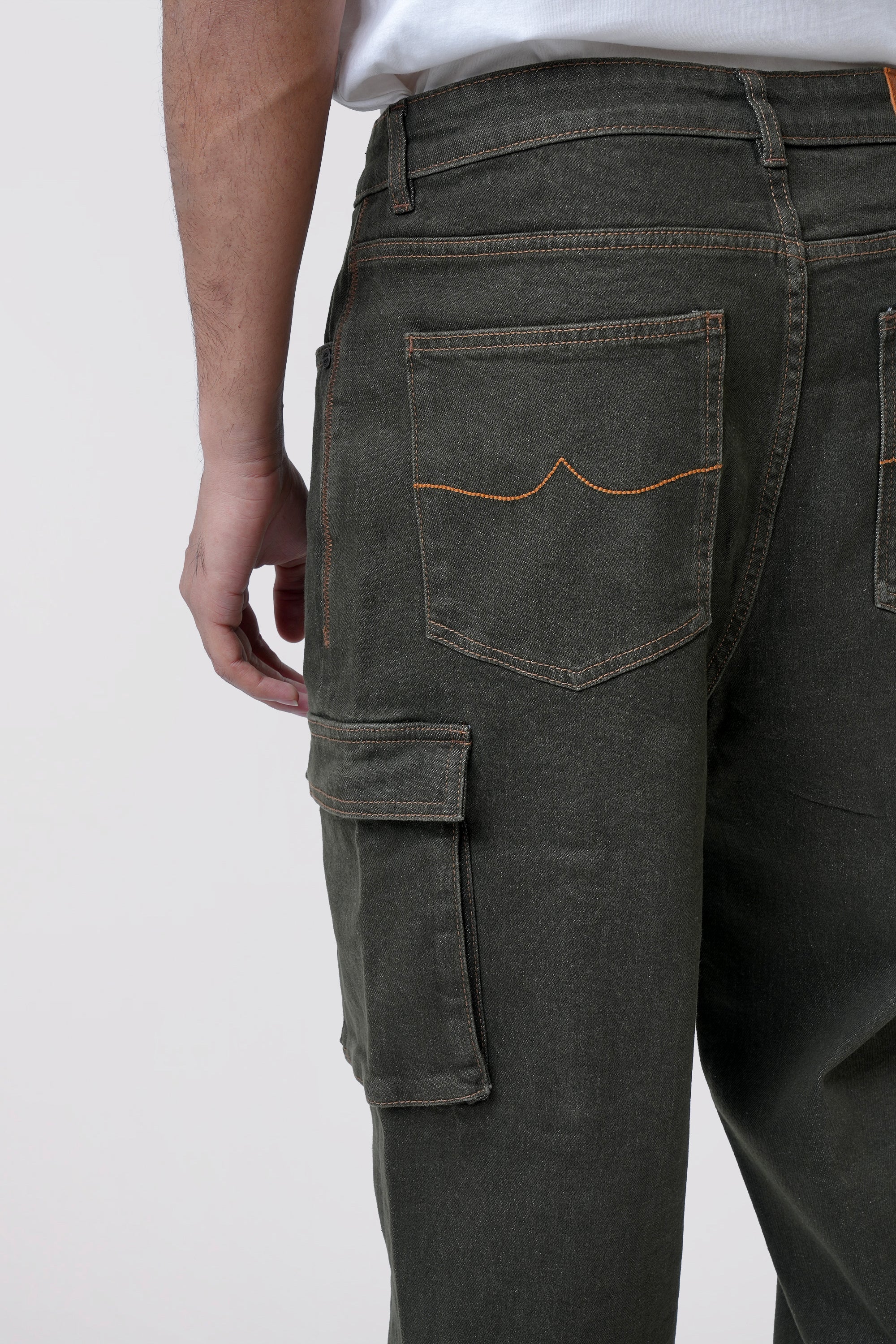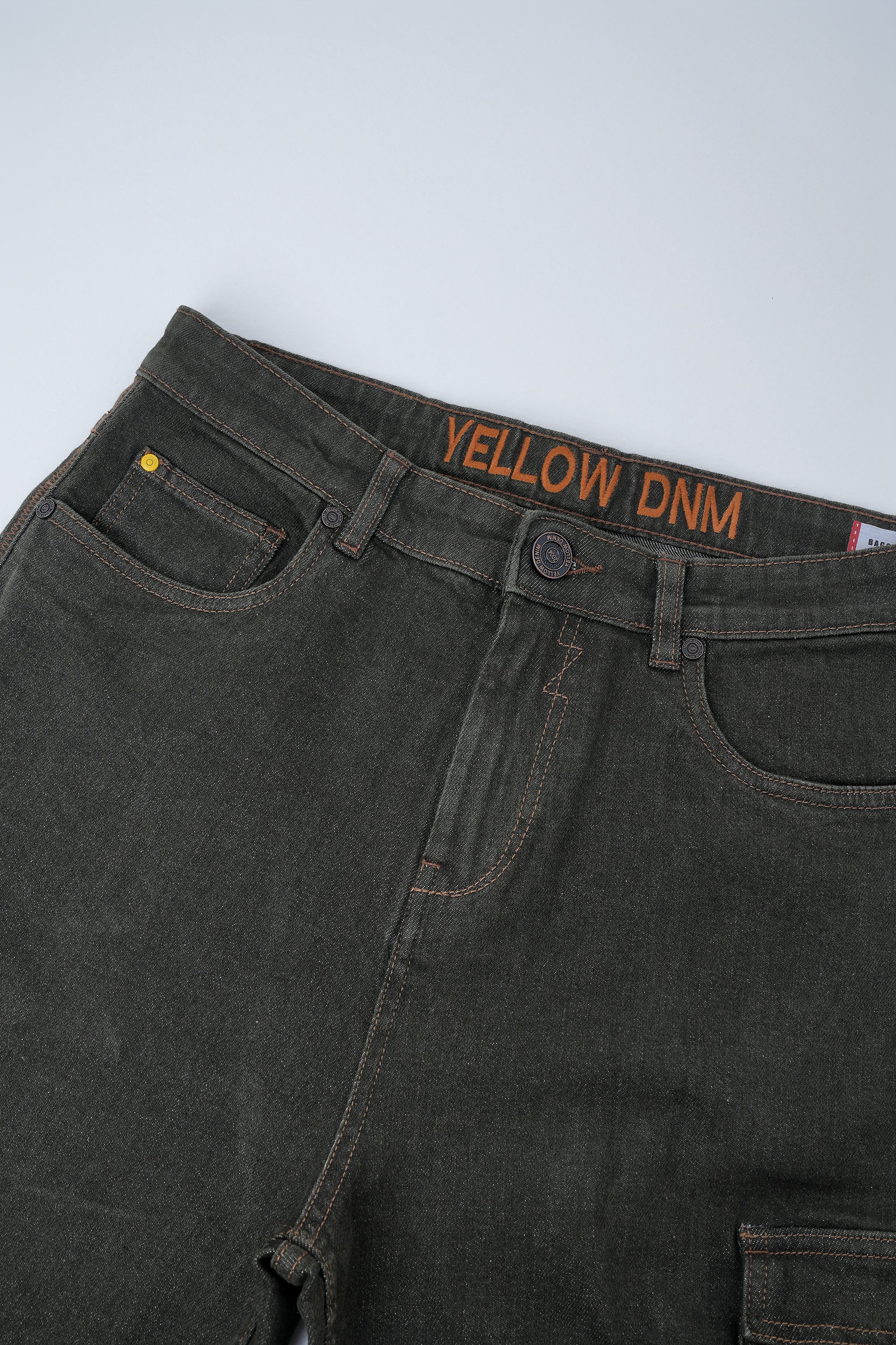 Green fabric with cargo pocket gives these jeans a smart twist. This garments made with special fabric made from yarn that gives the customer super comfy wearing experiences. Belt loops,Zip fly & button fastening with YELLOW branded Buttons Signature embroidery at waist inside, brand Signature at back pocket Baggy fit with Extra-soft to the touch.