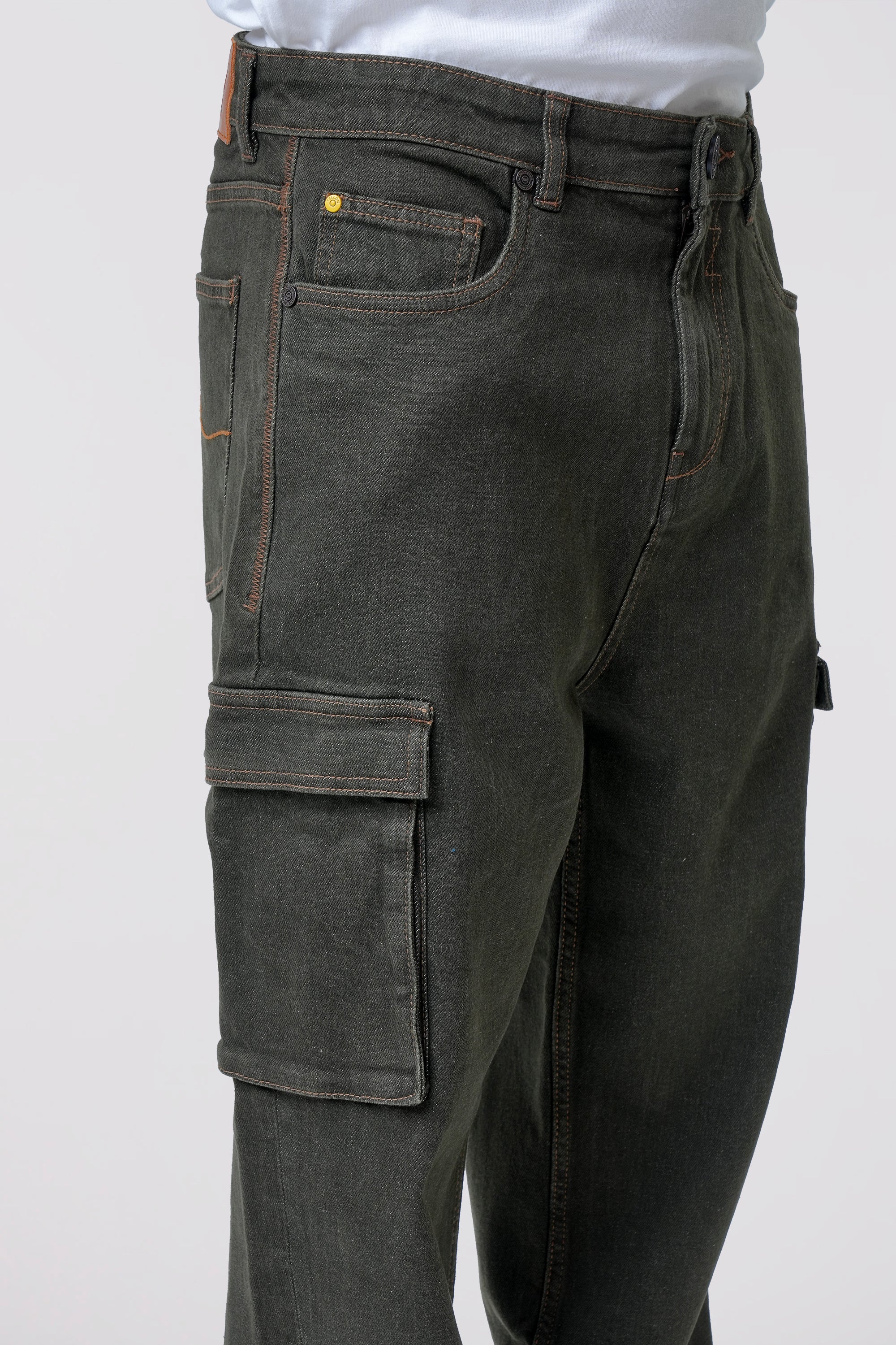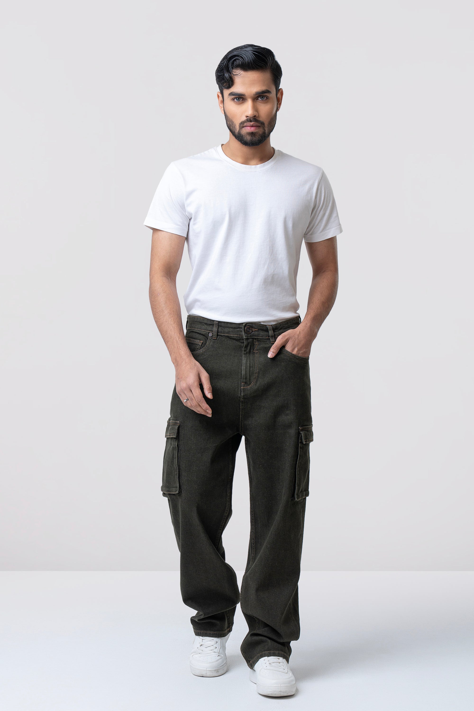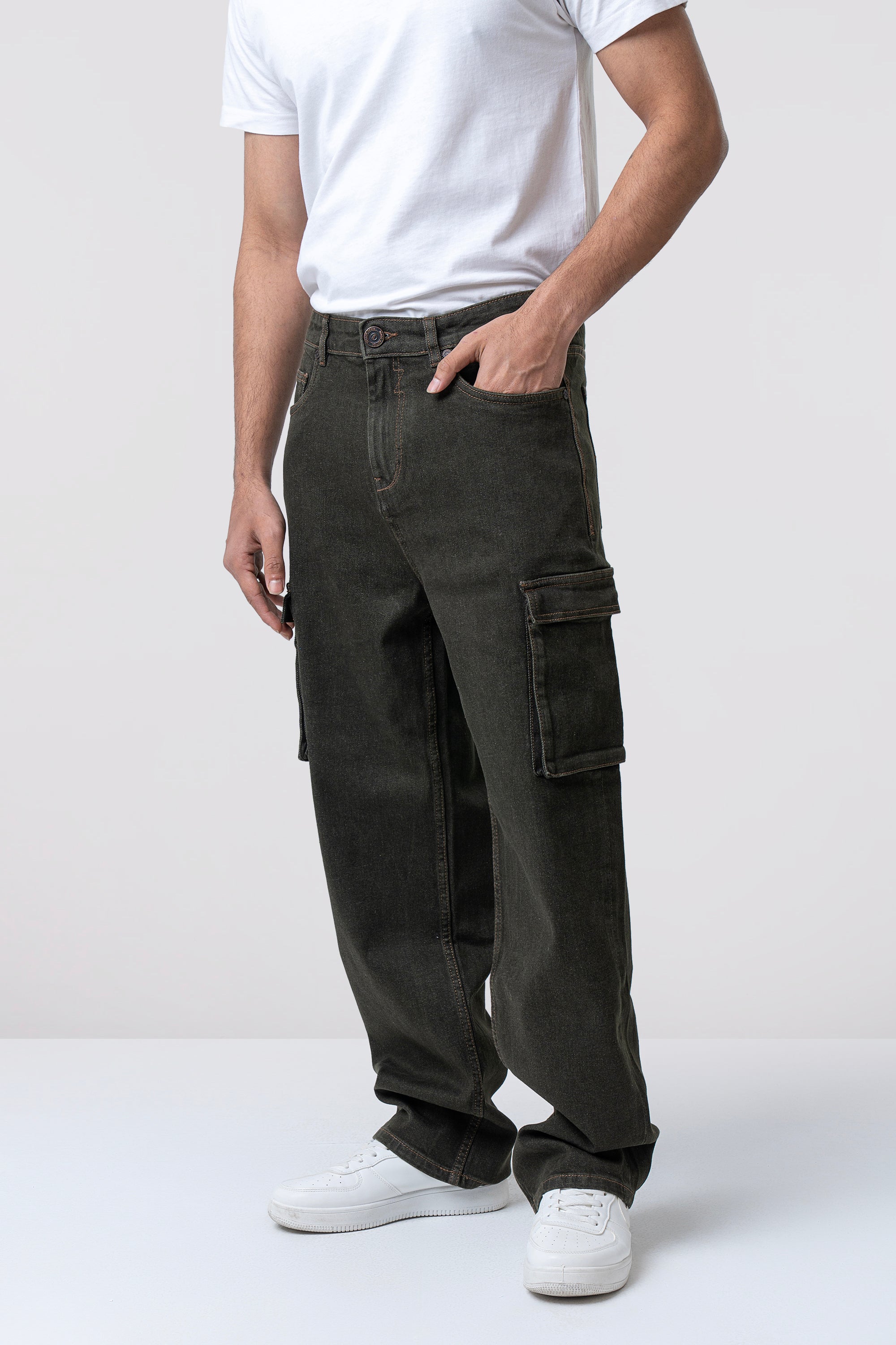 Green fabric with cargo pocket gives these jeans a smart twist. This garments made with special fabric made from yarn that gives the customer super comfy wearing experiences. Belt loops,Zip fly & button fastening with YELLOW branded Buttons Signature embroidery at waist inside, brand Signature at back pocket Baggy fit with Extra-soft to the touch.