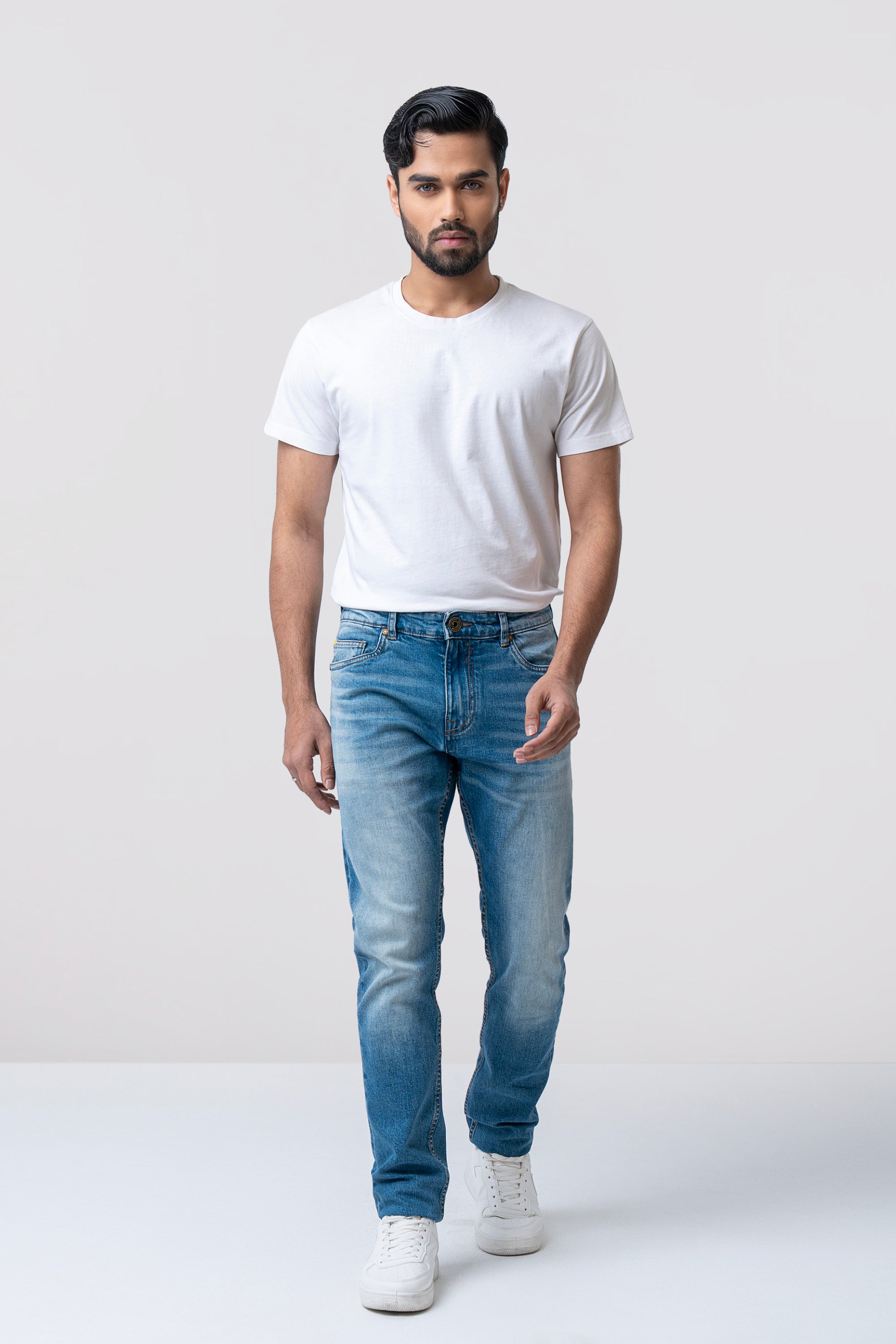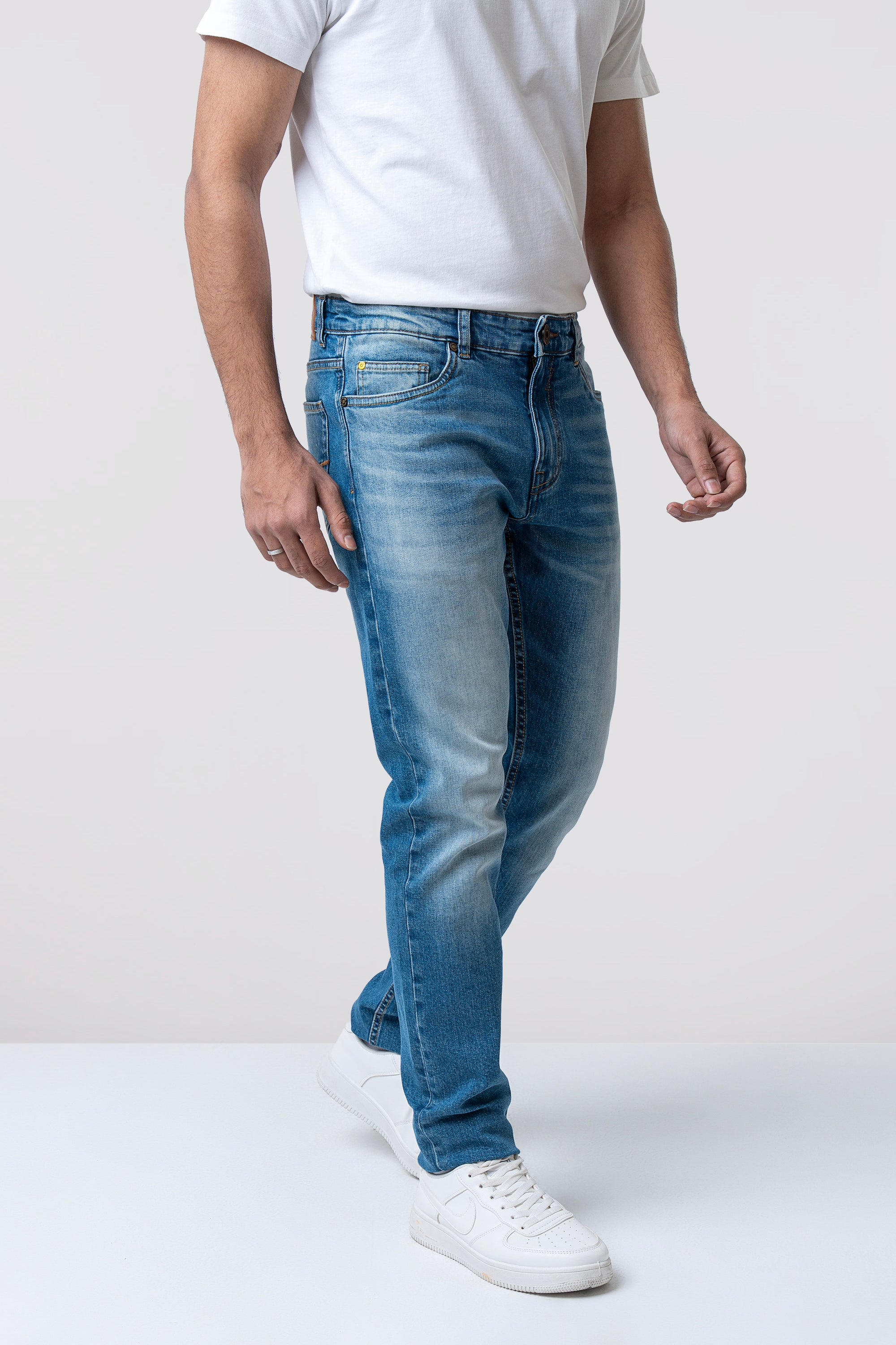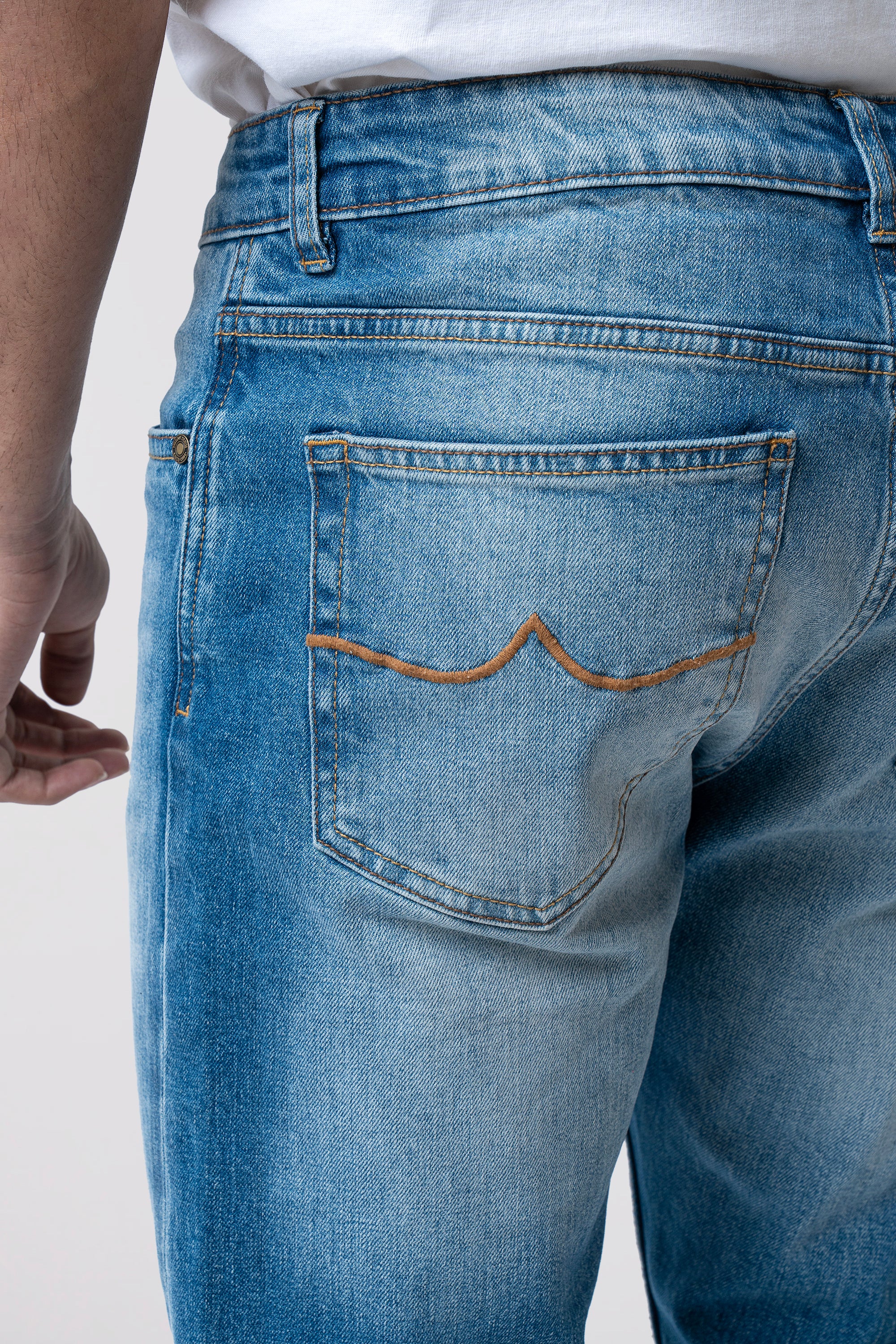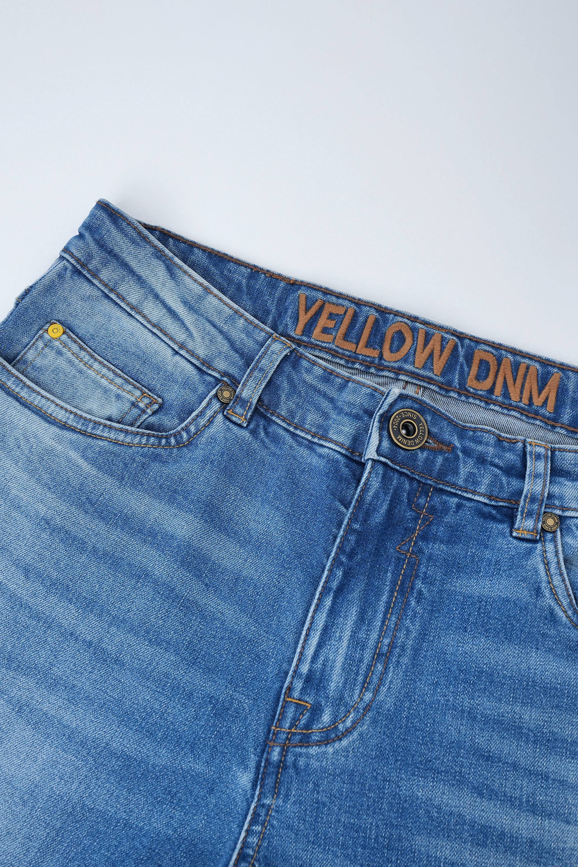 Indigo fabric with coin pocket detailing and whiskering gives these stretch jeans a smart twist. This garments made with special fabric made from yarn that gives the customer super comfy wearing experiences. Belt loops, Zip fly & button fastening with YELLOW branded Buttons Signature embroidery at waist inside, brand Signature at back pocket.