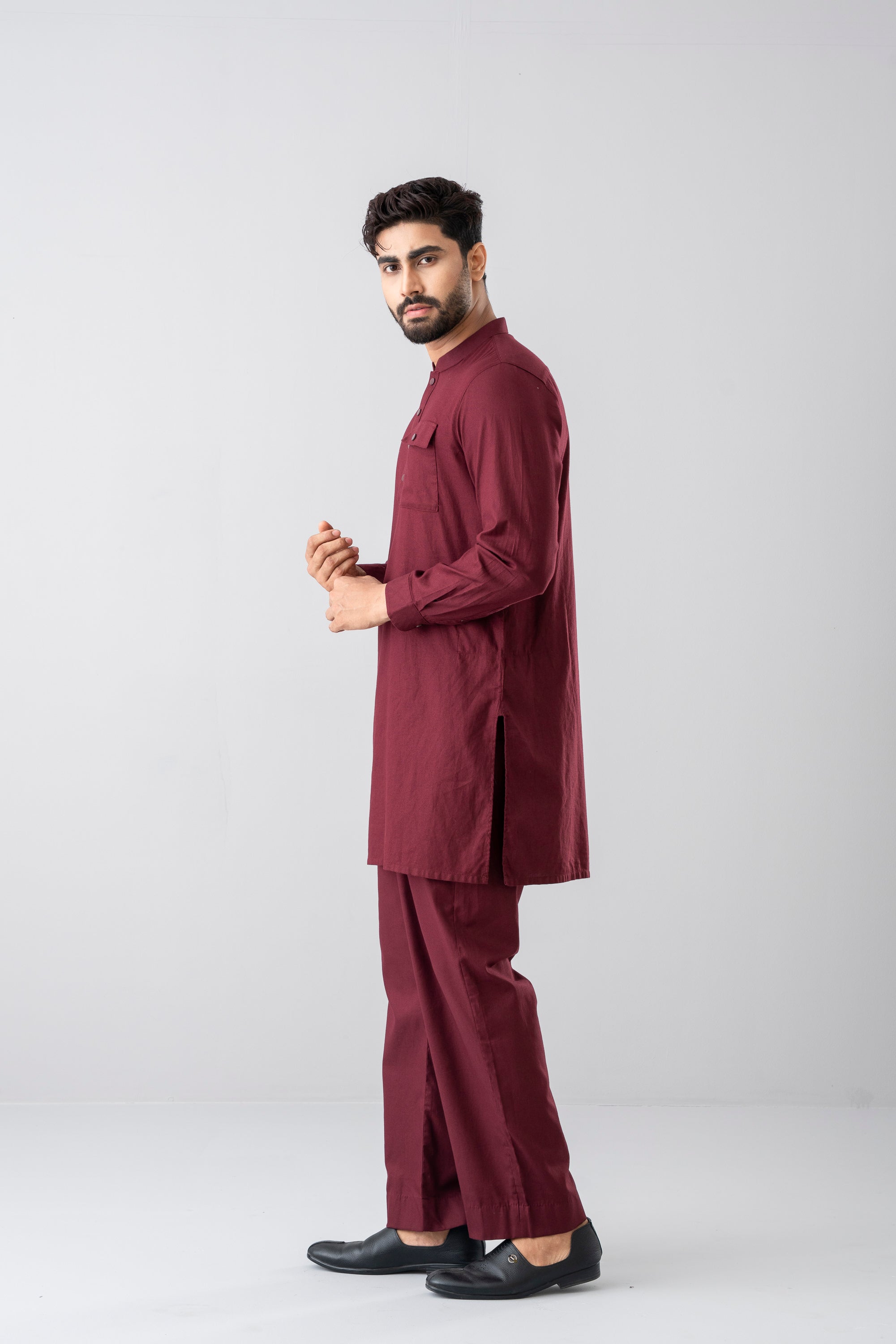 This regular-fit Kabli set features a shalwar and a beautifully crafted pocket atchest. Made from breathable premium blended fabric includes matching snap buttons for a refined finish. Perfect for a timeless and elegant look