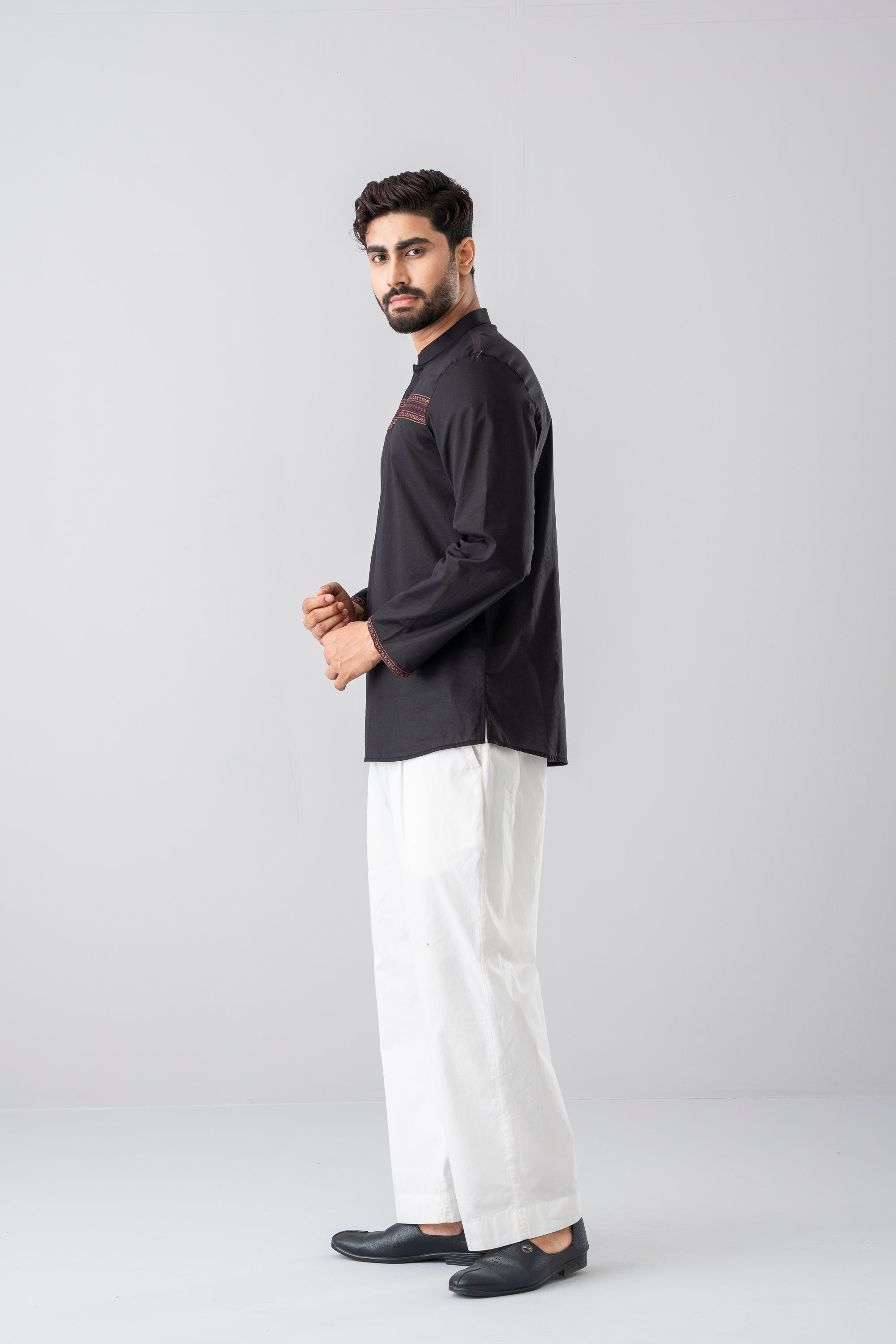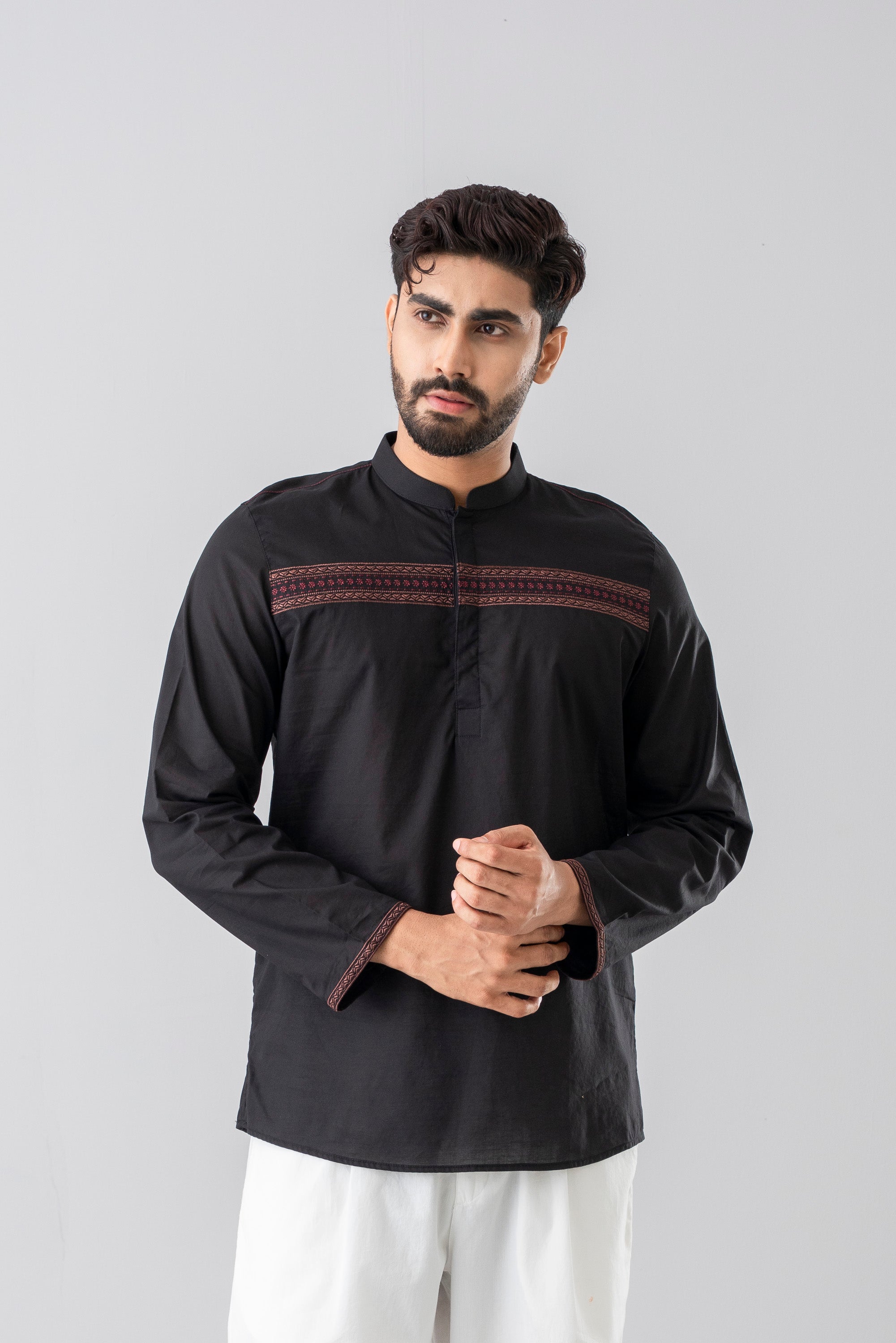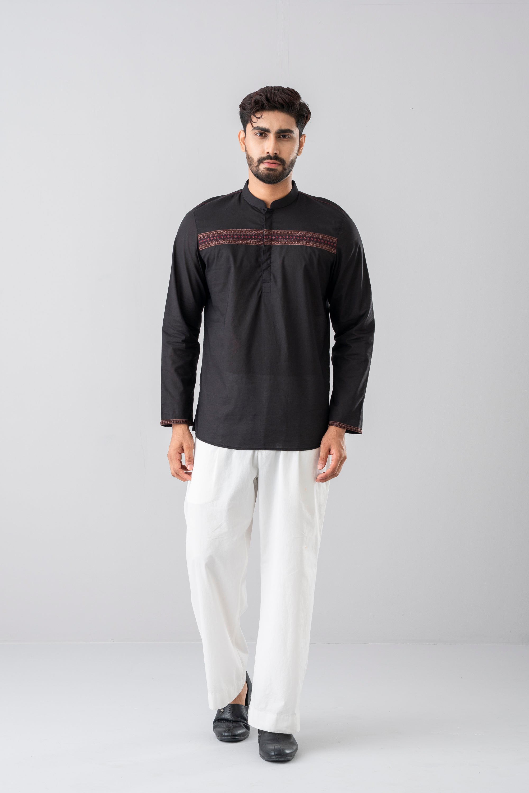 This regular fit Fatua is made from 100% cotton, offering a comfortable feel with a modern, stylish look. This style is decorated with chest and sleeve hem embroidery and hidden pocket detailing. Perfect for casual or daily wear, it's a great choice for everyday style with elegant outlook.