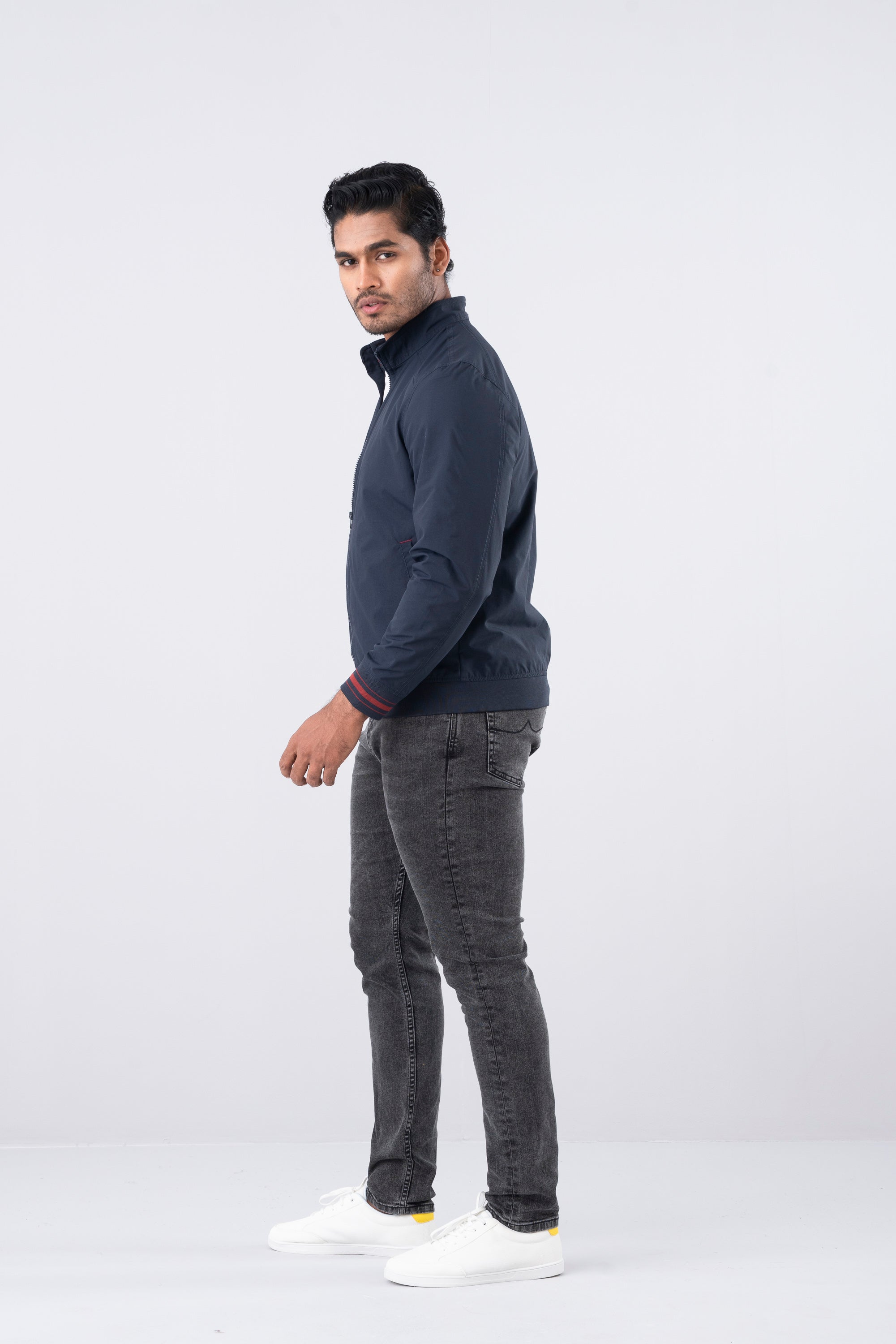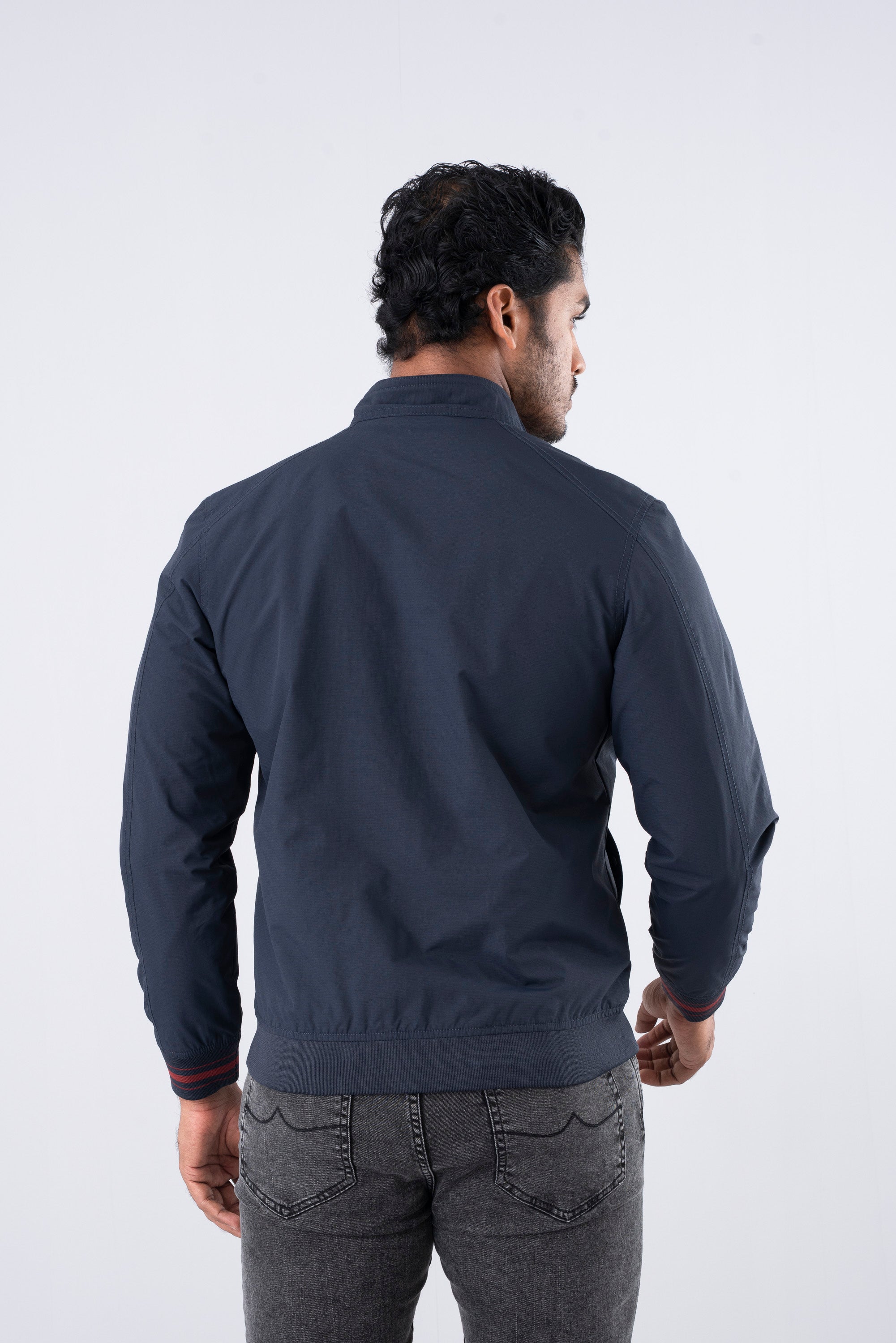 The Men’s Bomber Jacket is crafted from dense polyester fabric that offers durability and a sleek finish. Designed with a high neck and ribbed collar, hem, and cuffs for a snug fit, it features a Vislon zipper fastening and snap button details, giving it a modern yet timeless appeal.