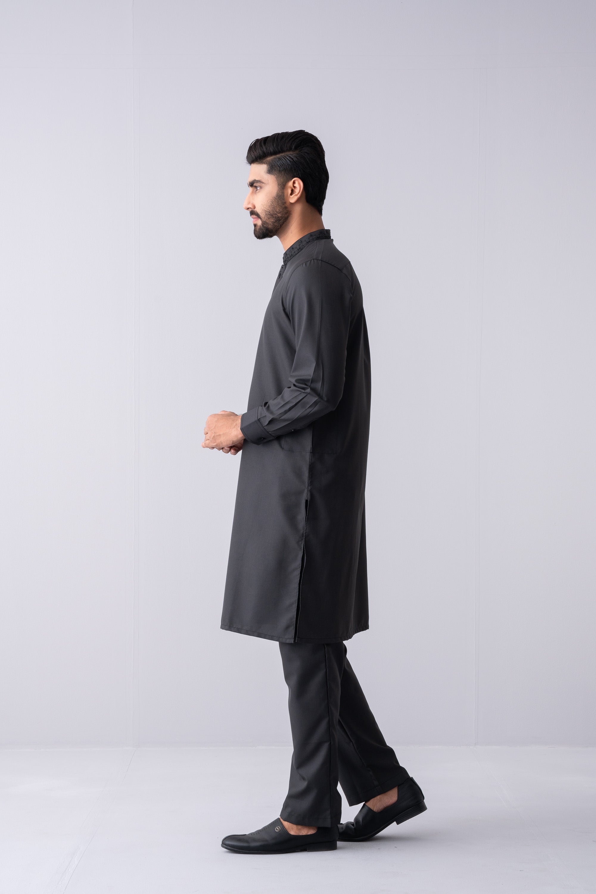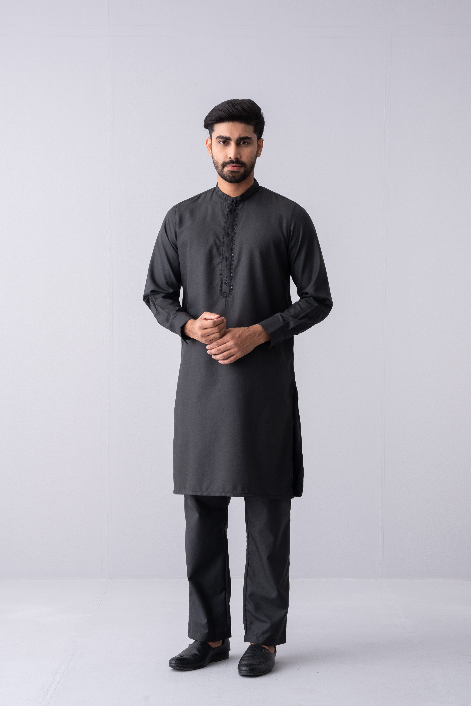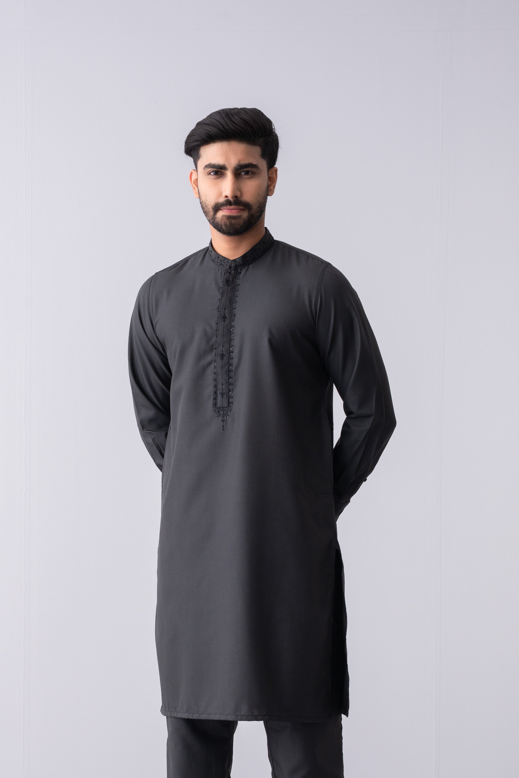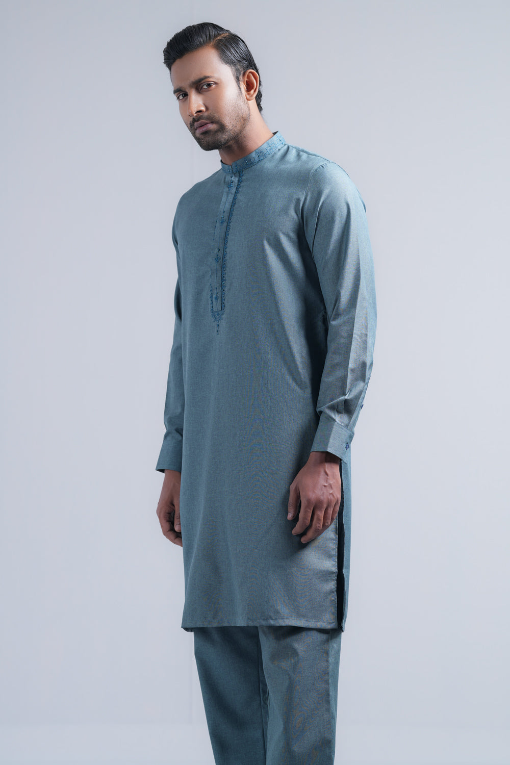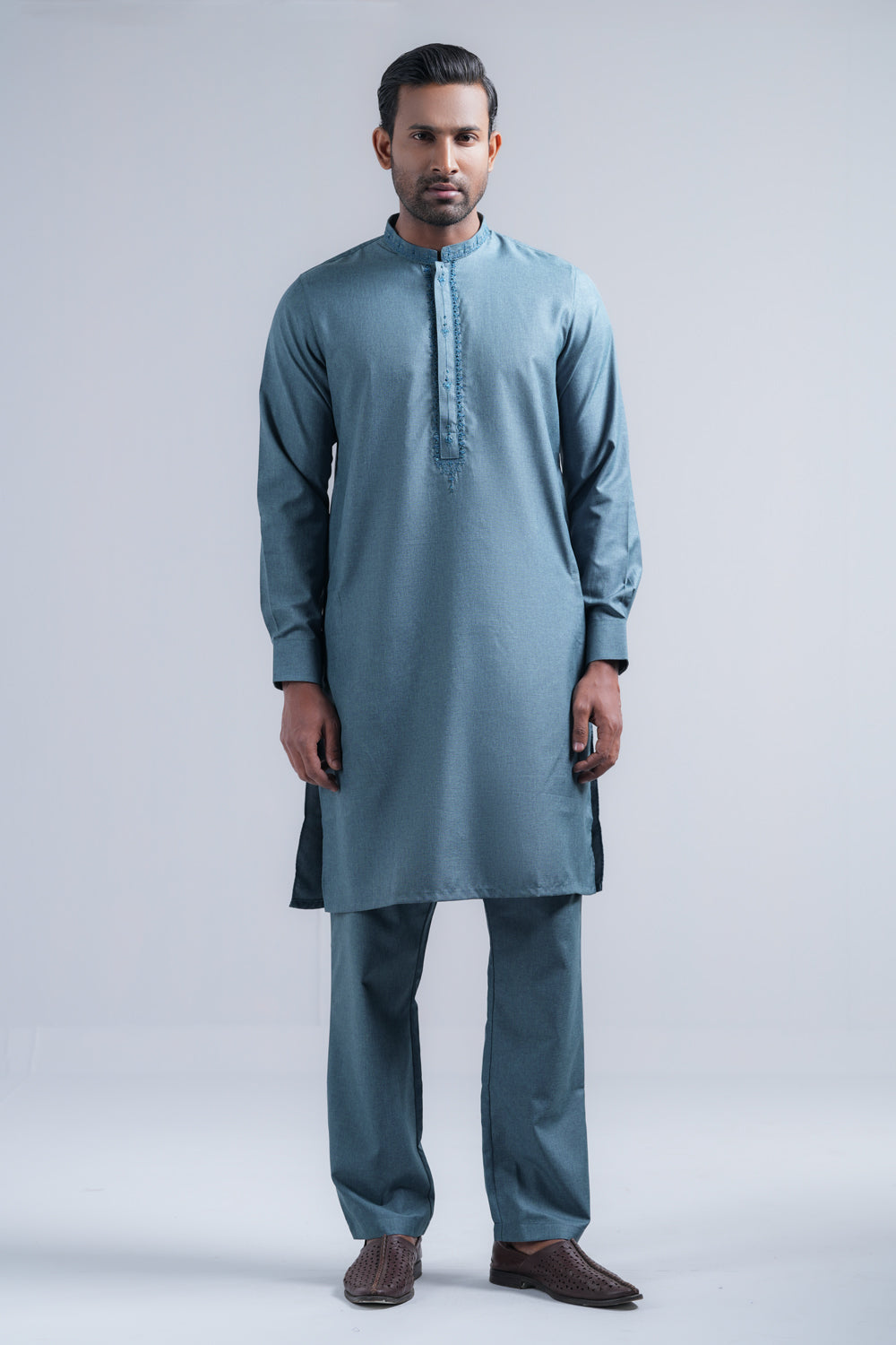 This regular-fit Kurta set features a pajama and a finely crafted embroidered band collar, hidden placket and around placket embroidery. Made from breathable blended fabric and finished with elegant buttons, it offers super comfort and a classical outlook, perfect for any occasion