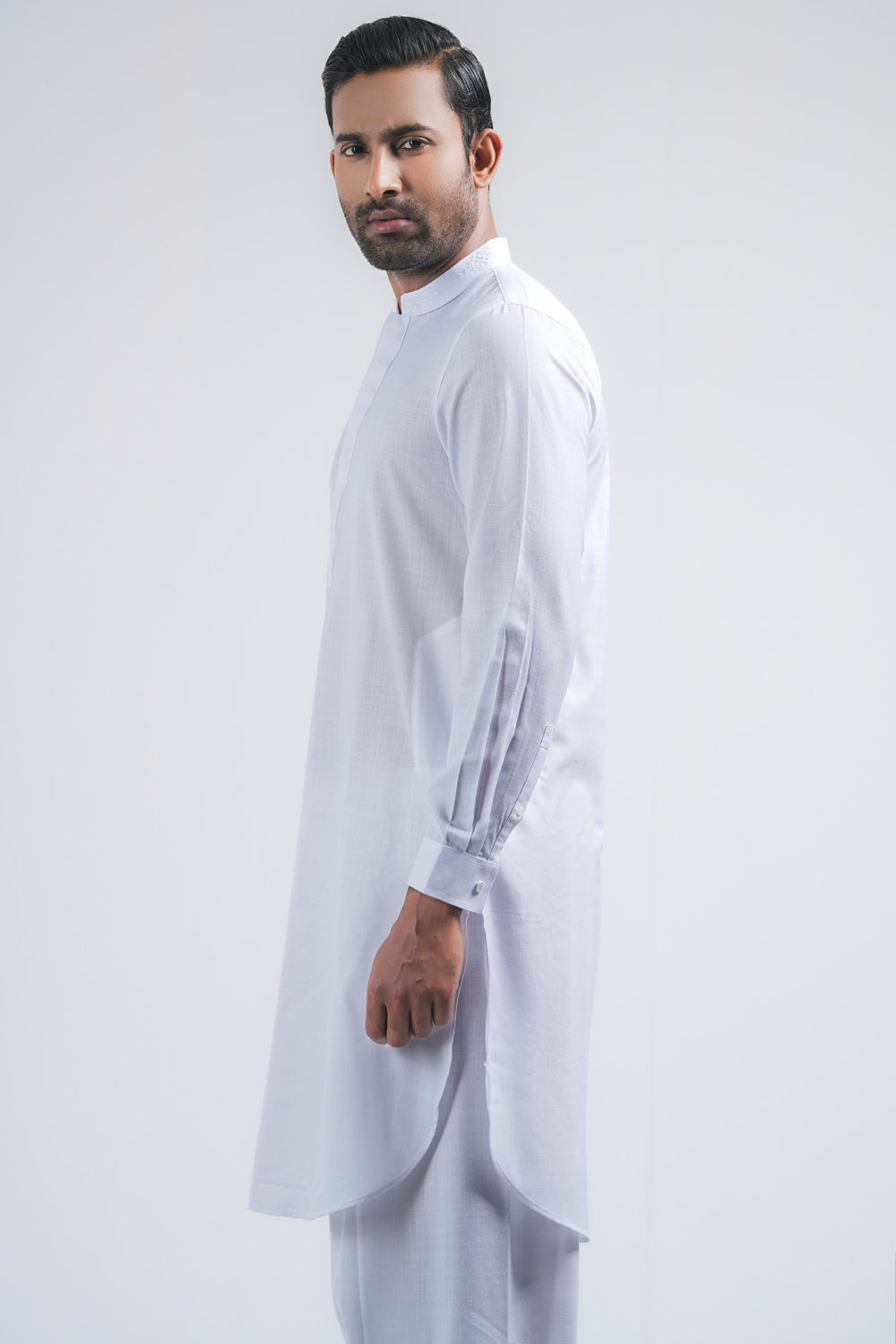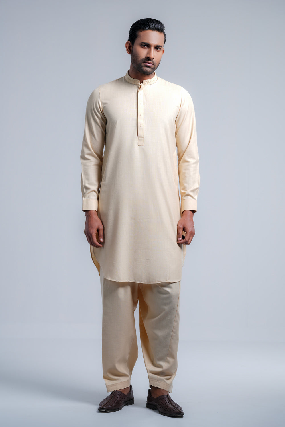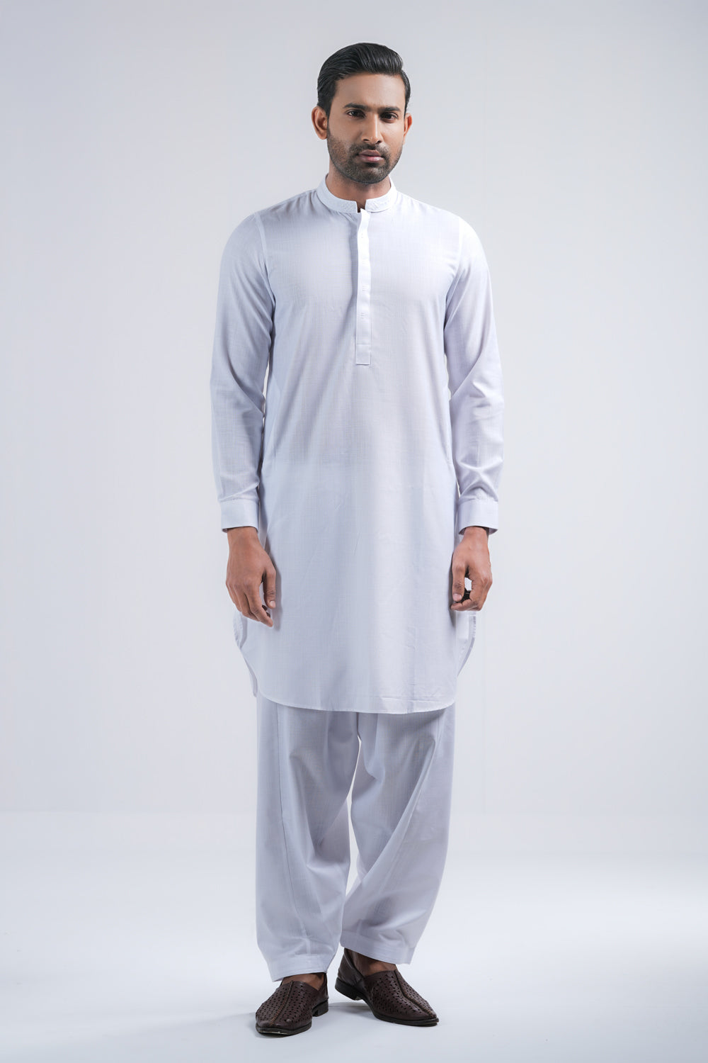 This regular-fit Kabli set features a shalwar and a beautifully crafted embroidered band with hidden placket handwork detailing. Made from breathable cotton fabric. Perfect for a timeless and elegant semi-formal look.