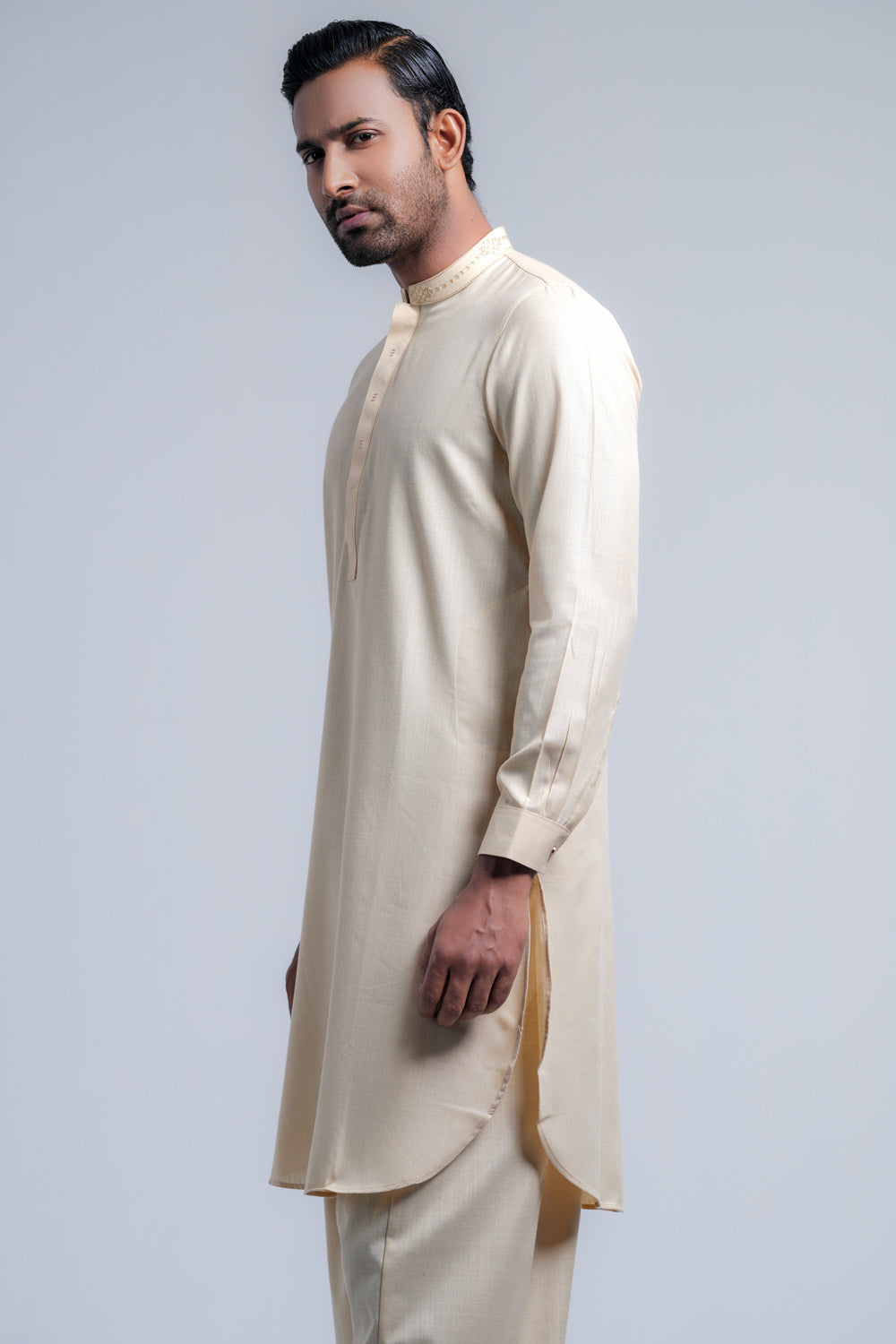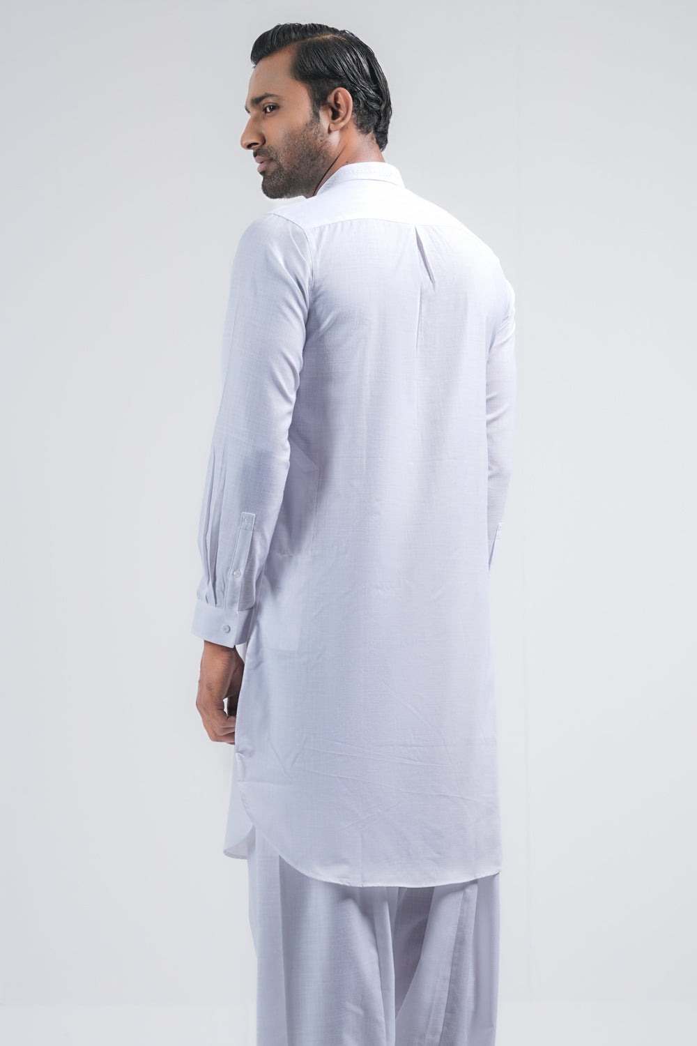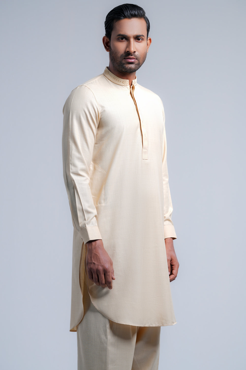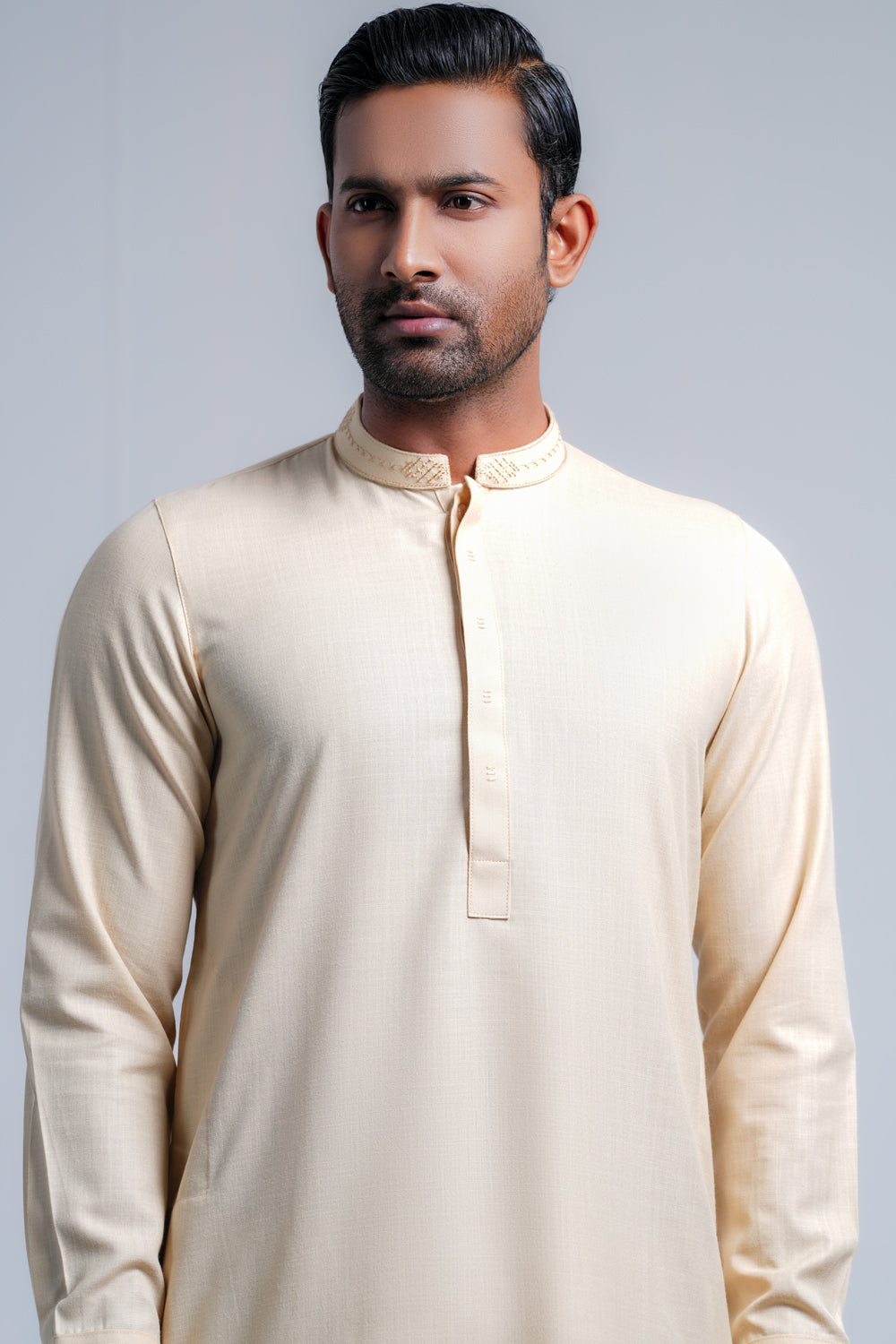 This regular-fit Kabli set features a shalwar and a beautifully crafted embroidered band with hidden placket handwork detailing. Made from breathable cotton fabric. Perfect for a timeless and elegant semi-formal look.