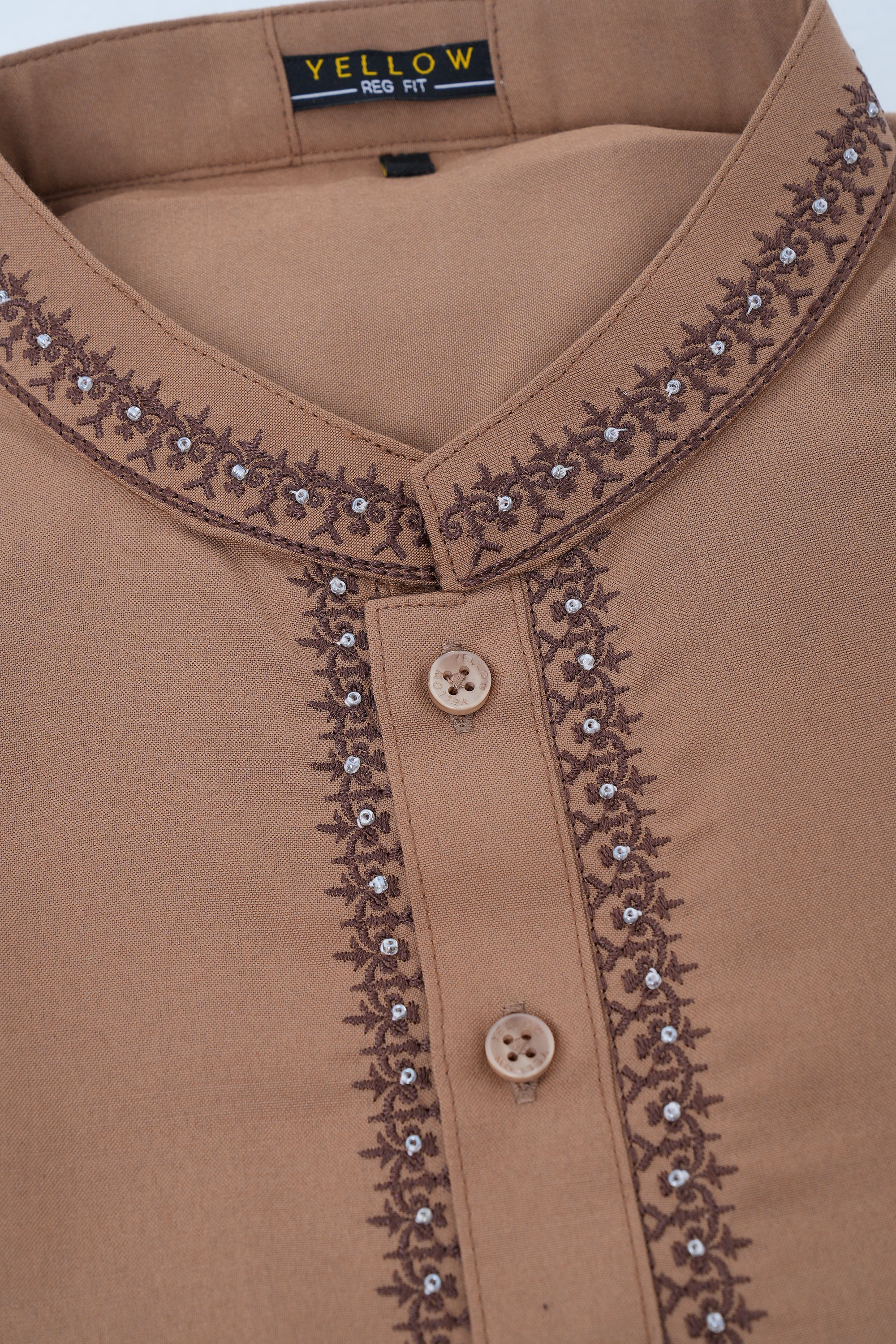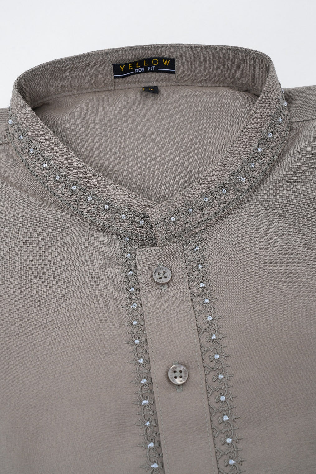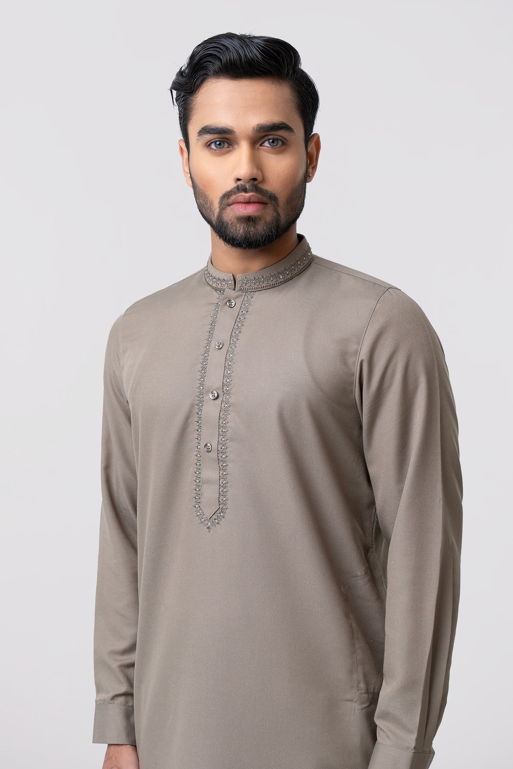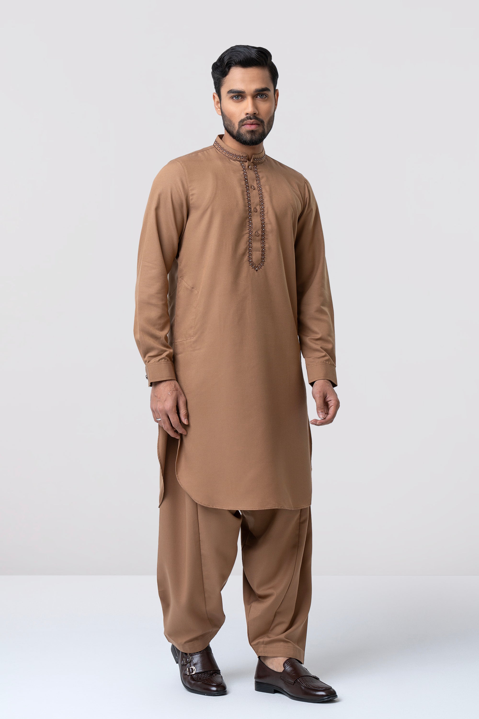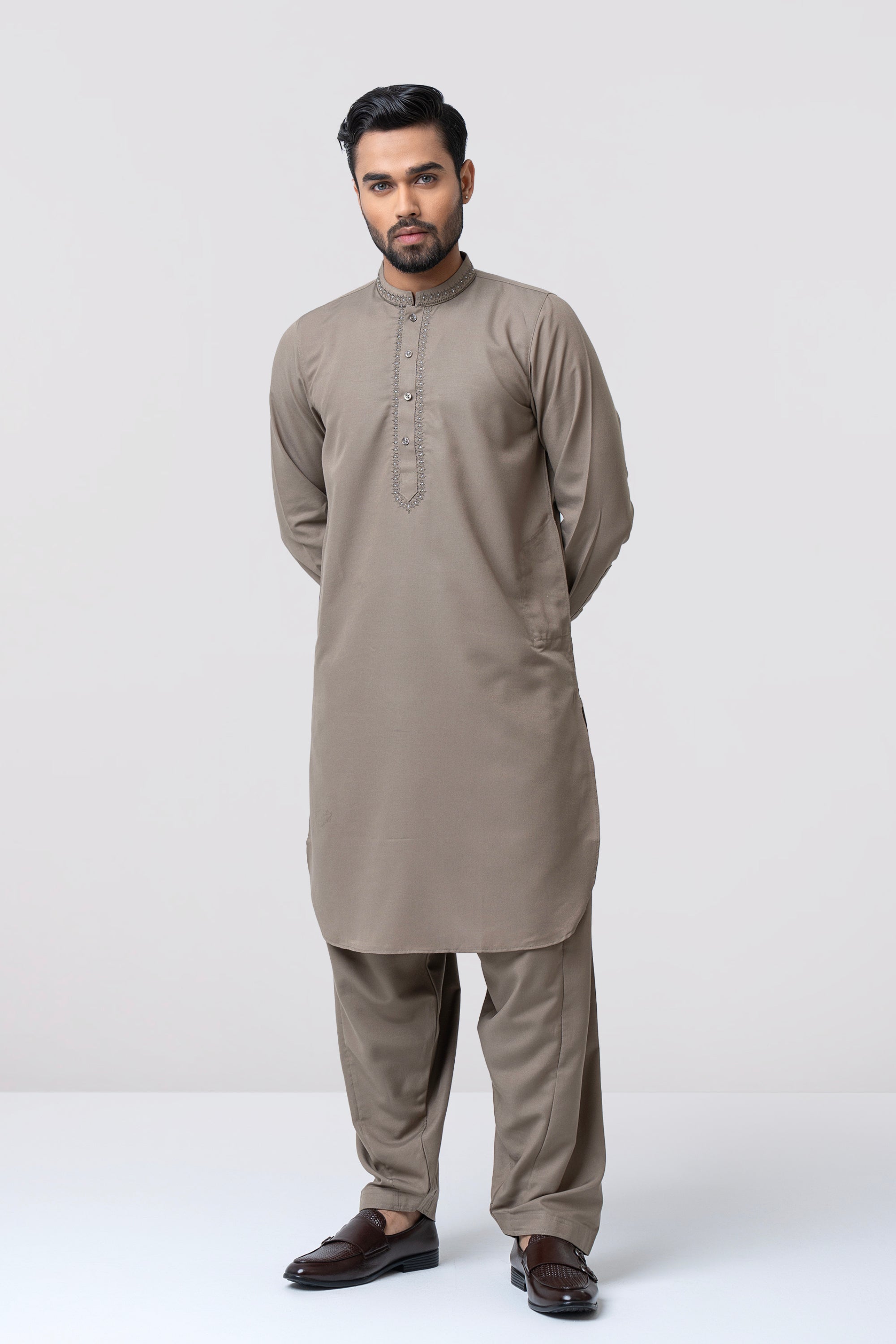 This regular fit men's set kabli features a shalwar and embroidery detailing at band and around placket. This semi-formal style made with breathable premium blended fabric perfect for a timeless and elegant look.