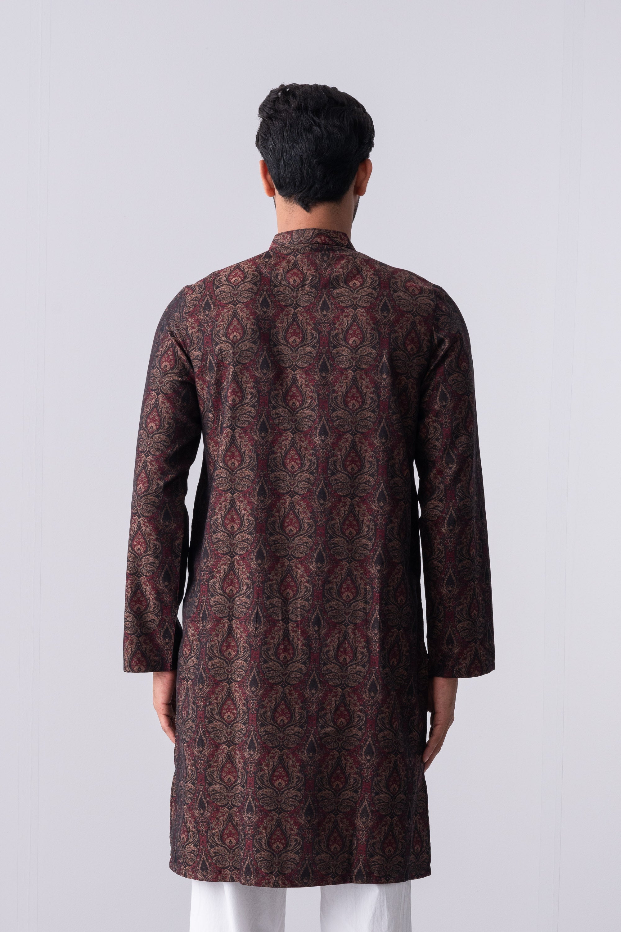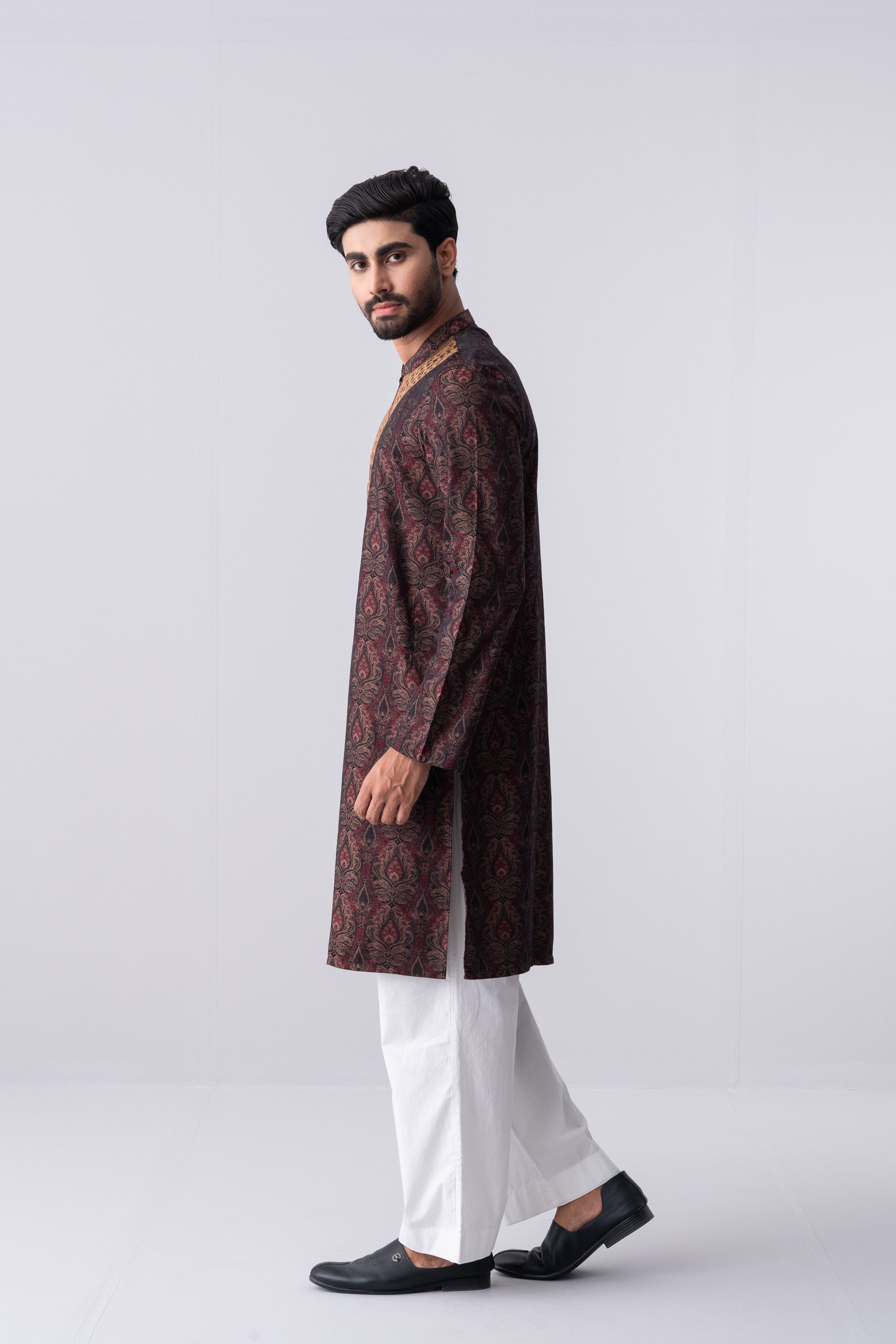 A regular-fit Panjabi crafted from jacquard fabric with 100% cotton fabric, featuring cord embroidery on the welt placket, offers a stylish yet comfortable semi-formal look. This design combines traditional elements with modern detailing, making it perfect for various occasions.