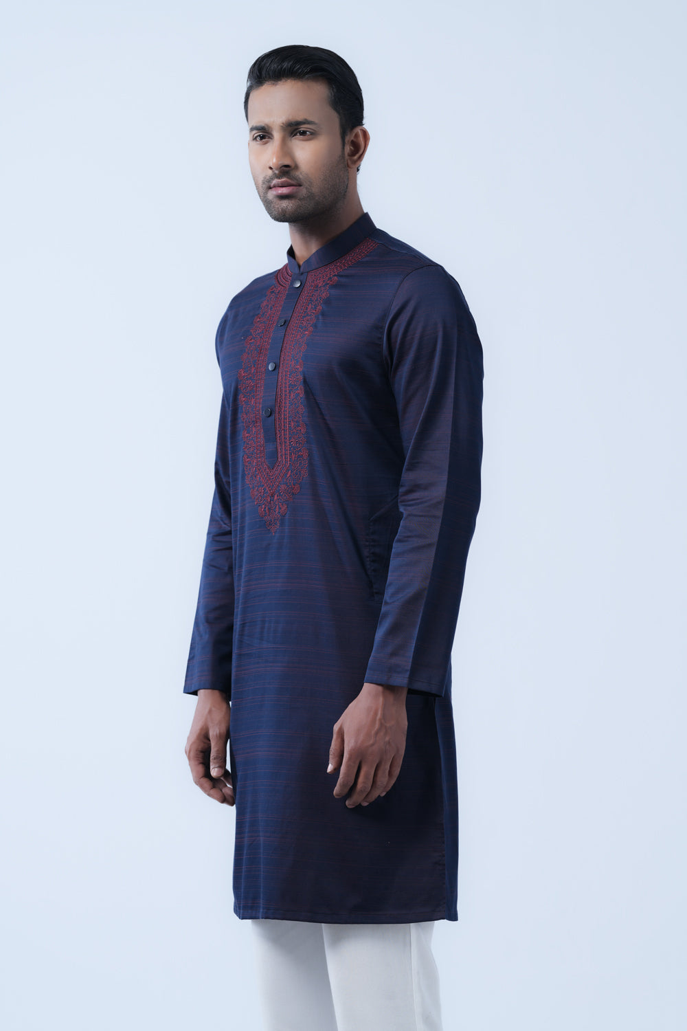 Elevate your slim fit semi-formal style effortlessly with our premium 100% cotton two tone fabric men's Panjabi, featuring eye soothing around placket embroidery with snap buttons for a refined touch.