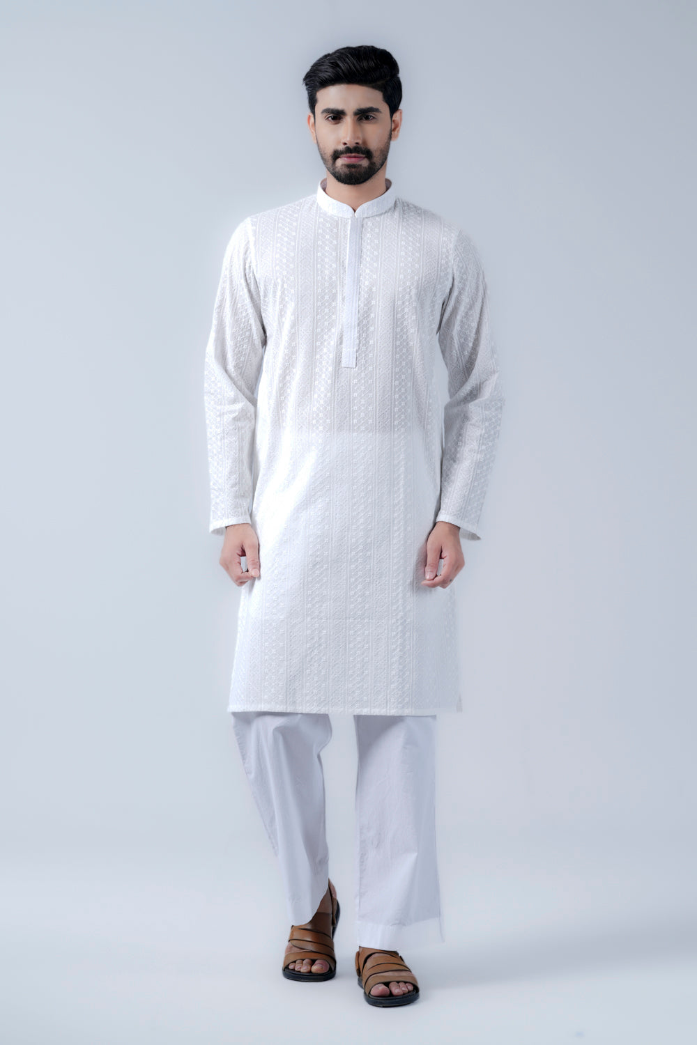 A regular fit Panjabi crafted from schiffli fabric with 100% cotton breathable fabric, featuring hidden placket, offers a stylish yet comfortable semi-formal look. Perfect for effortless elegance and all-day ease.