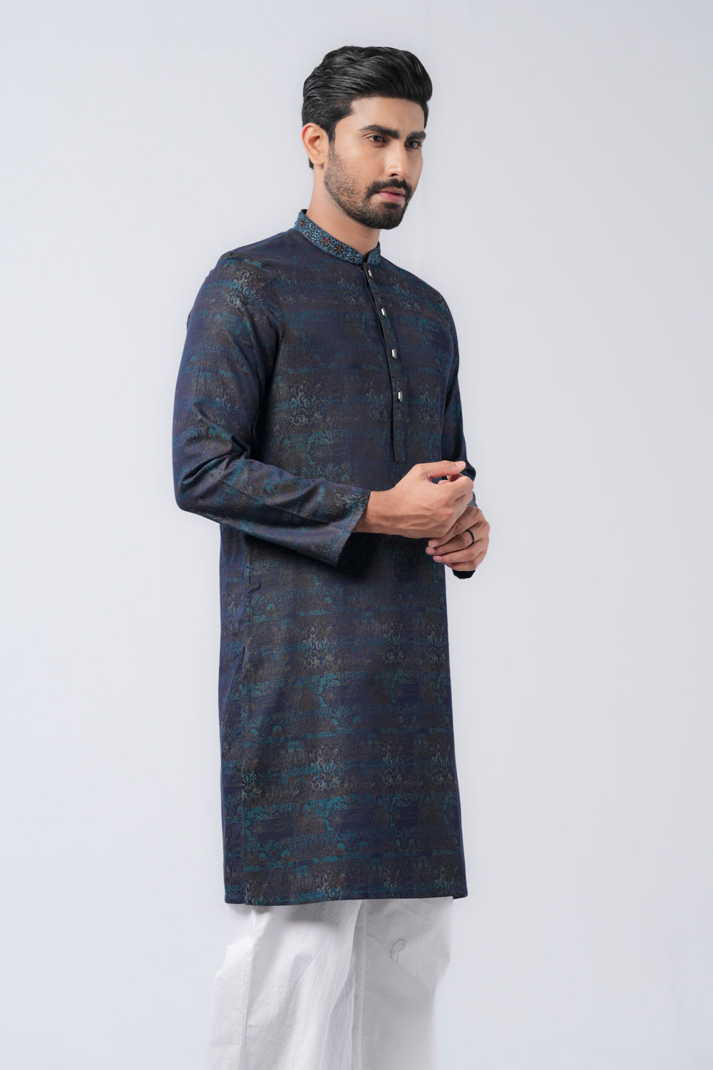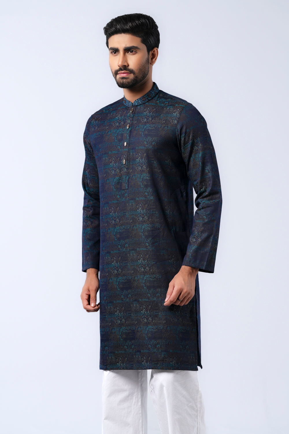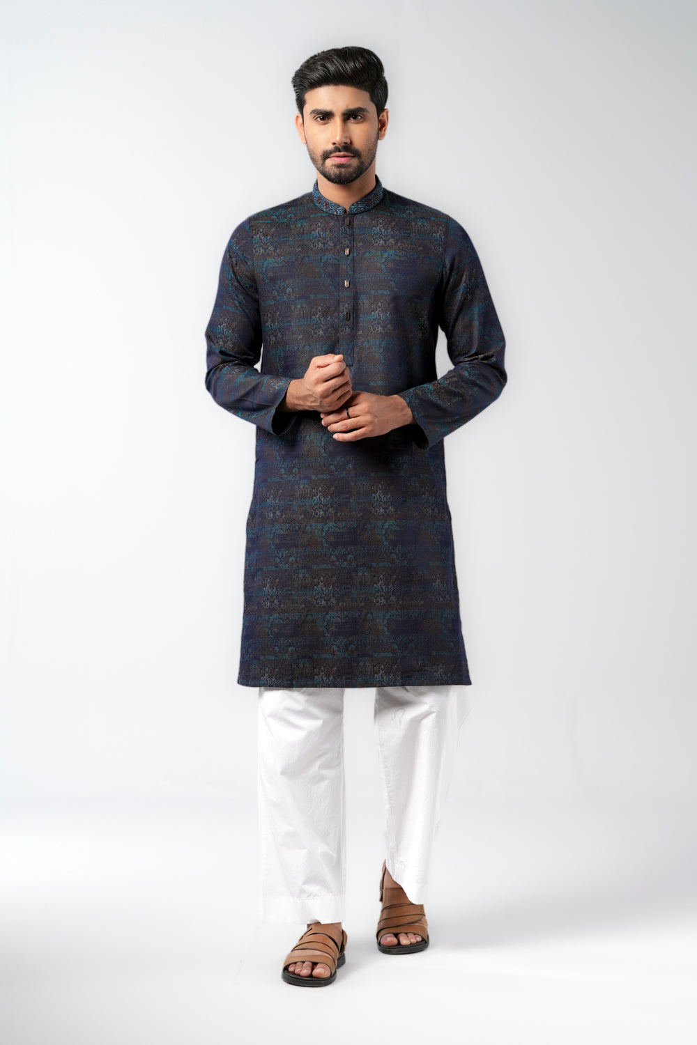 A regular-fit Panjabi crafted from jacquard fabric with 100% cotton breathable fabric, featuring embroidery on band and decorative snap buttons, offers a stylish yet comfortable semi-formal look. Perfect for effortless elegance and all-day ease.