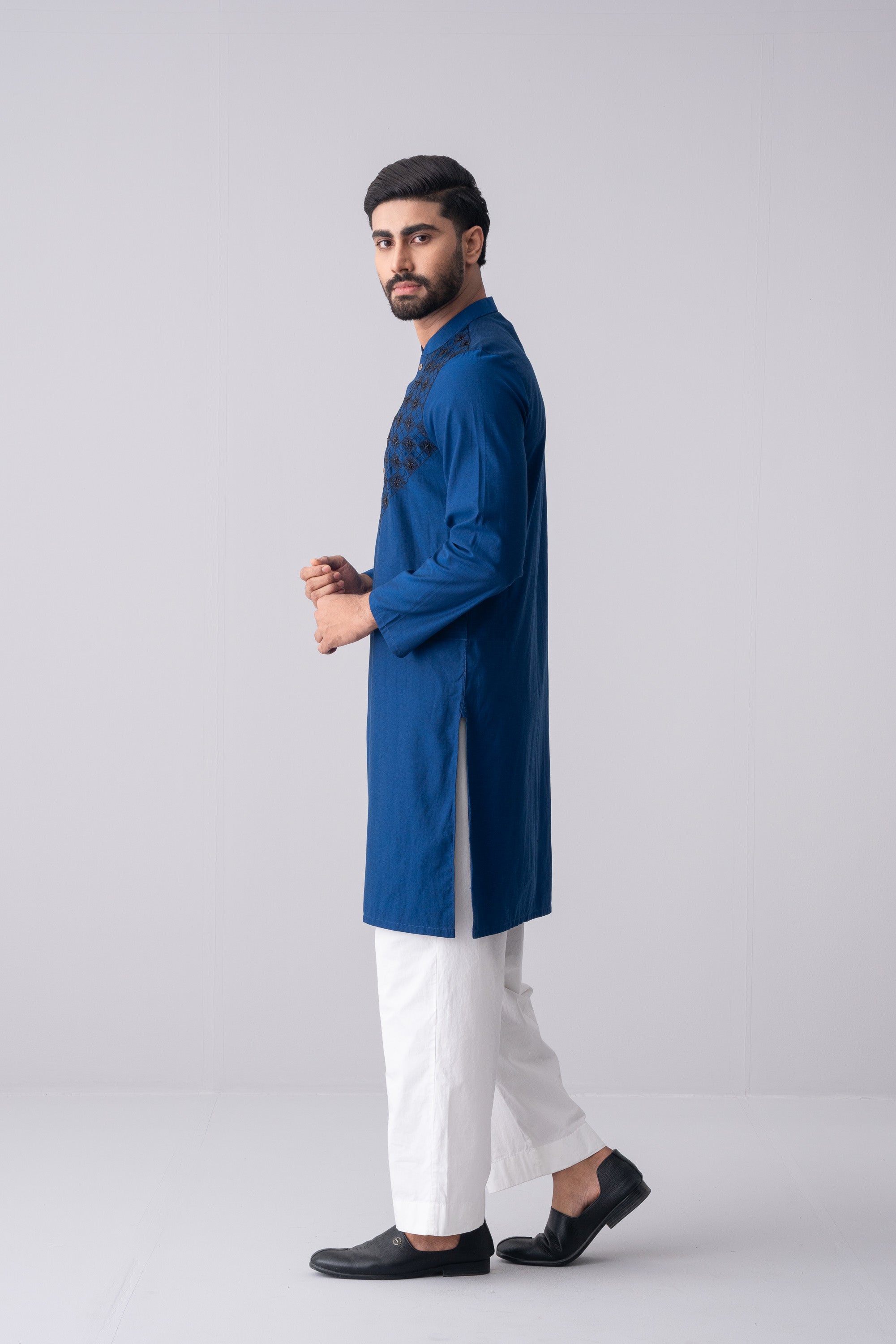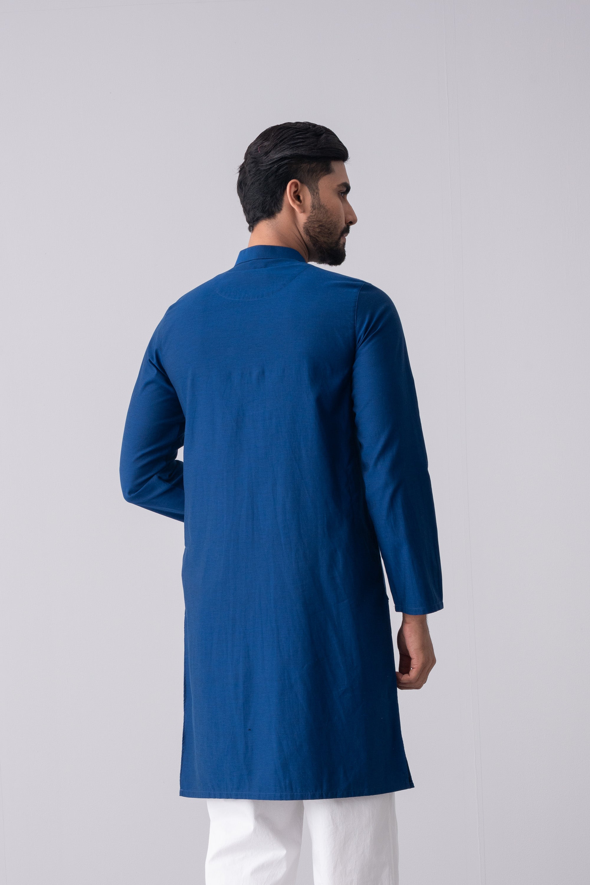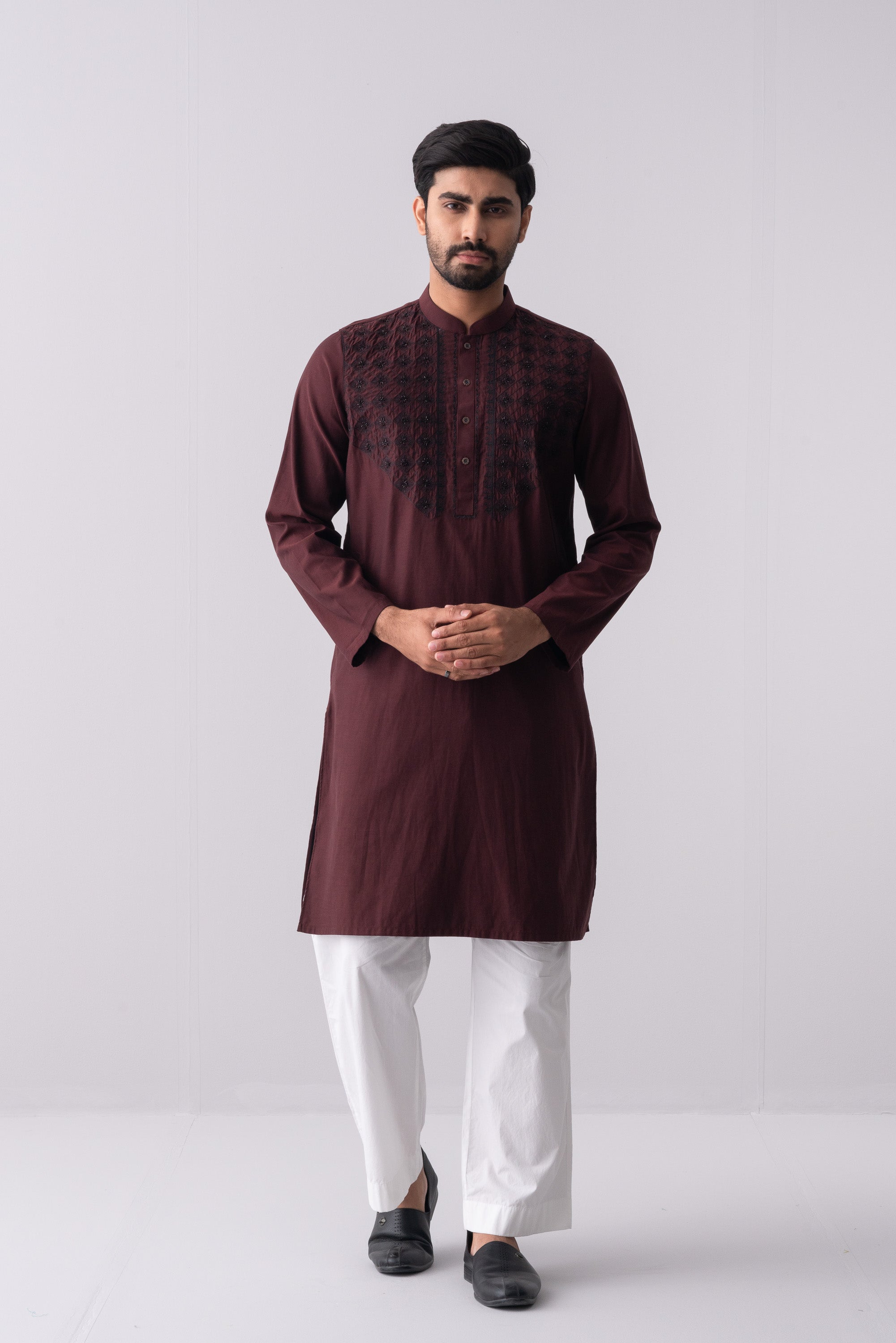 Elevate your Regular Fit Semi-formal styling Men's Panjabi effortlessly with our premium 100% Cotton fabric, featuring eye soothing around placket embroidery & Hand embellishment along with Regular buttons for a refined touch.