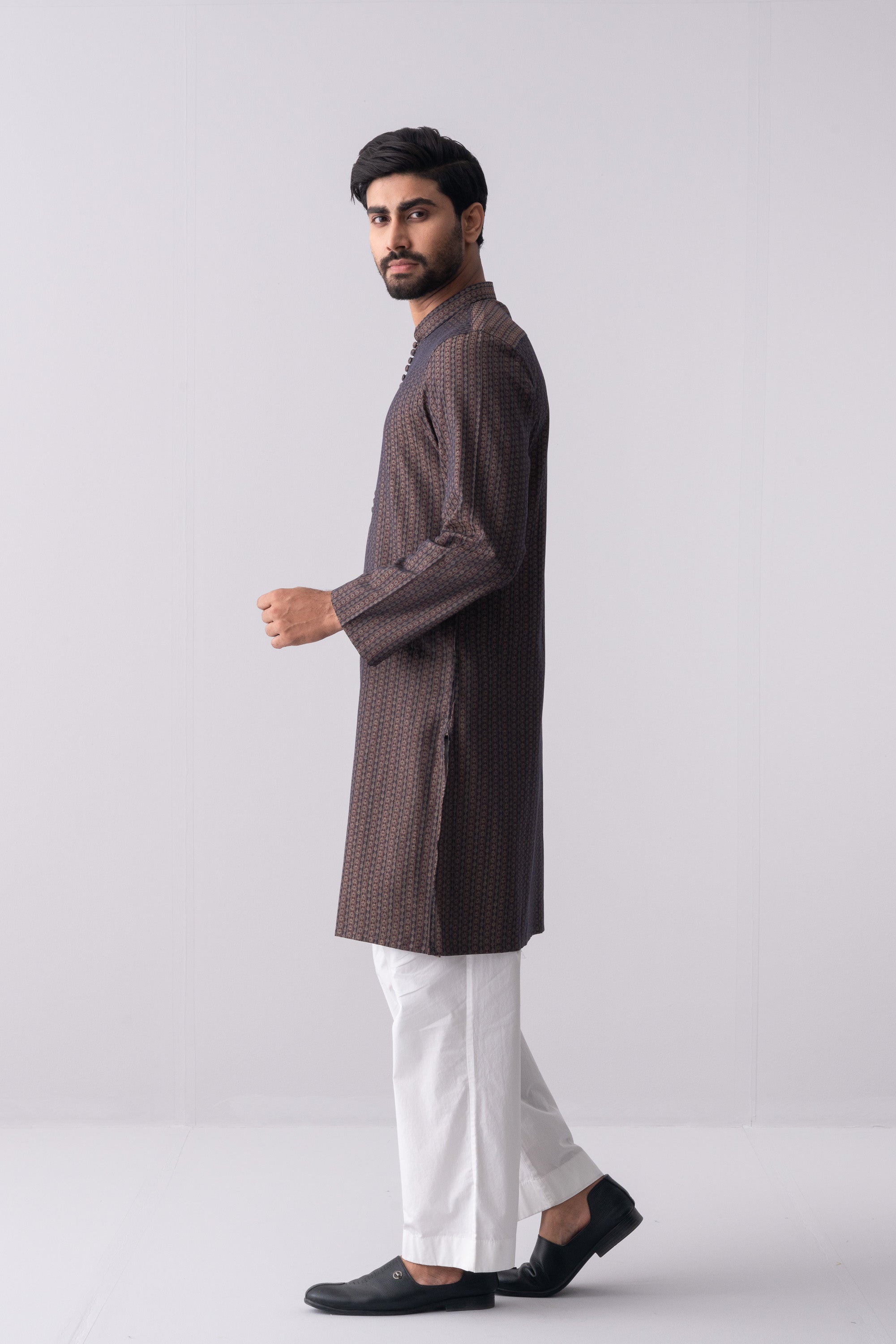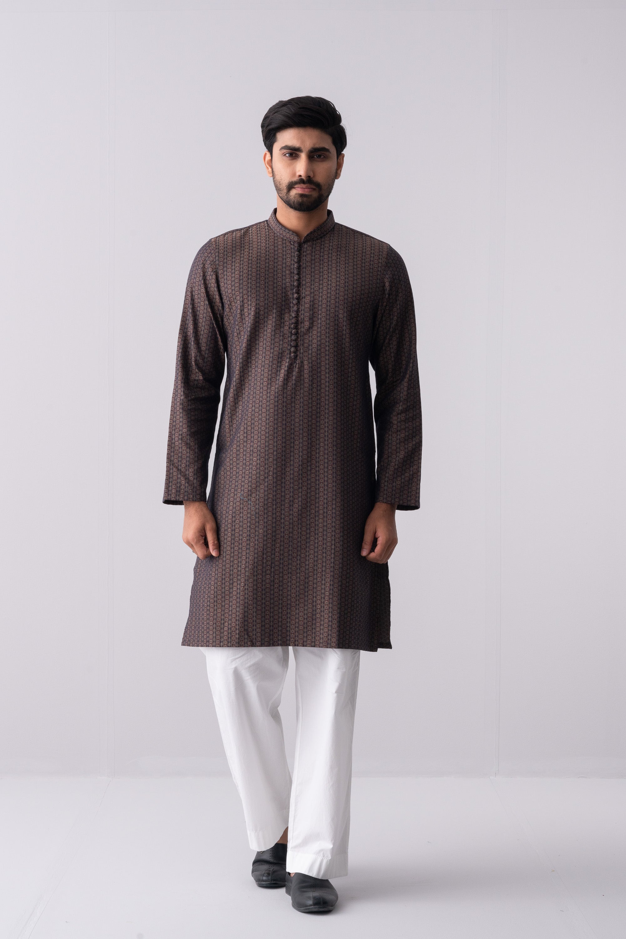Crafted from breathable jacquard fabric, this slim-fit Panjabi features fabric cover buttons, offering a refined semi-formal look. Perfect for special occasions or elegant daily wear.
