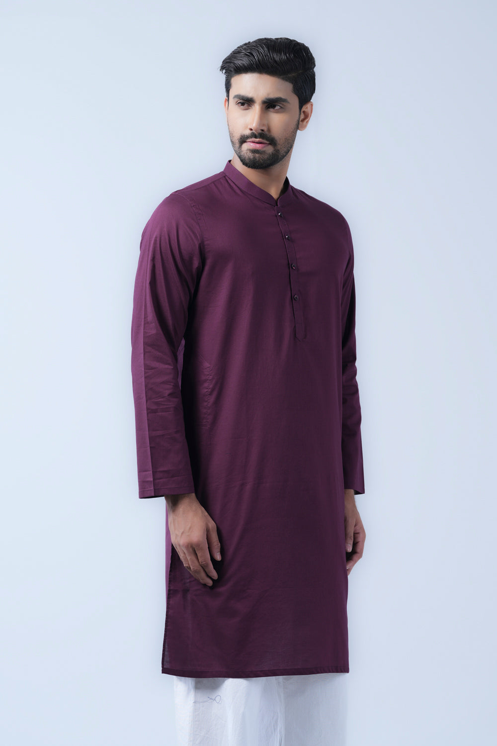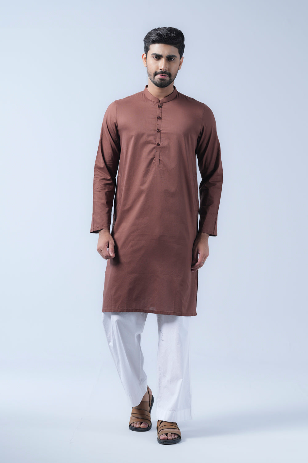 A regular-fit Panjabi crafted from solid dyed 100% cotton fabric with bartack detailing on placket offers a stylish yet comfortable daily wear look. This design combines comfort and subtle elegance, making it ideal for a refined and stylish appearance.
