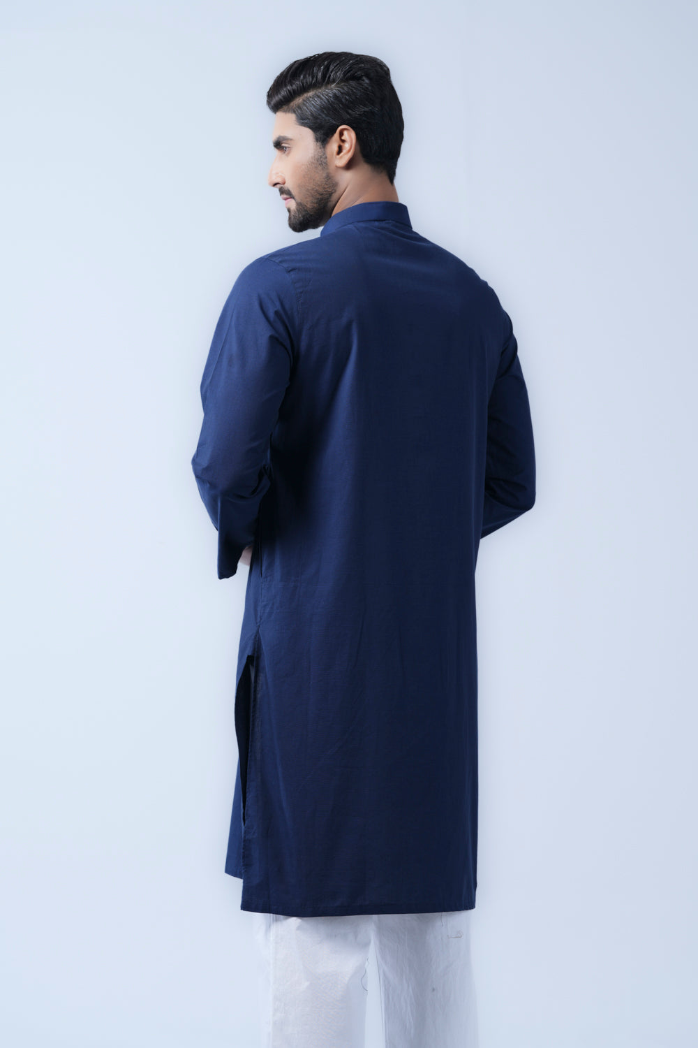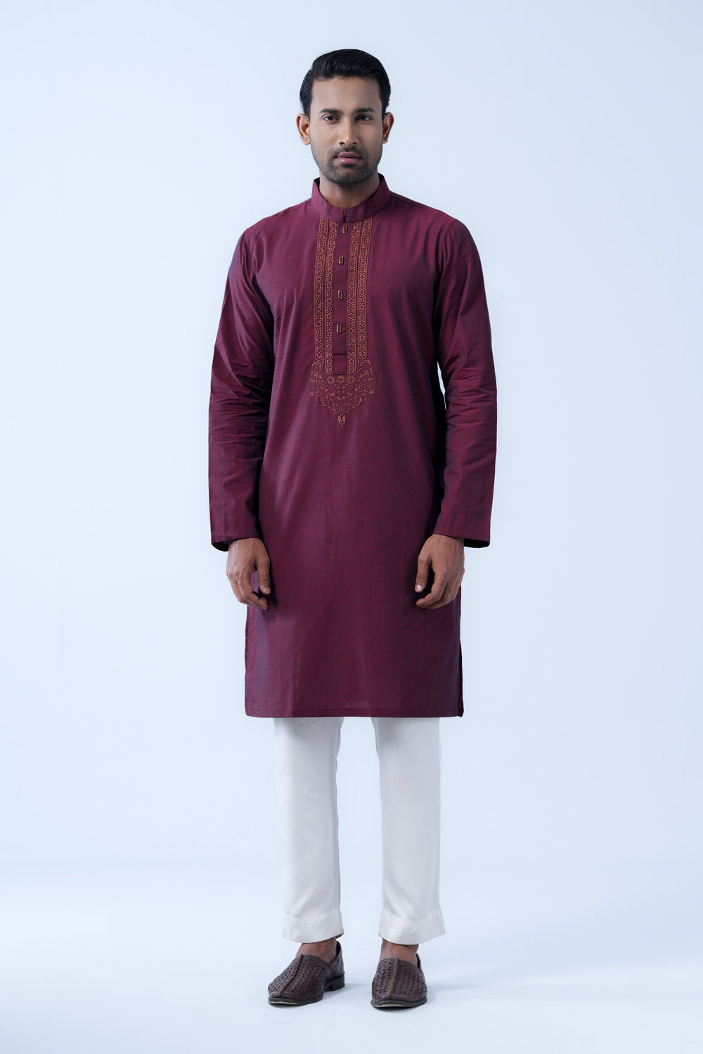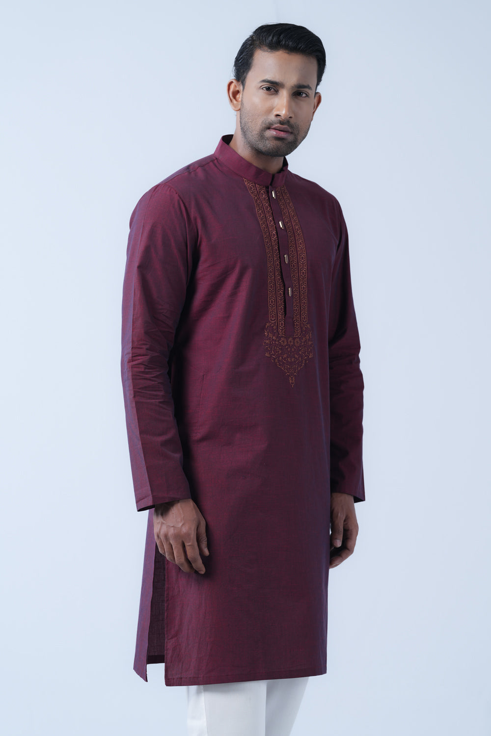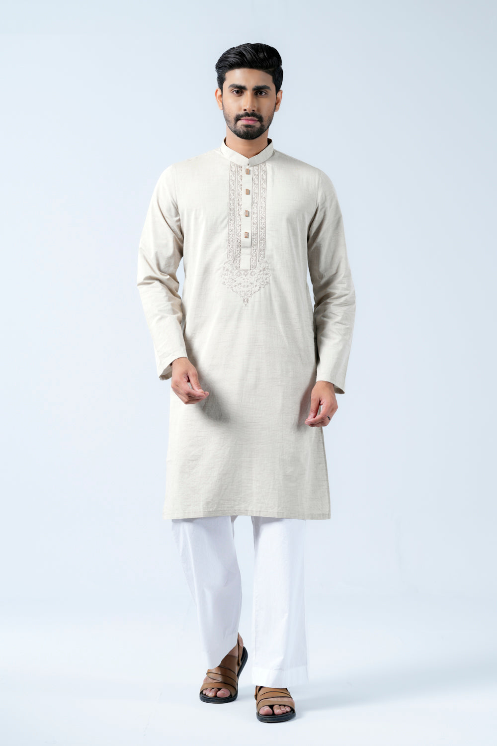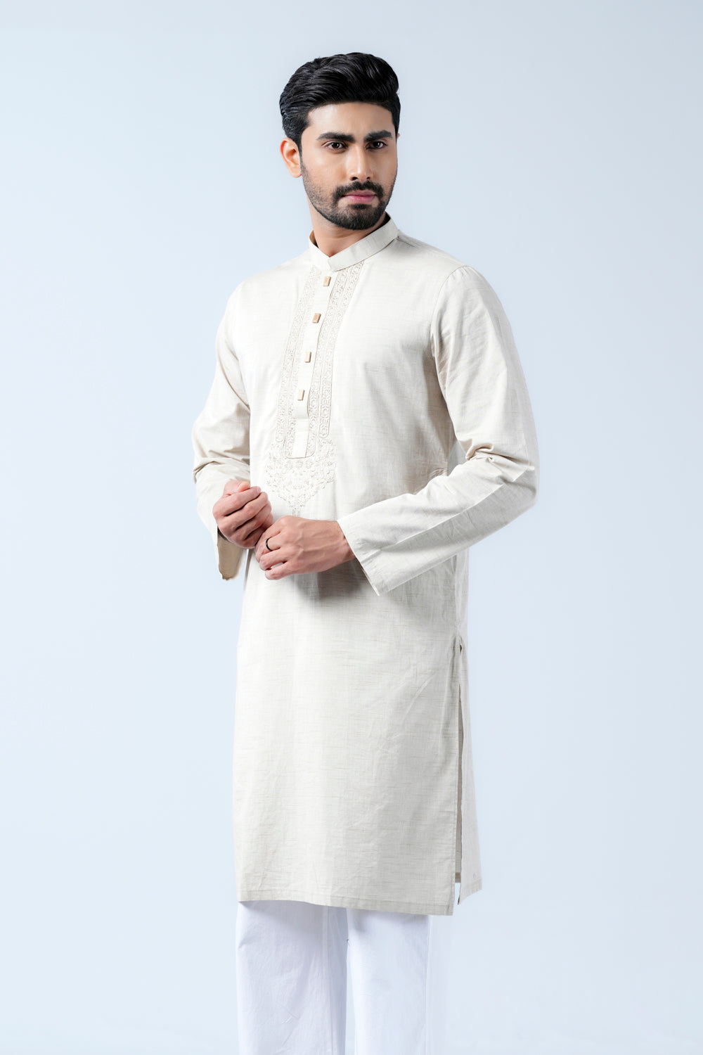 A regular fit Panjabi crafted with 100% cotton slub breathable fabric, featuring intricate embroidery on around placket and decorative snap buttons, offers a stylish yet comfortable semi-formal look. Perfect for effortless elegance and all-day ease.