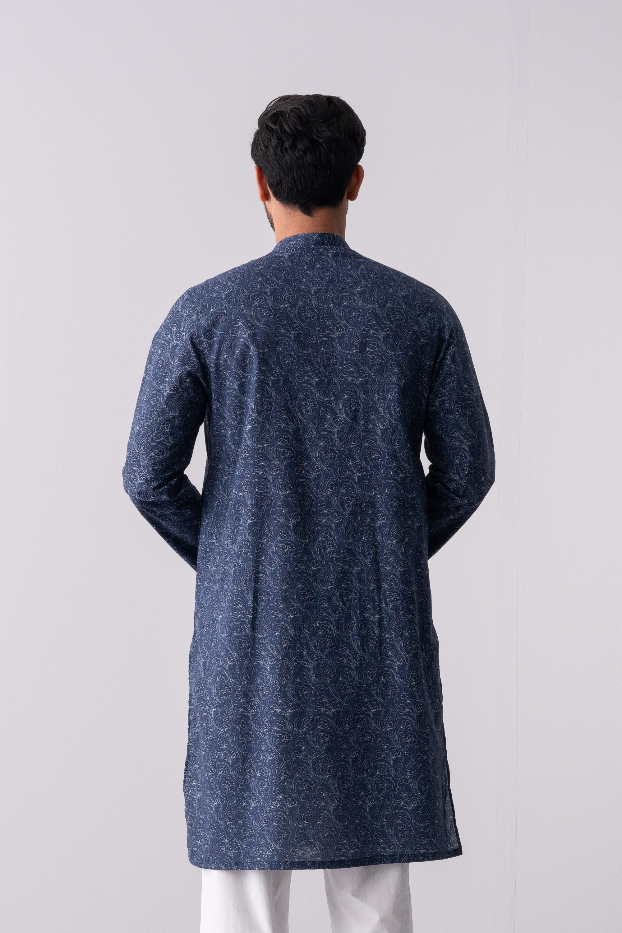 A regular-fit Panjabi crafted from 100% cotton fabric, featuring allover floral print details with contrast inside band and moon, offers a stylish and comfortable daily wear look. Perfect for a blend of tradition and modern elegance.