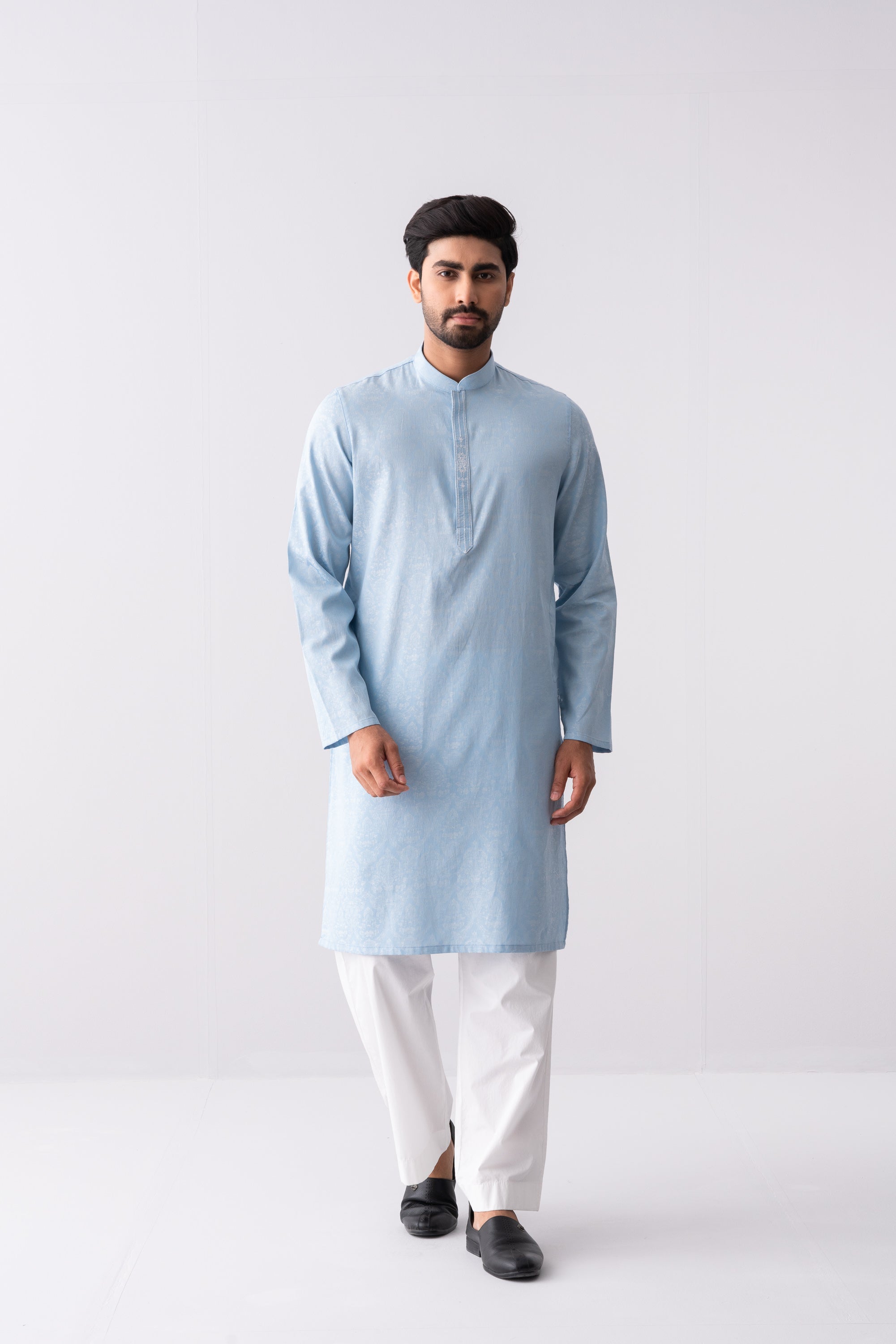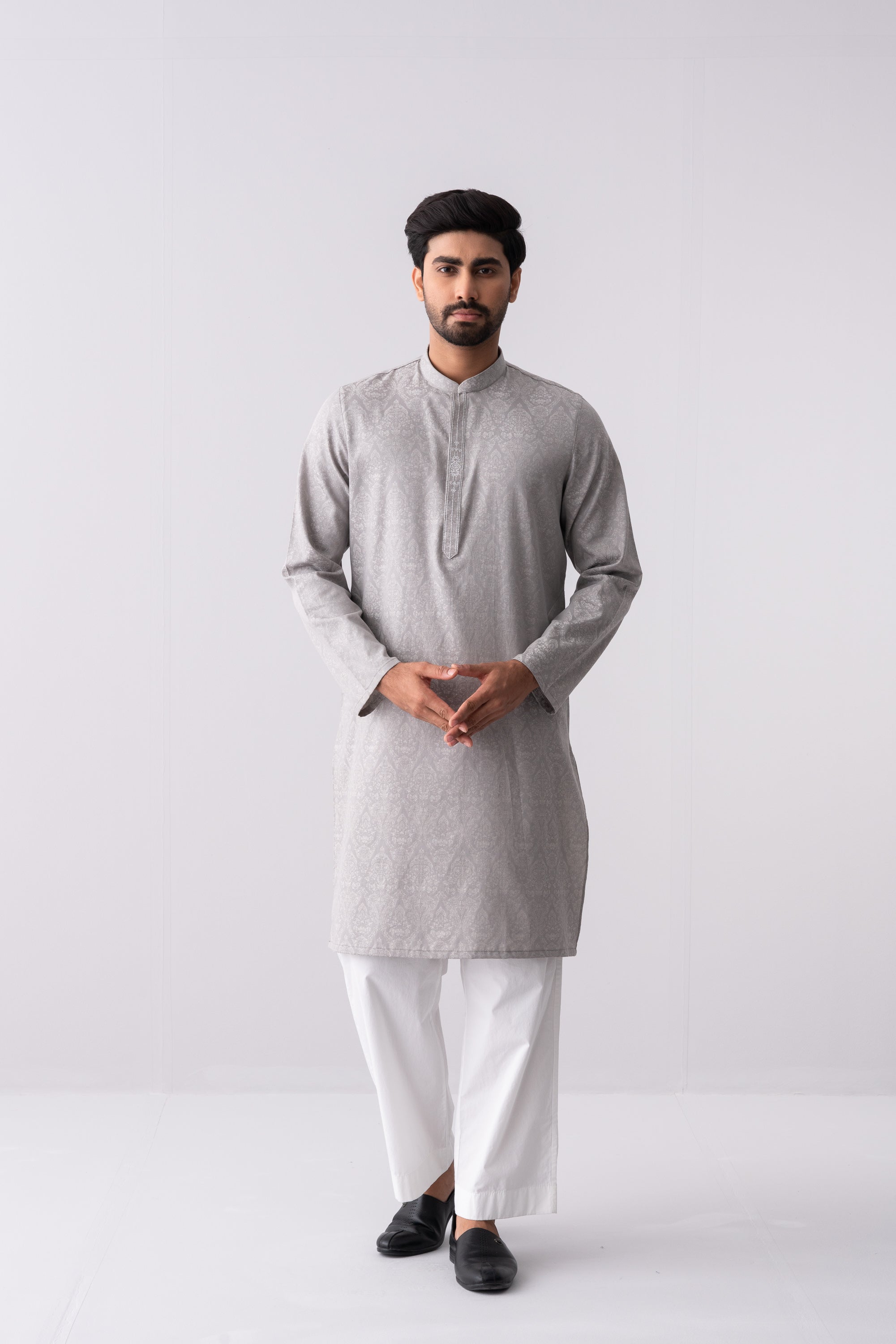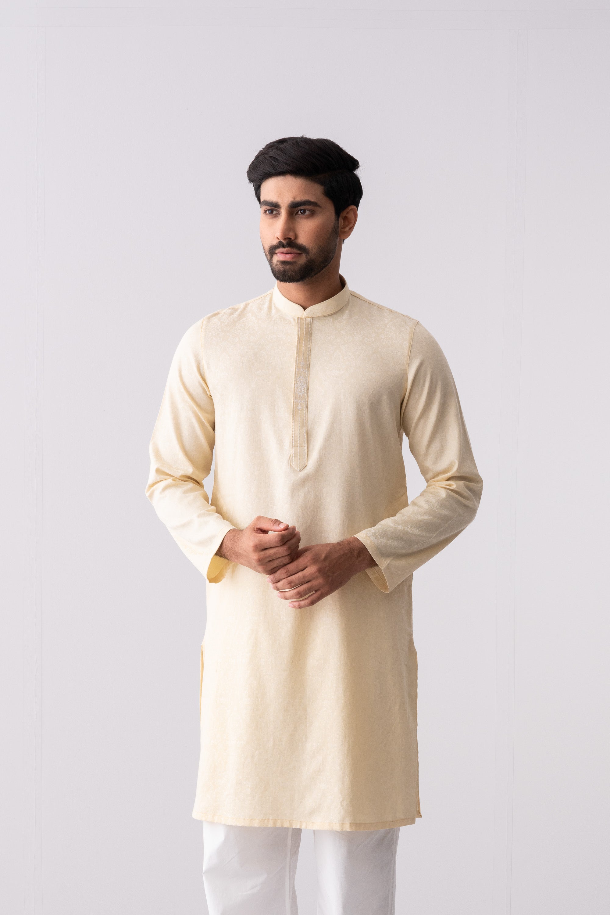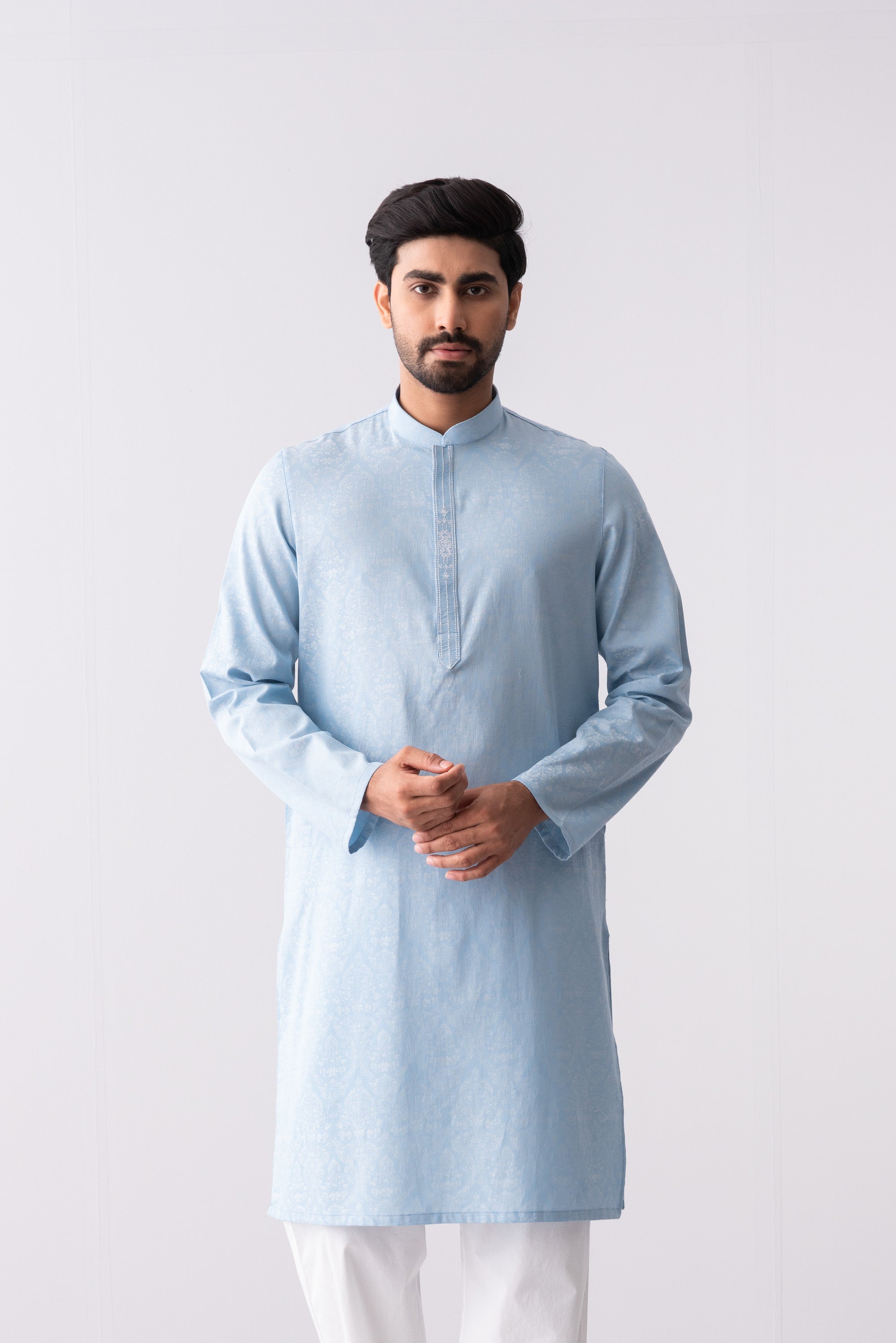 A regular-fit Panjabi crafted from jacquard fabric with 100% cotton breathable fabric, featuring embroidery on hidden placket, offers a stylish yet comfortable semi-formal look. Perfect for effortless elegance and all-day ease.
