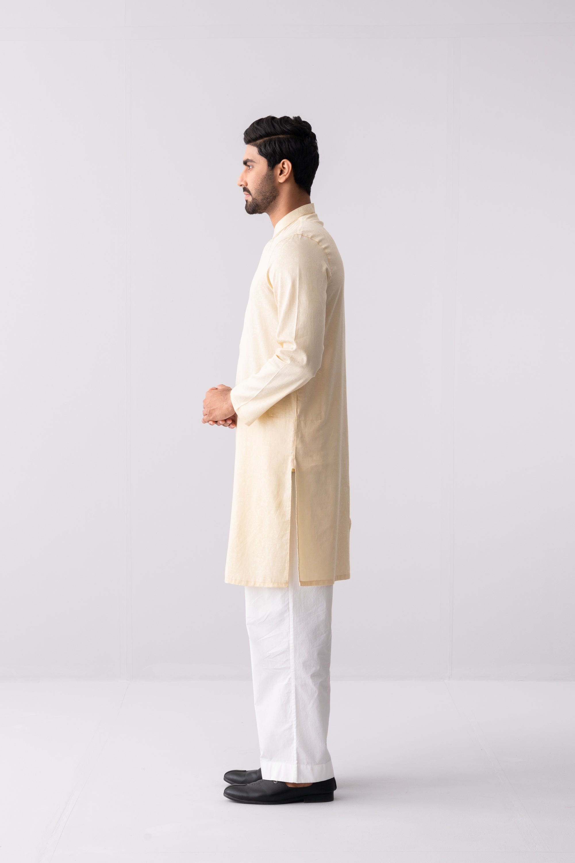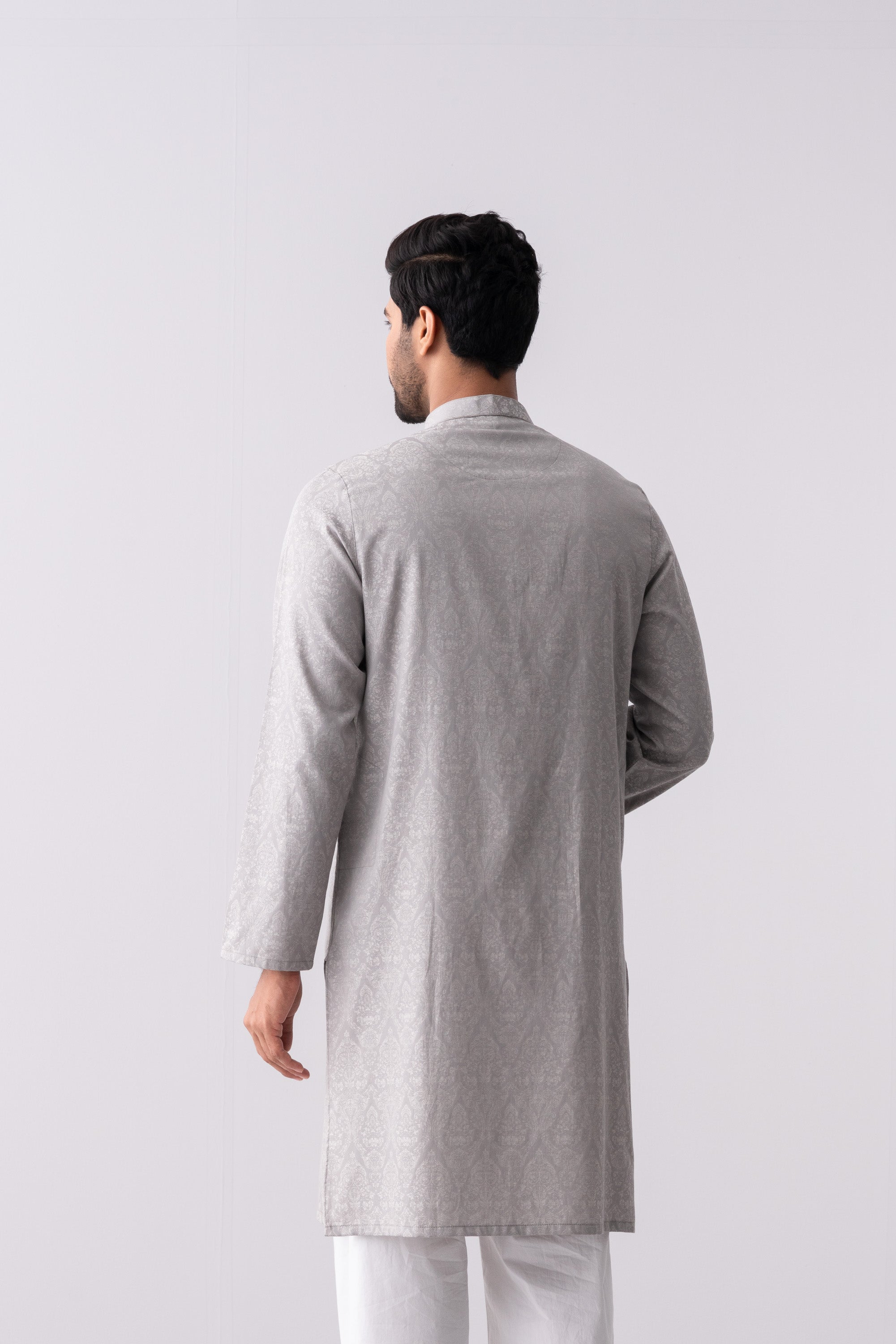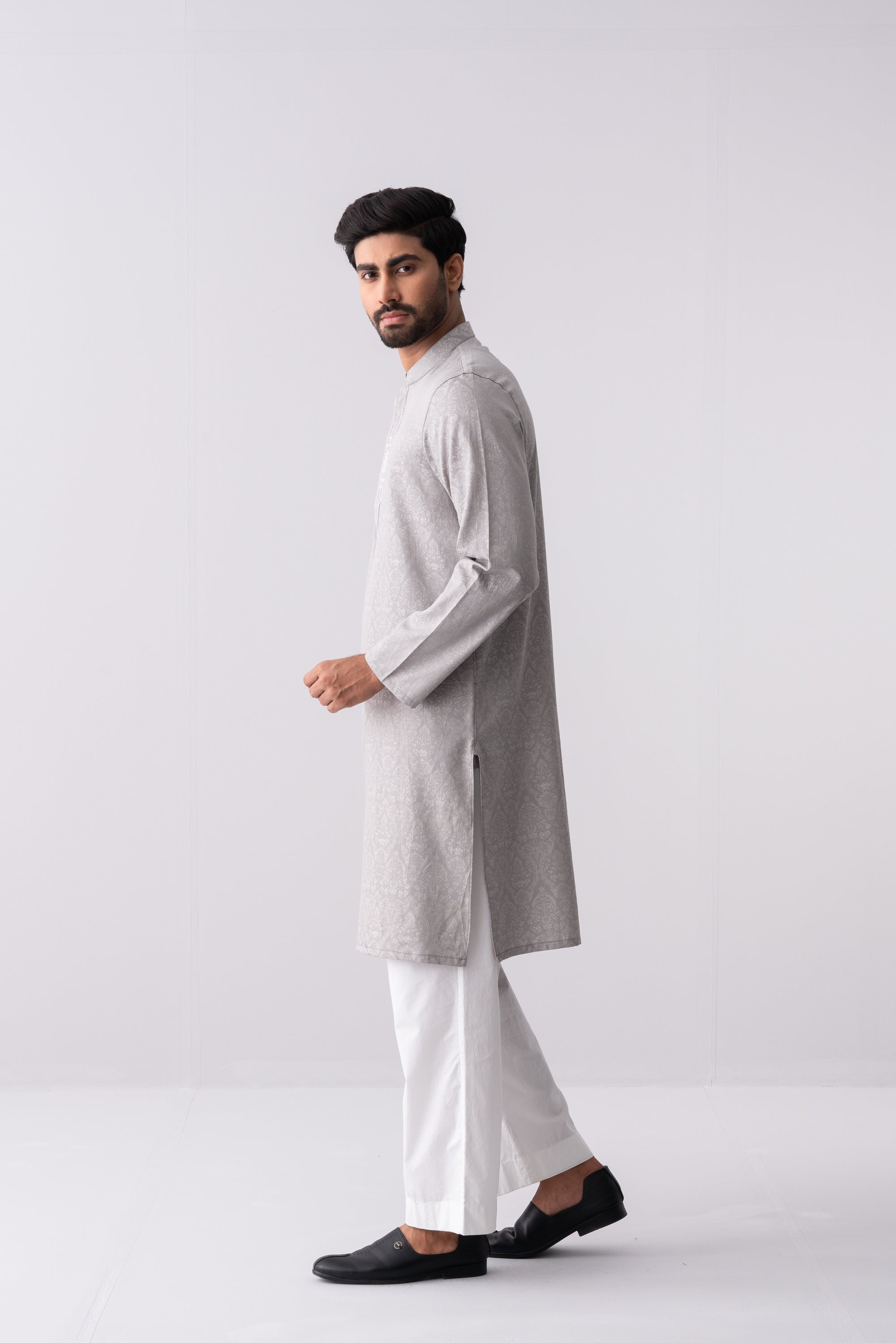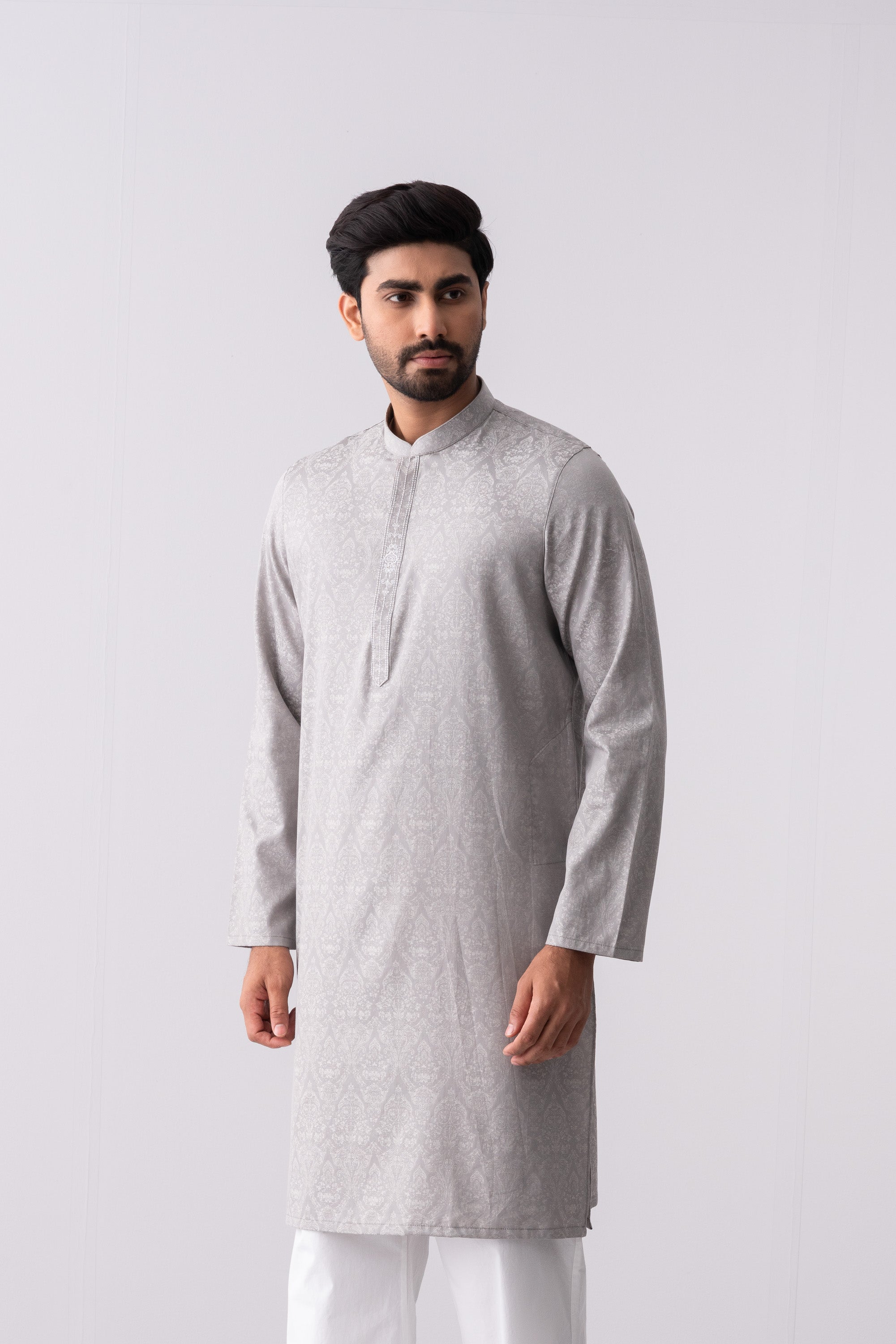 A regular-fit Panjabi crafted from jacquard fabric with 100% cotton breathable fabric, featuring embroidery on hidden placket, offers a stylish yet comfortable semi-formal look. Perfect for effortless elegance and all-day ease.