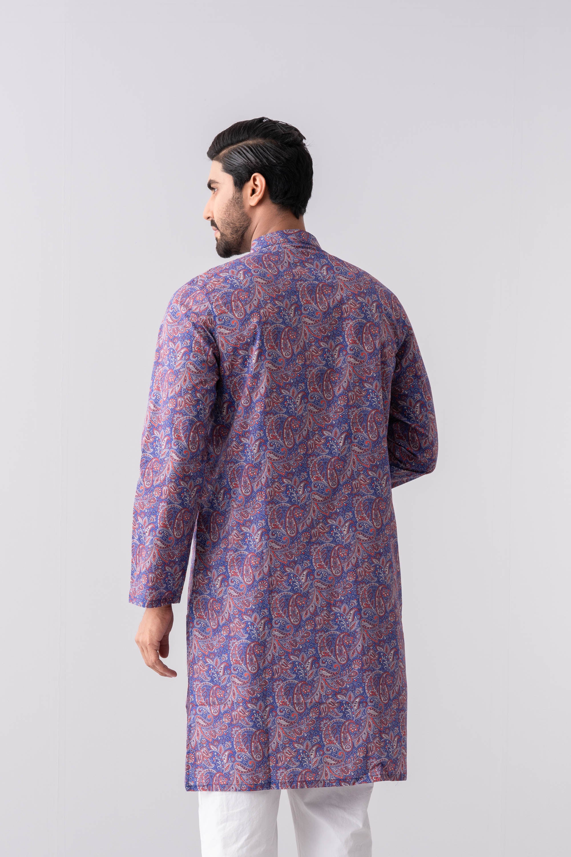A regular-fit Panjabi crafted from 100% cotton fabric, featuring an elegant allover paisley print with contrast inside band and moon, offers a stylish and comfortable daily wear look. Perfect for a blend of tradition and modern elegance.