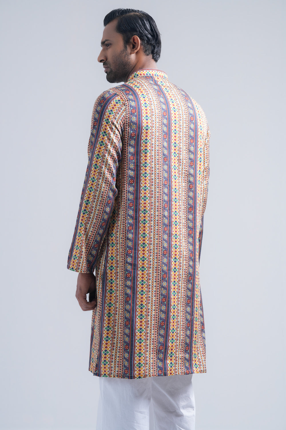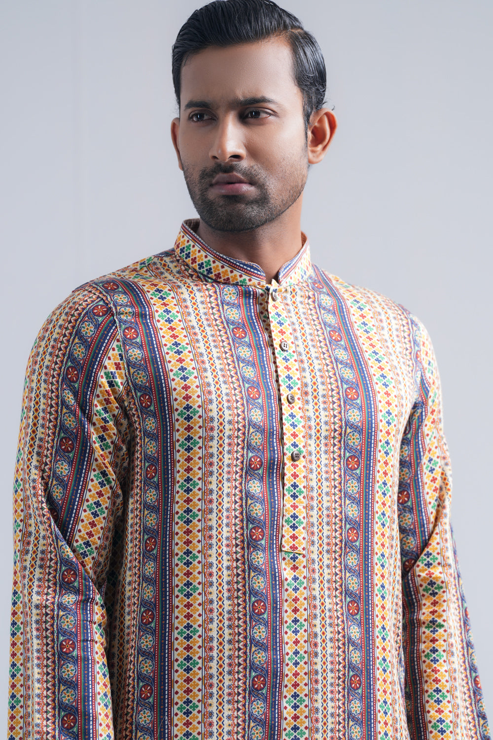 A regular-fit Panjabi crafted from 100% cotton fabric, featuring elegant allover print and contrast at the inside band, offers a stylish and comfortable daily wear look. Perfect for a blend of tradition and modern elegance.
