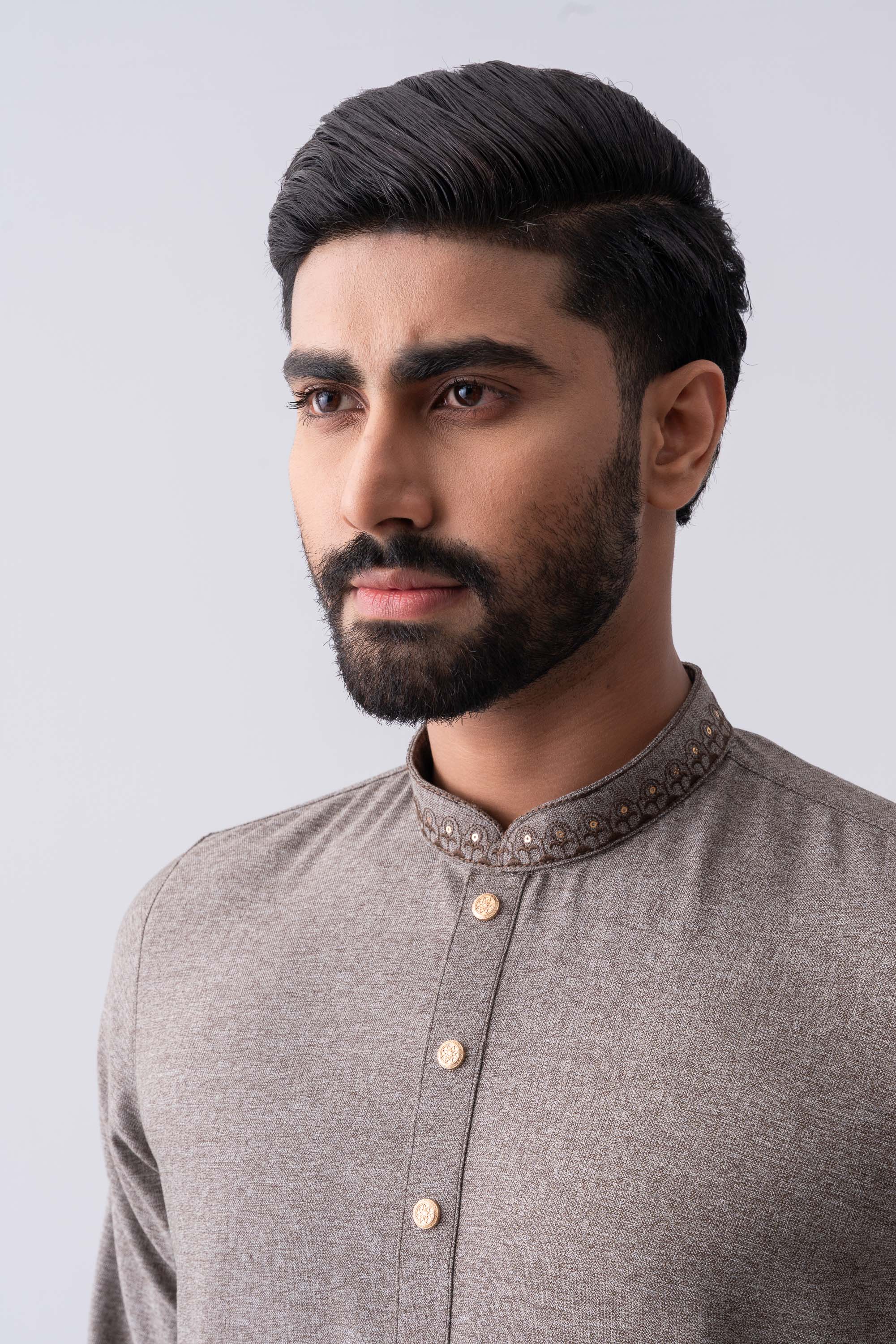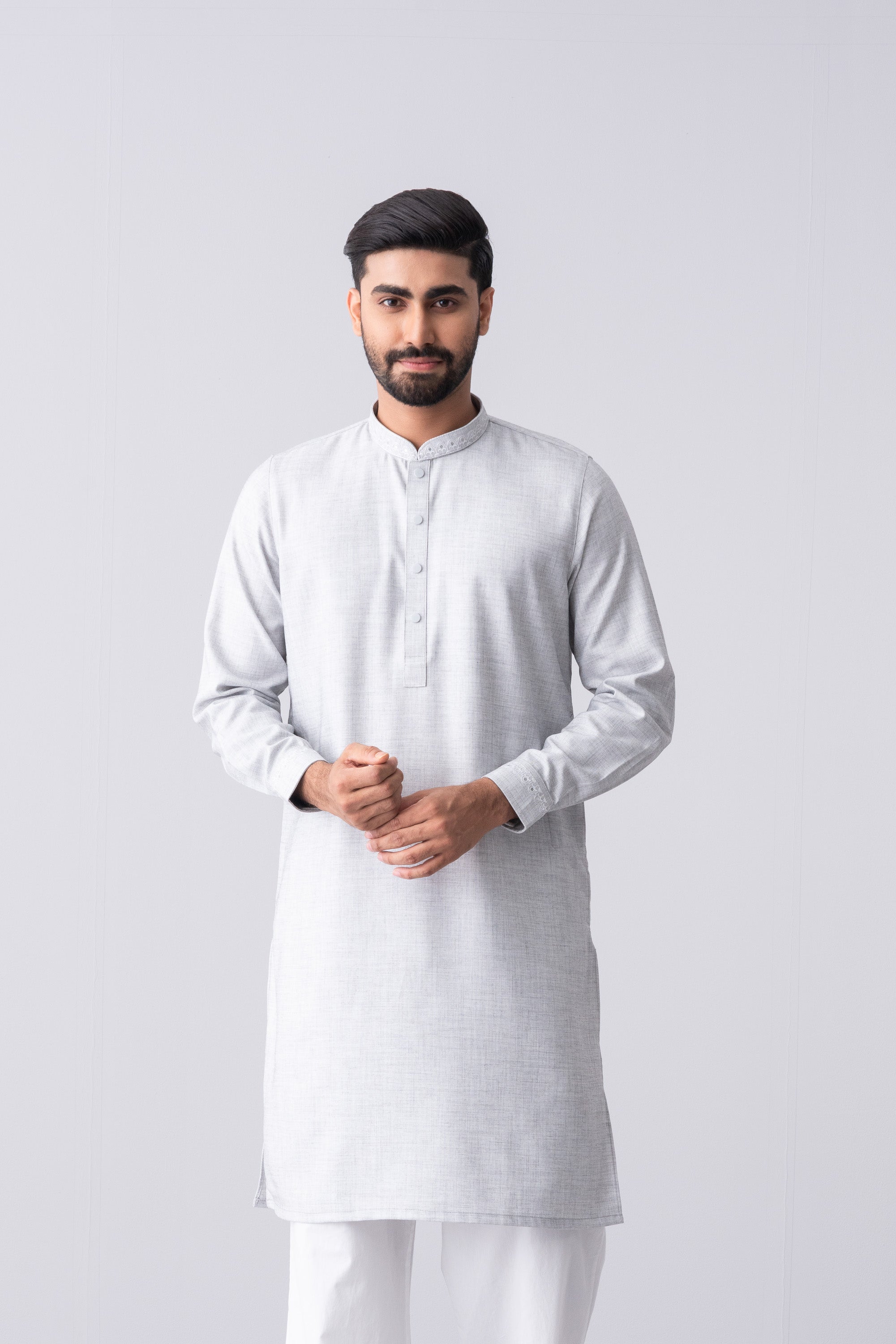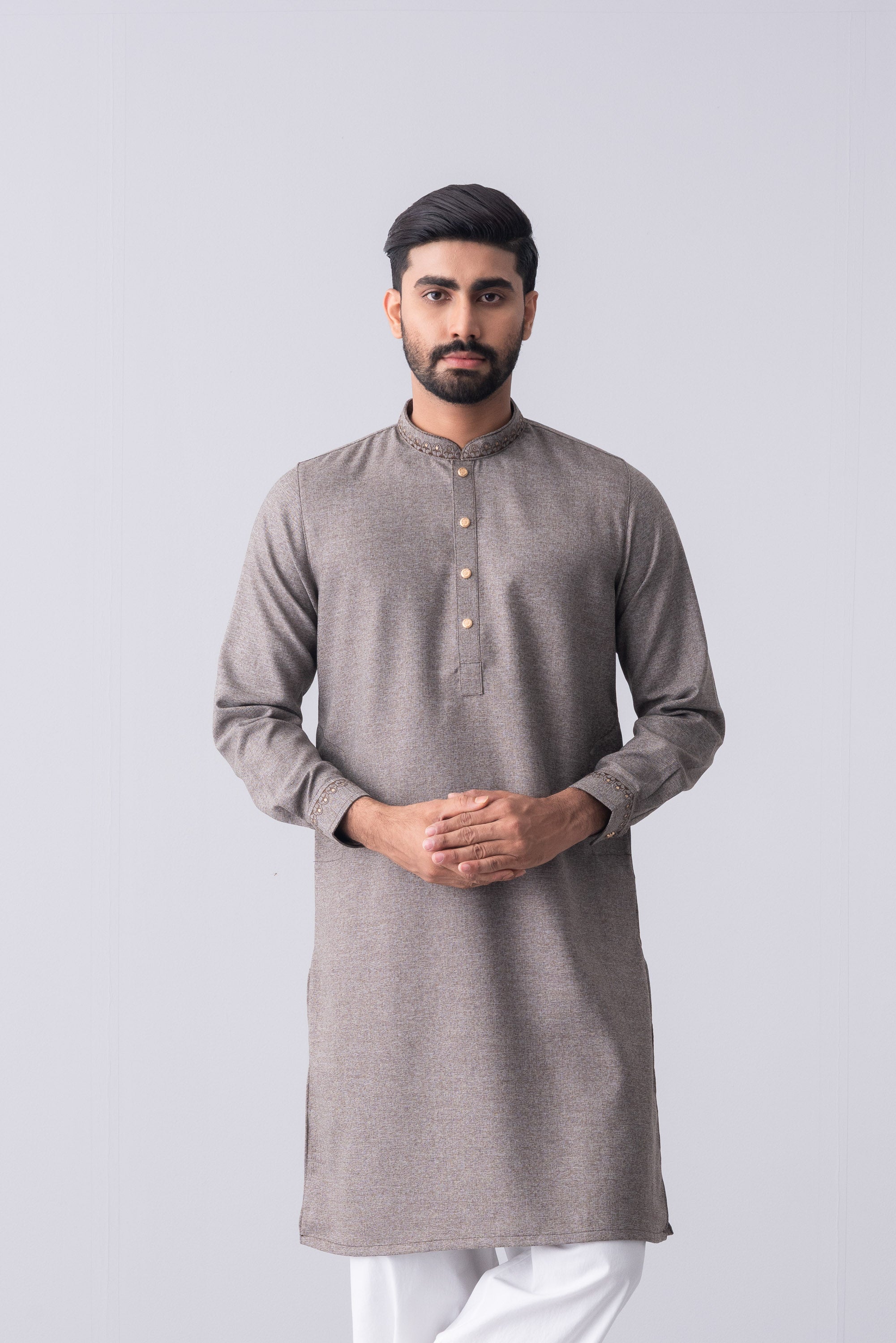 A regular-fit Panjabi crafted from premium TR fabric with 94% tencel 5% rayon and 1% spandex breathable fabric, featuring elegant band and cuff embroidery with premium snap buttons, offers a stylish yet comfortable formal look. Perfect for effortless elegance and all-day ease.