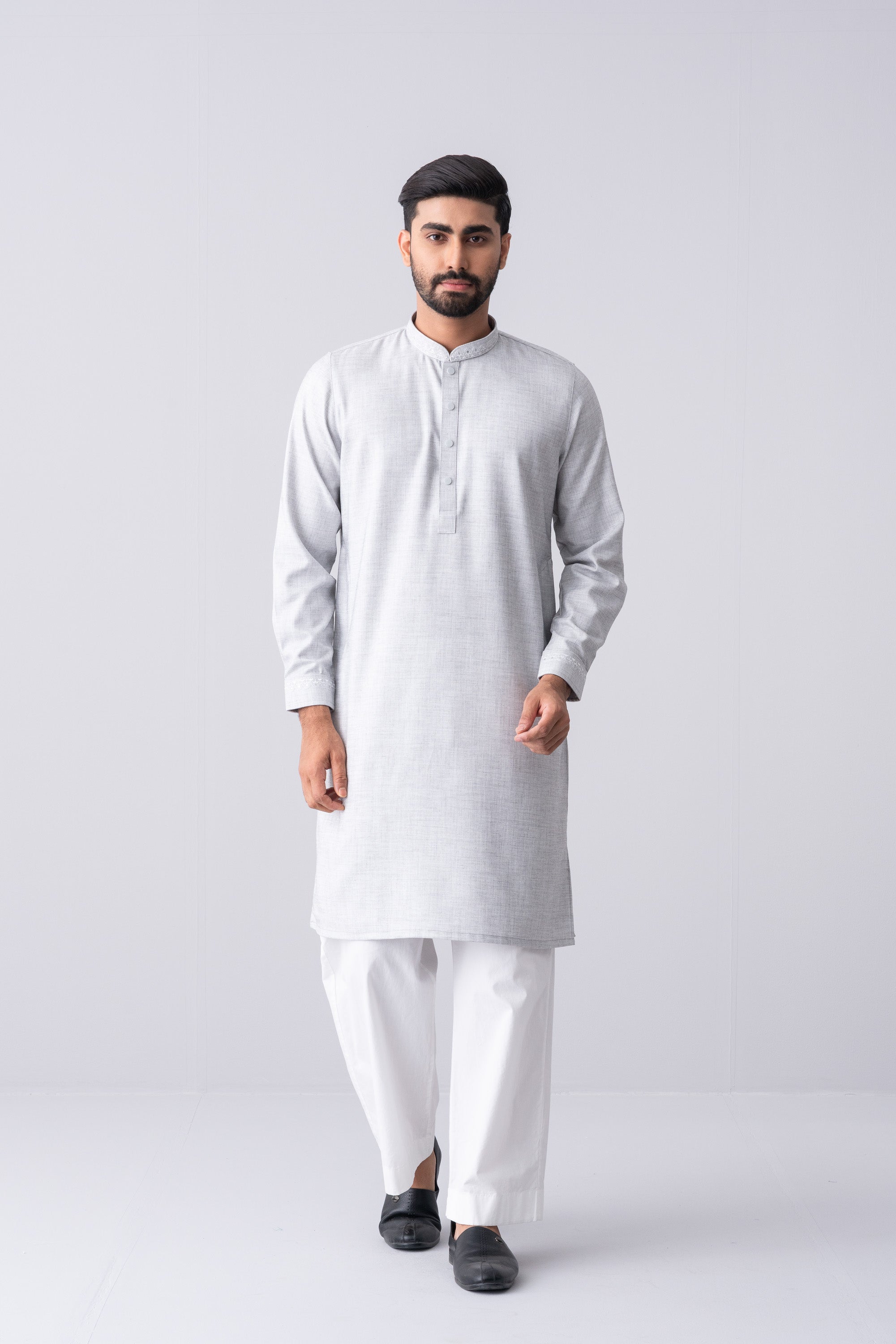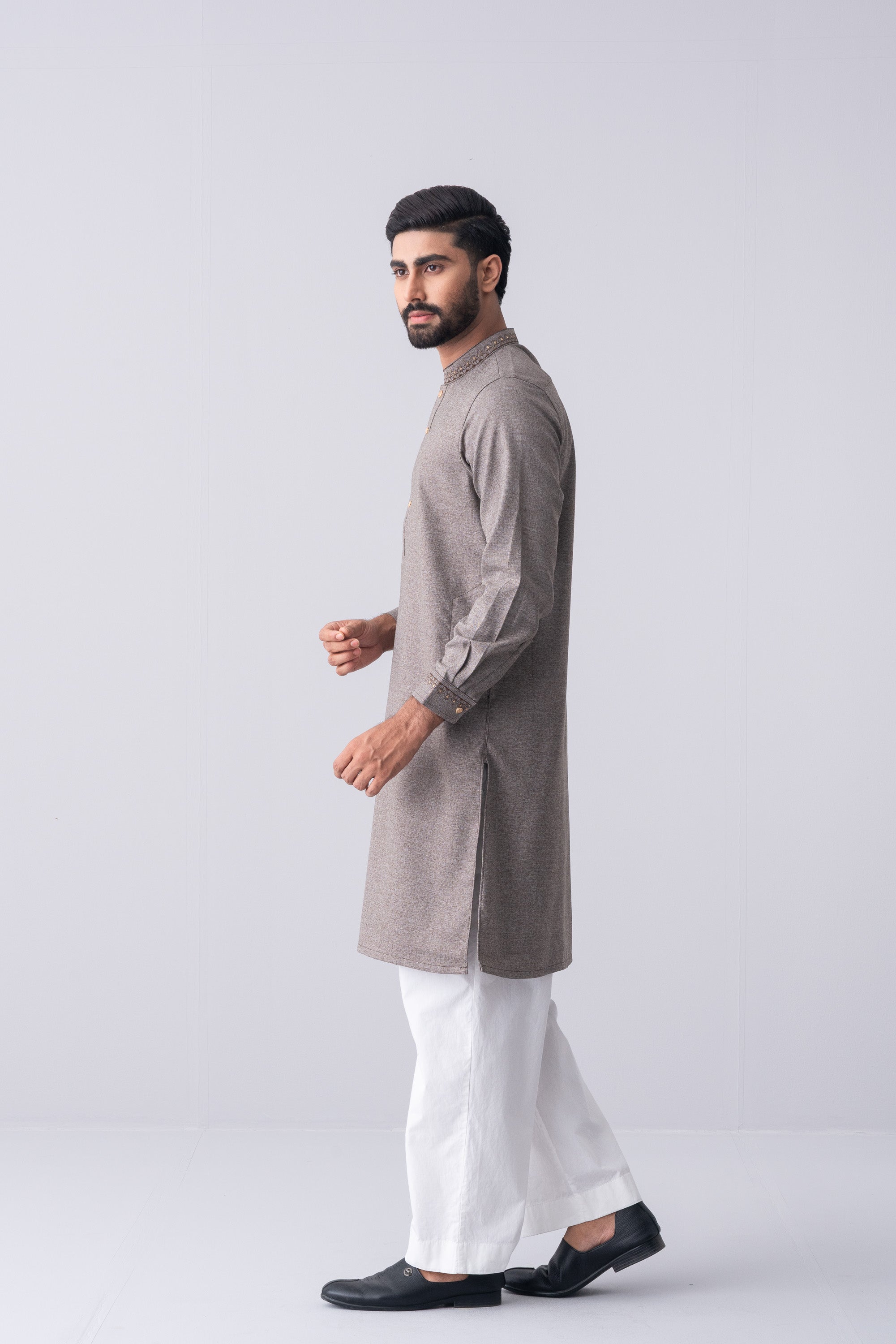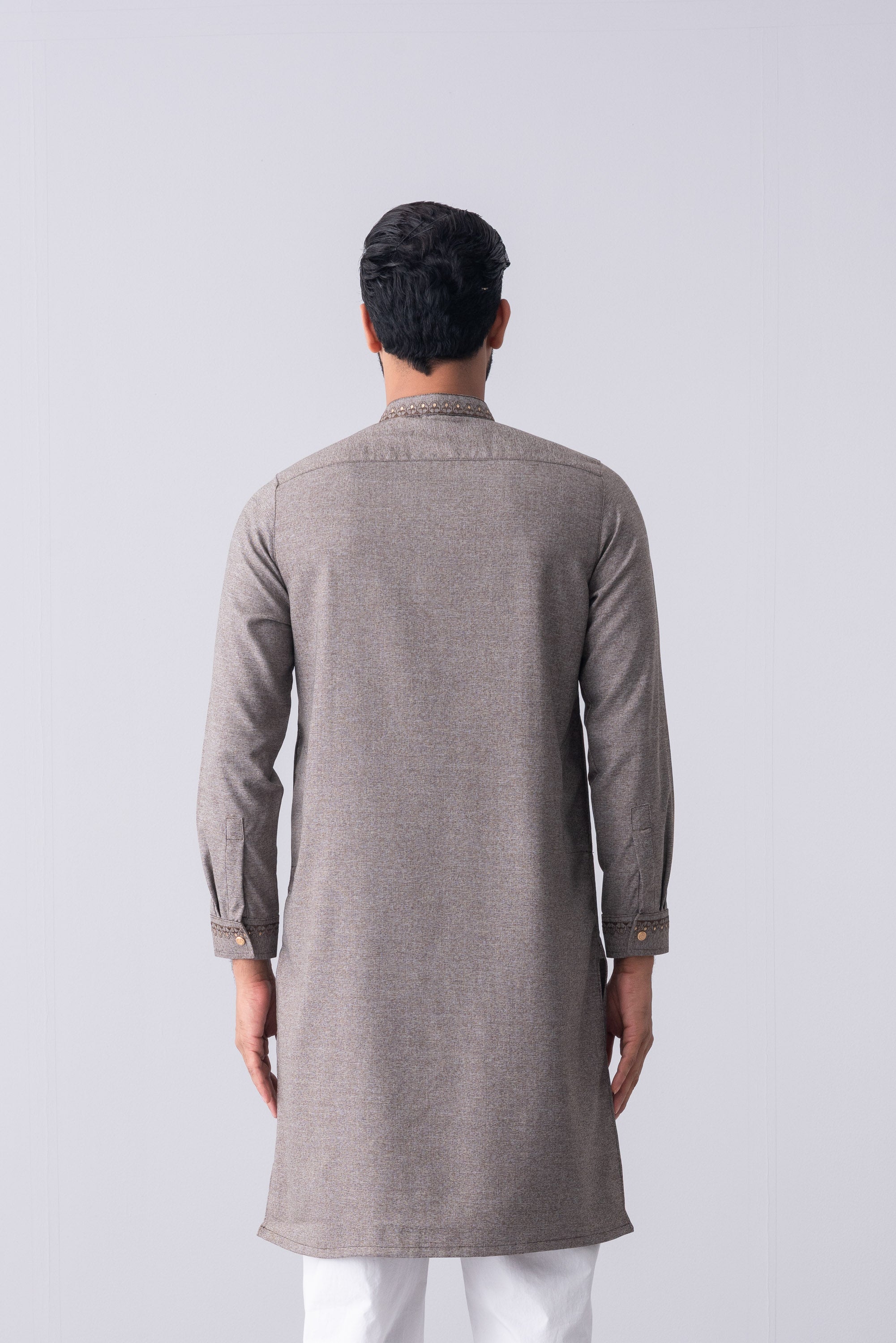 A regular-fit Panjabi crafted from premium TR fabric with 94% tencel 5% rayon and 1% spandex breathable fabric, featuring elegant band and cuff embroidery with premium snap buttons, offers a stylish yet comfortable formal look. Perfect for effortless elegance and all-day ease.