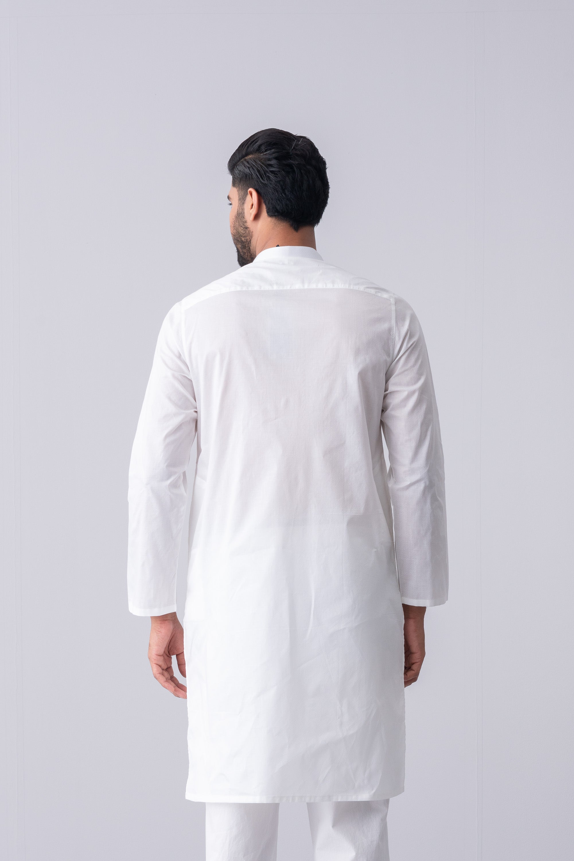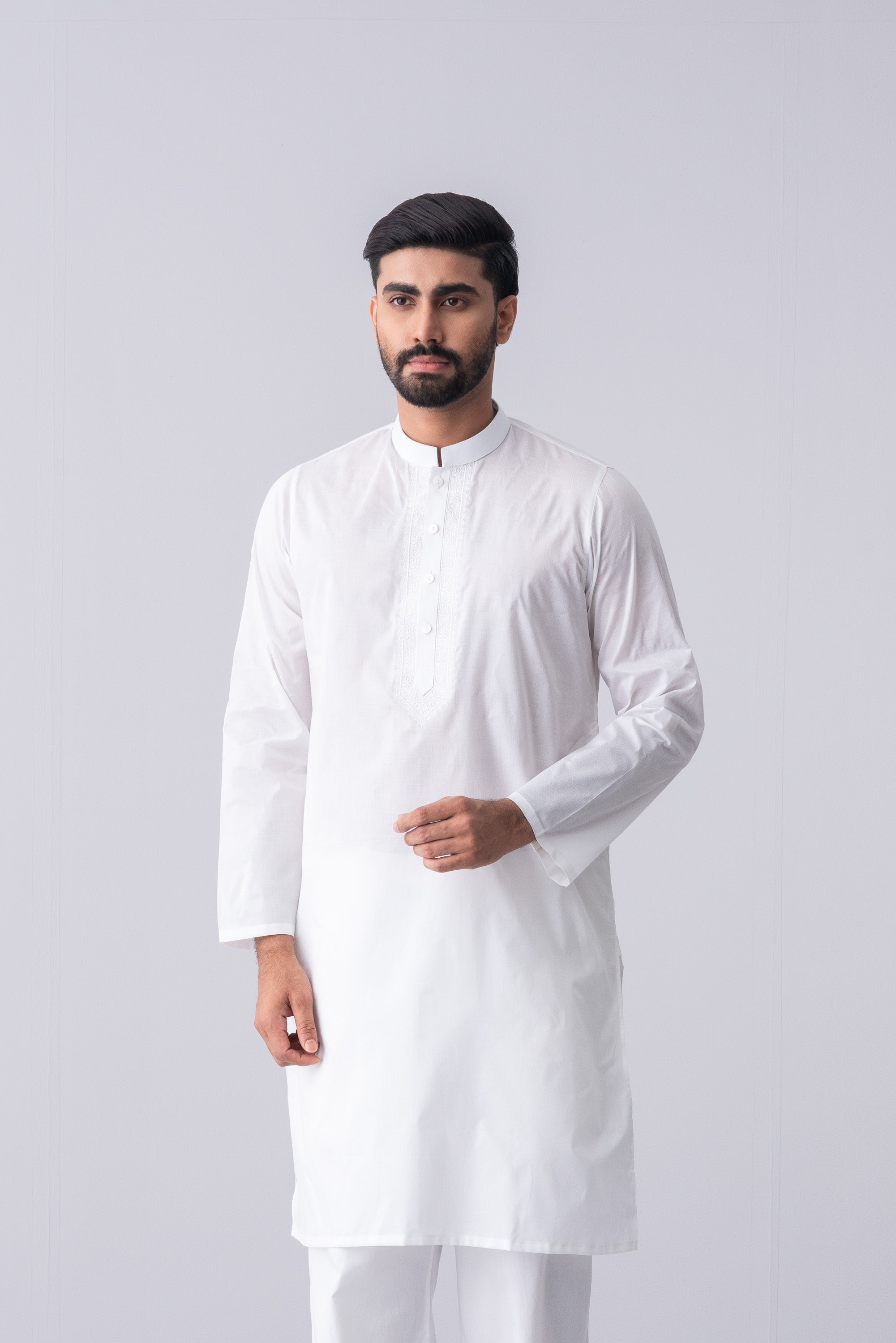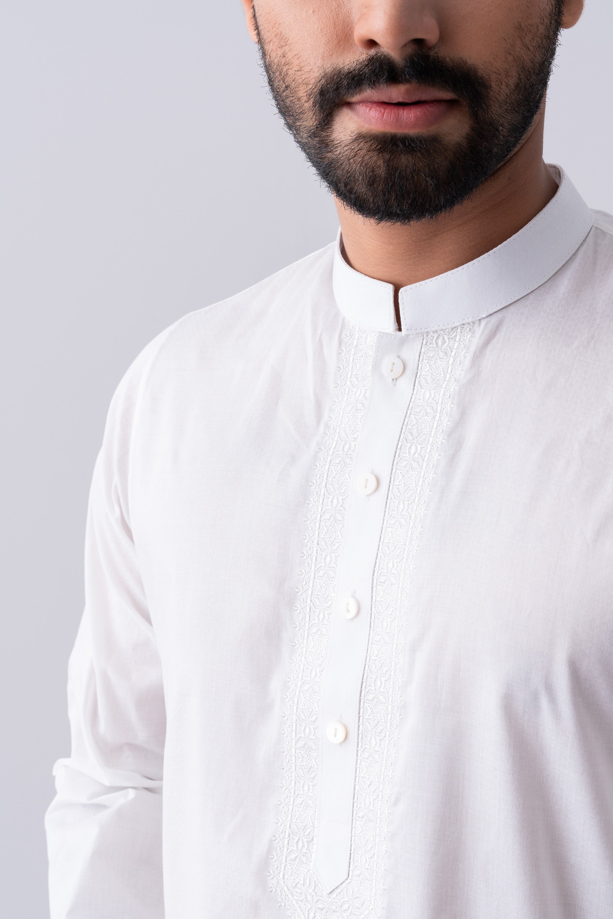 A regular-fit Panjabi crafted from 100% cotton breathable fabric, featuring embroidery on around placket and shell buttons, offers a stylish yet comfortable semi-formal look. Perfect for effortless elegance for every occasion.