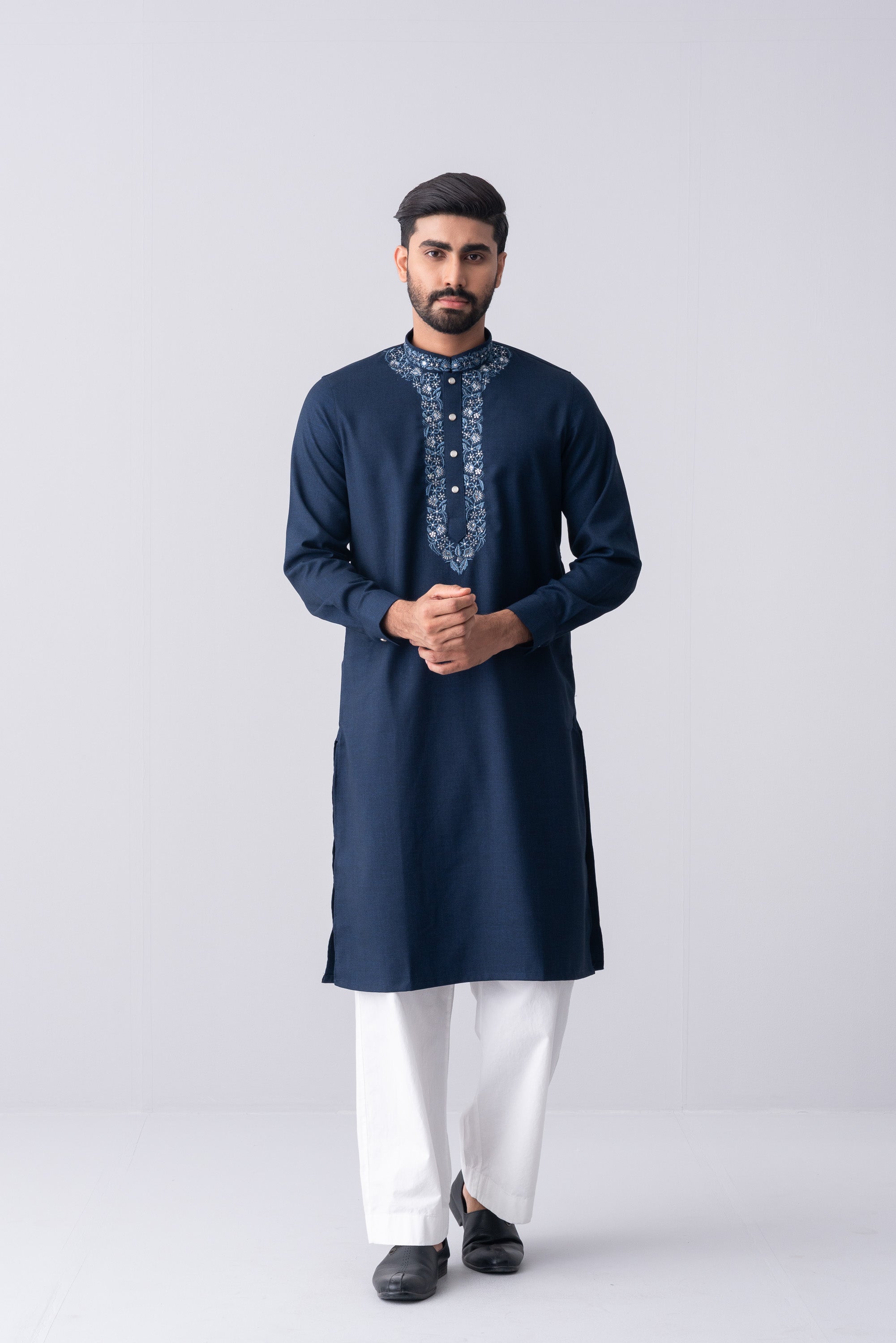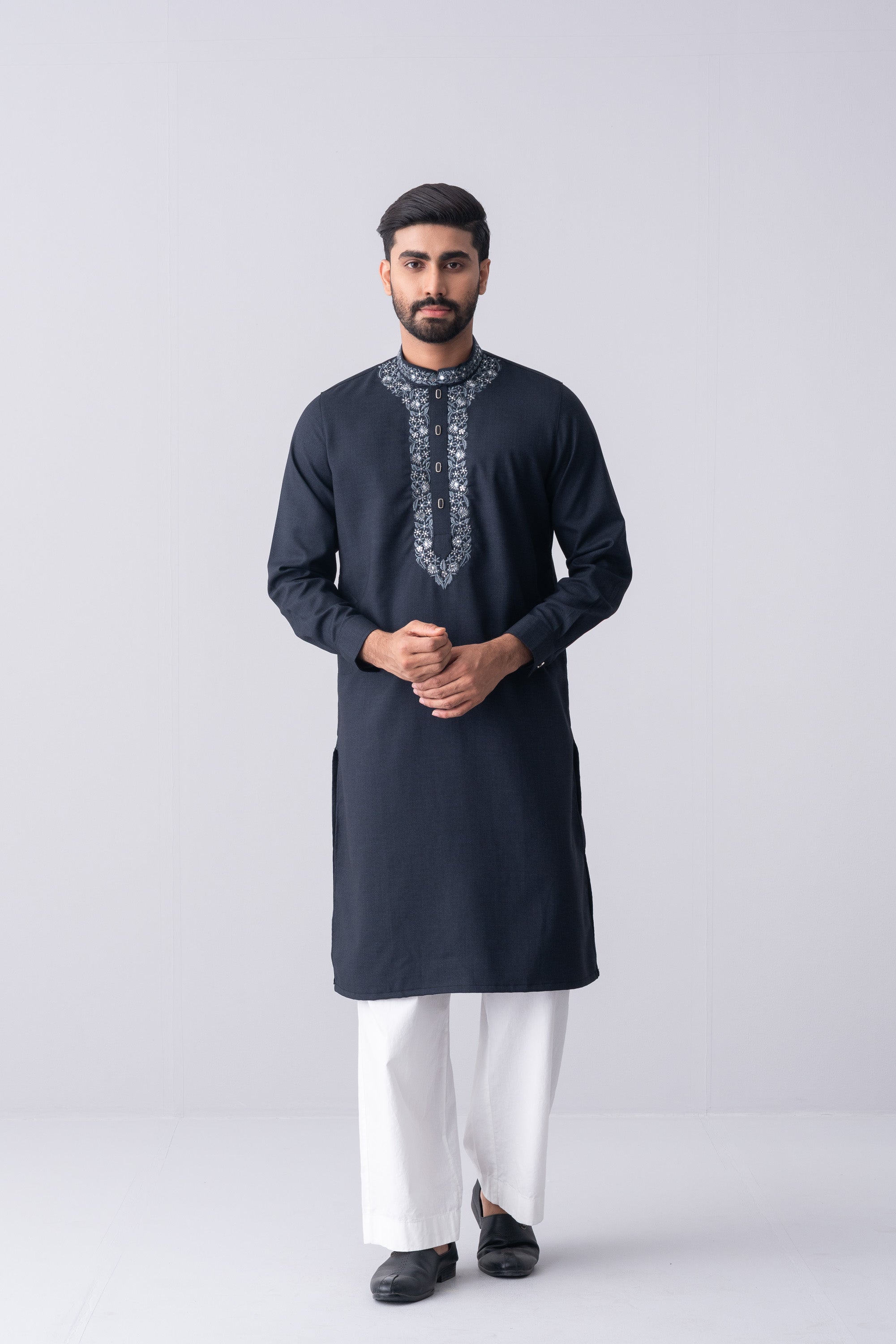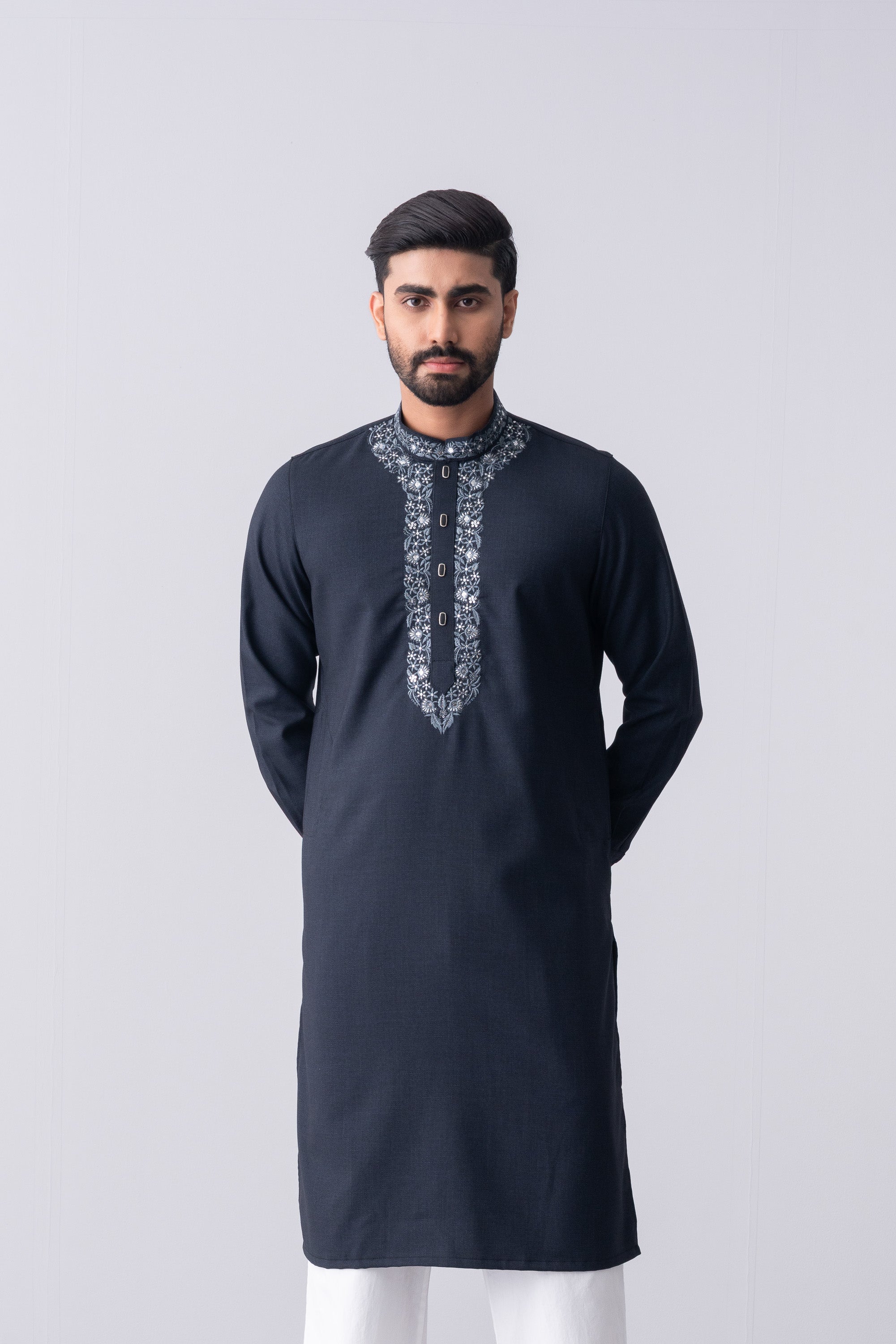 A regular-fit Panjabi crafted from premium TR fabric with 94% tencel 5% rayon and 1% spandex breathable fabric, featuring elegant embroidery detailing at band and around placket and premium decorative snap buttons, offers a stylish yet comfortable formal look. Perfect for effortless elegance and all-day ease.