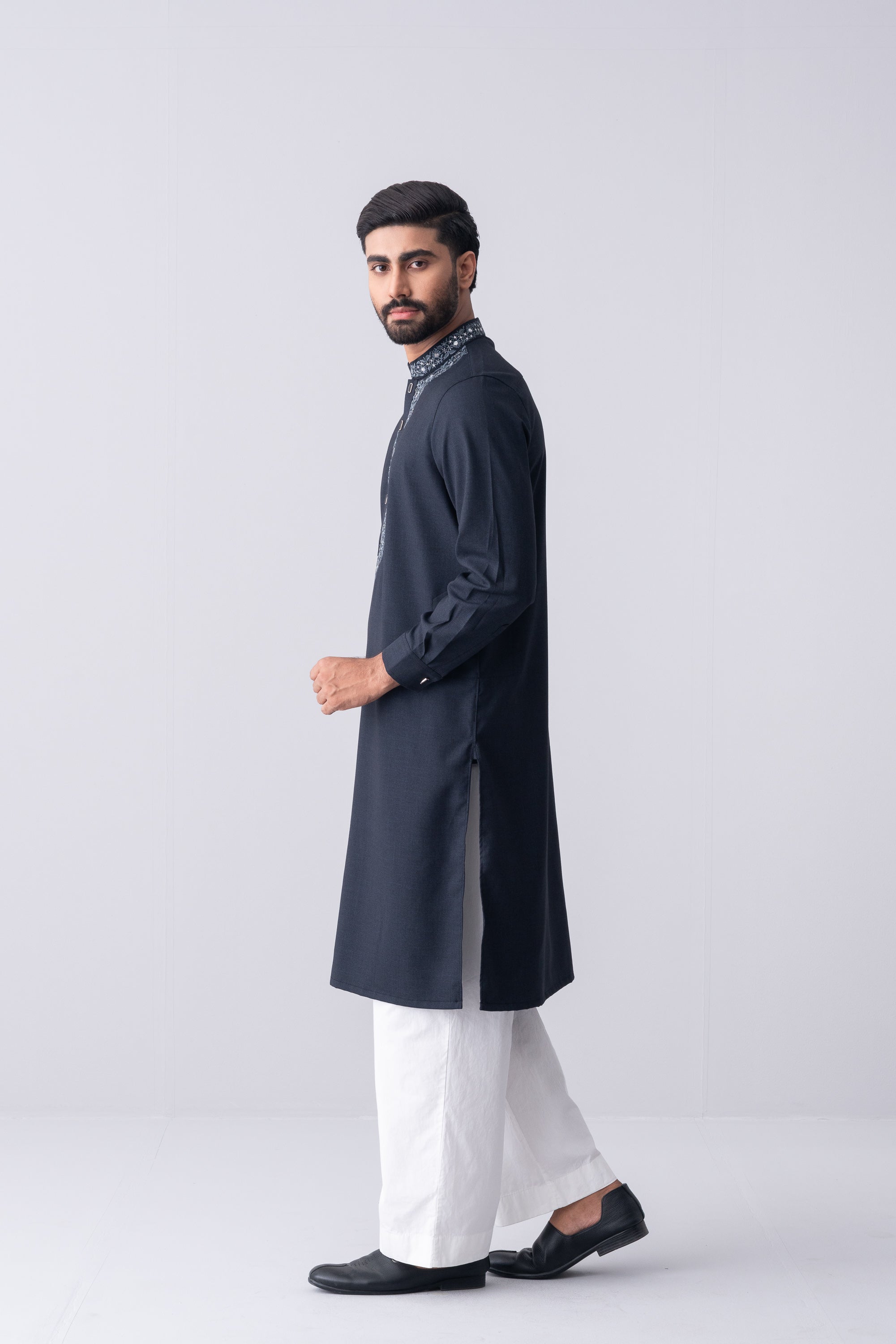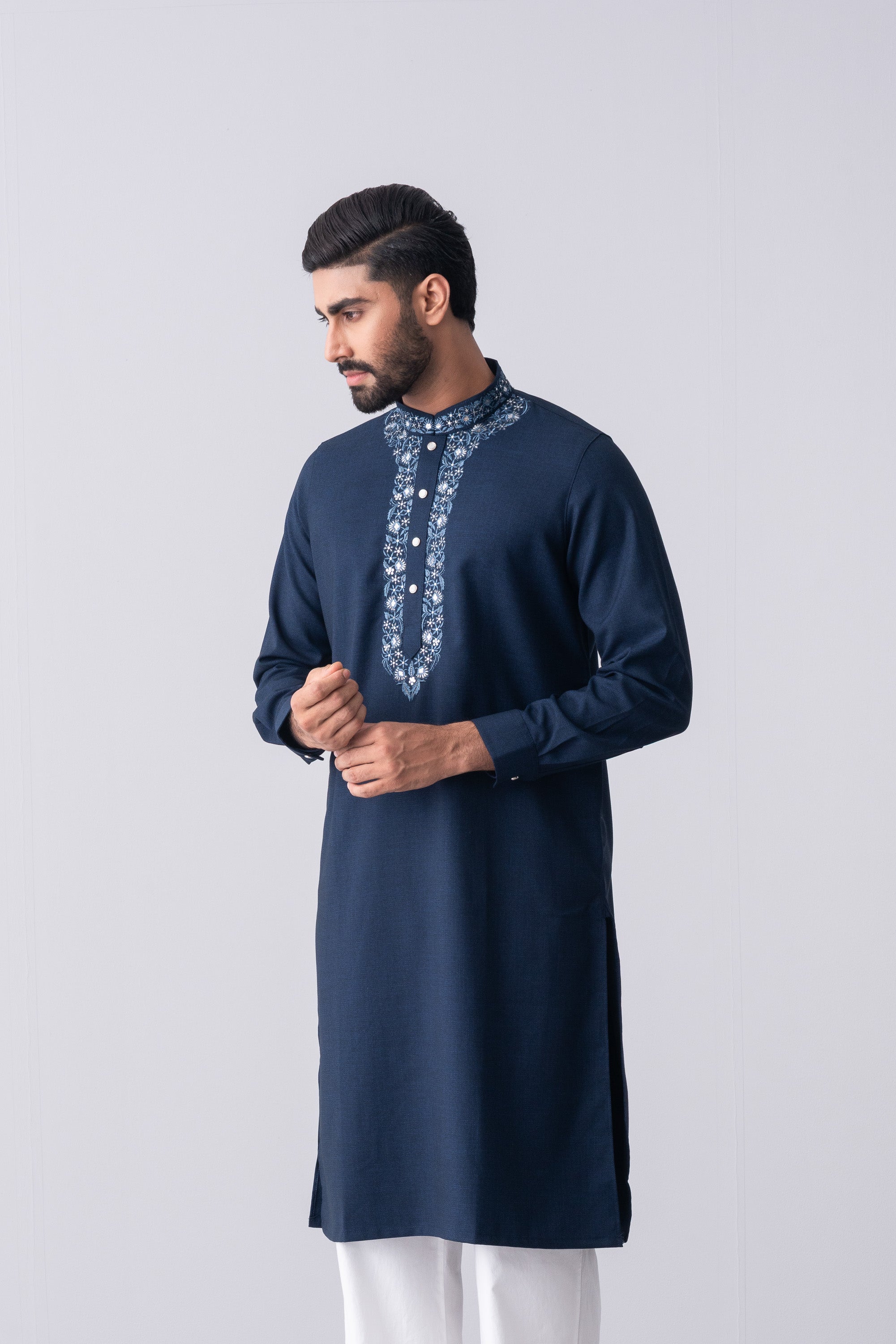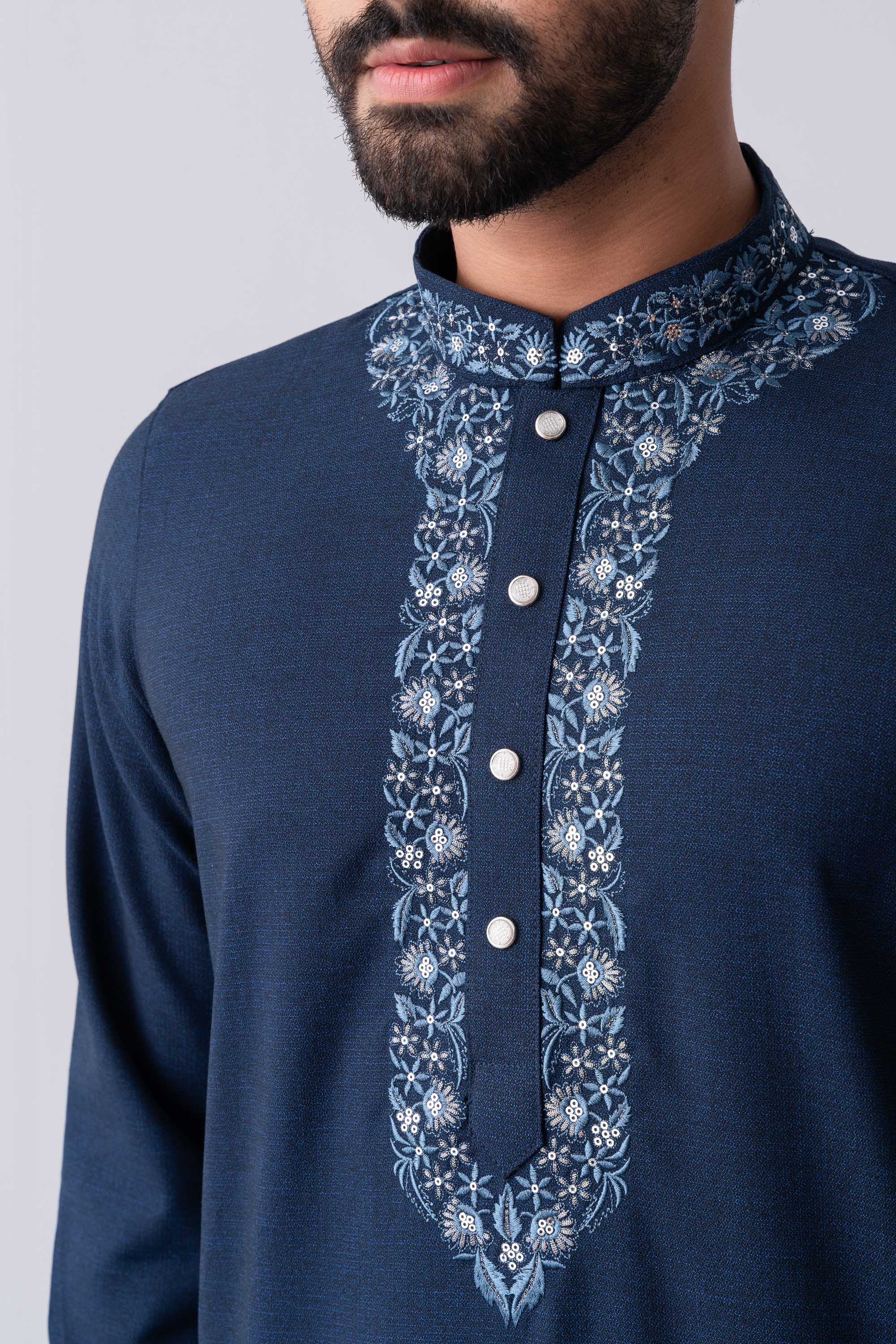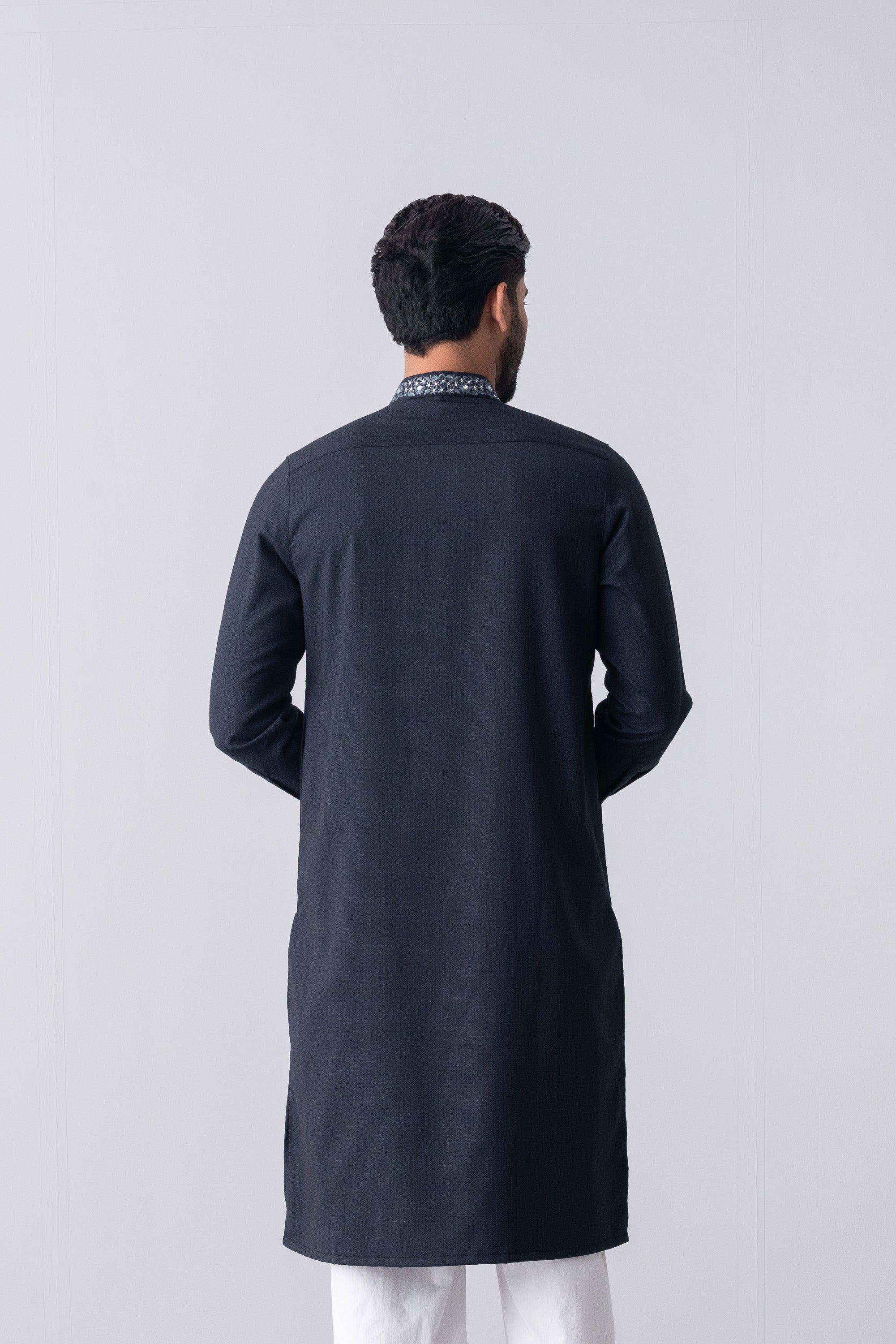 A regular-fit Panjabi crafted from premium TR fabric with 94% tencel 5% rayon and 1% spandex breathable fabric, featuring elegant embroidery detailing at band and around placket and premium decorative snap buttons, offers a stylish yet comfortable formal look. Perfect for effortless elegance and all-day ease.