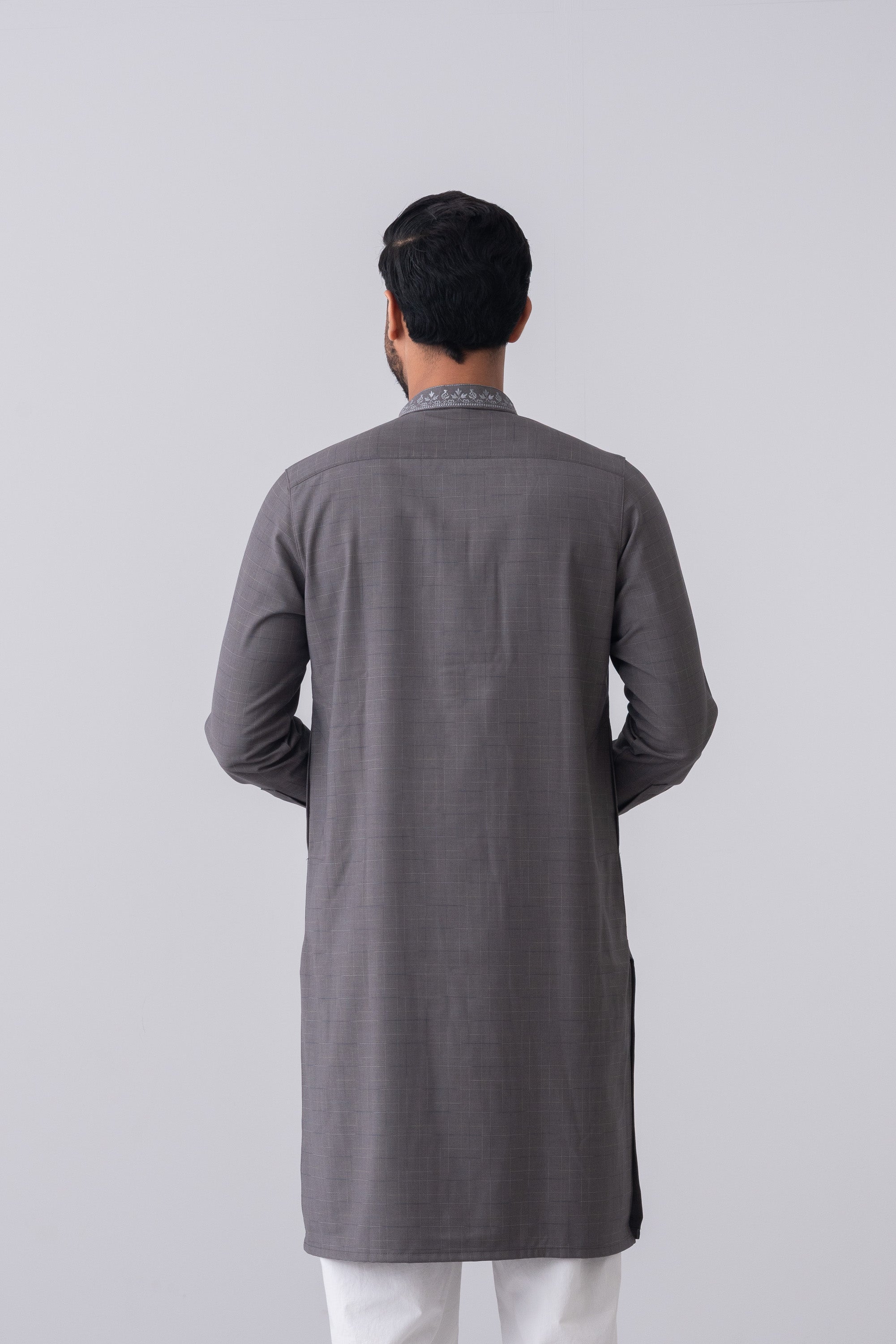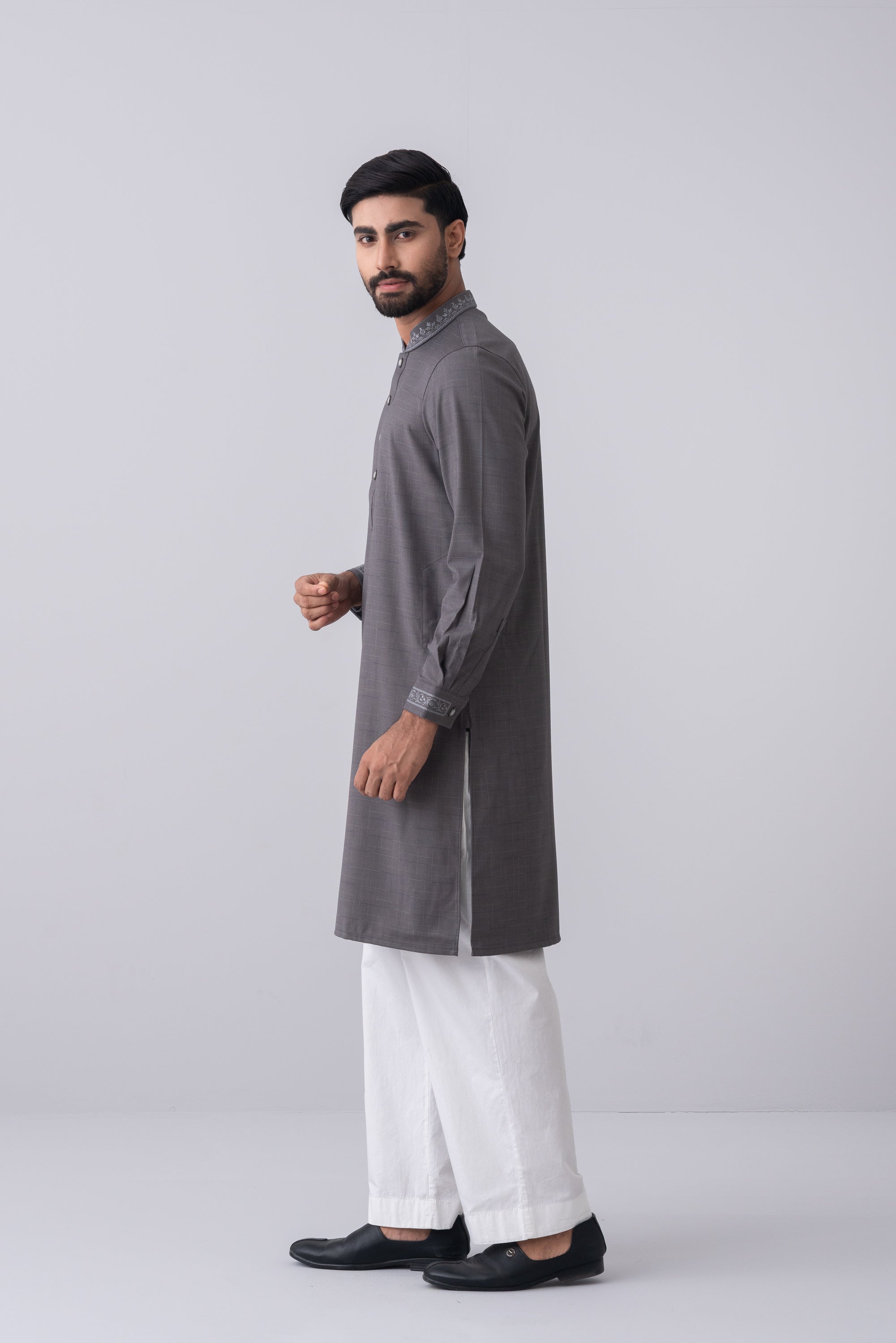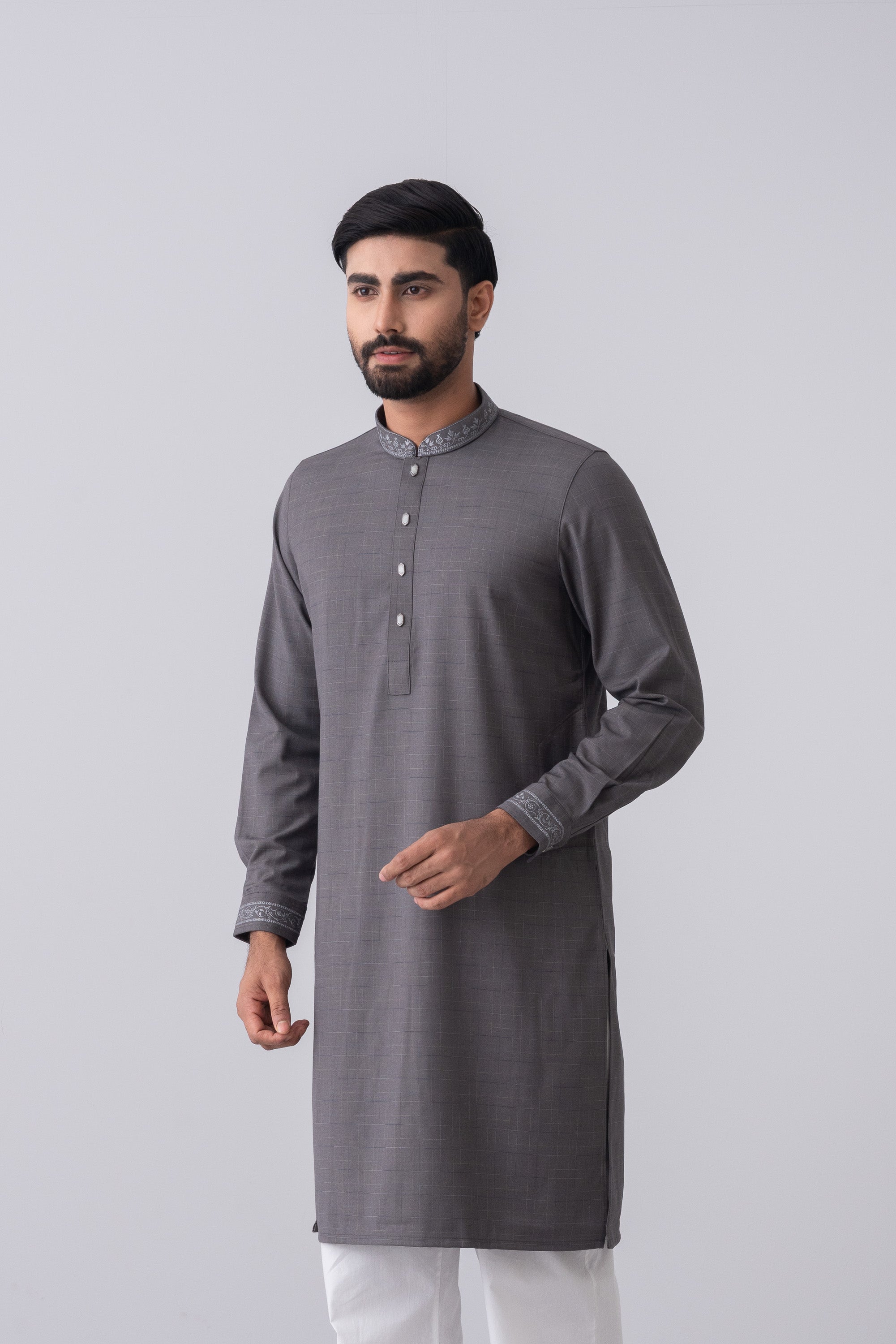 A regular-fit Panjabi crafted from premium TR fabric with 94% tencel 5% rayon and 1% spandex breathable fabric, featuring embroidery on band and cuff with decorative snap buttons, offers a stylish yet comfortable formal look. Perfect for effortless elegance and all-day ease.