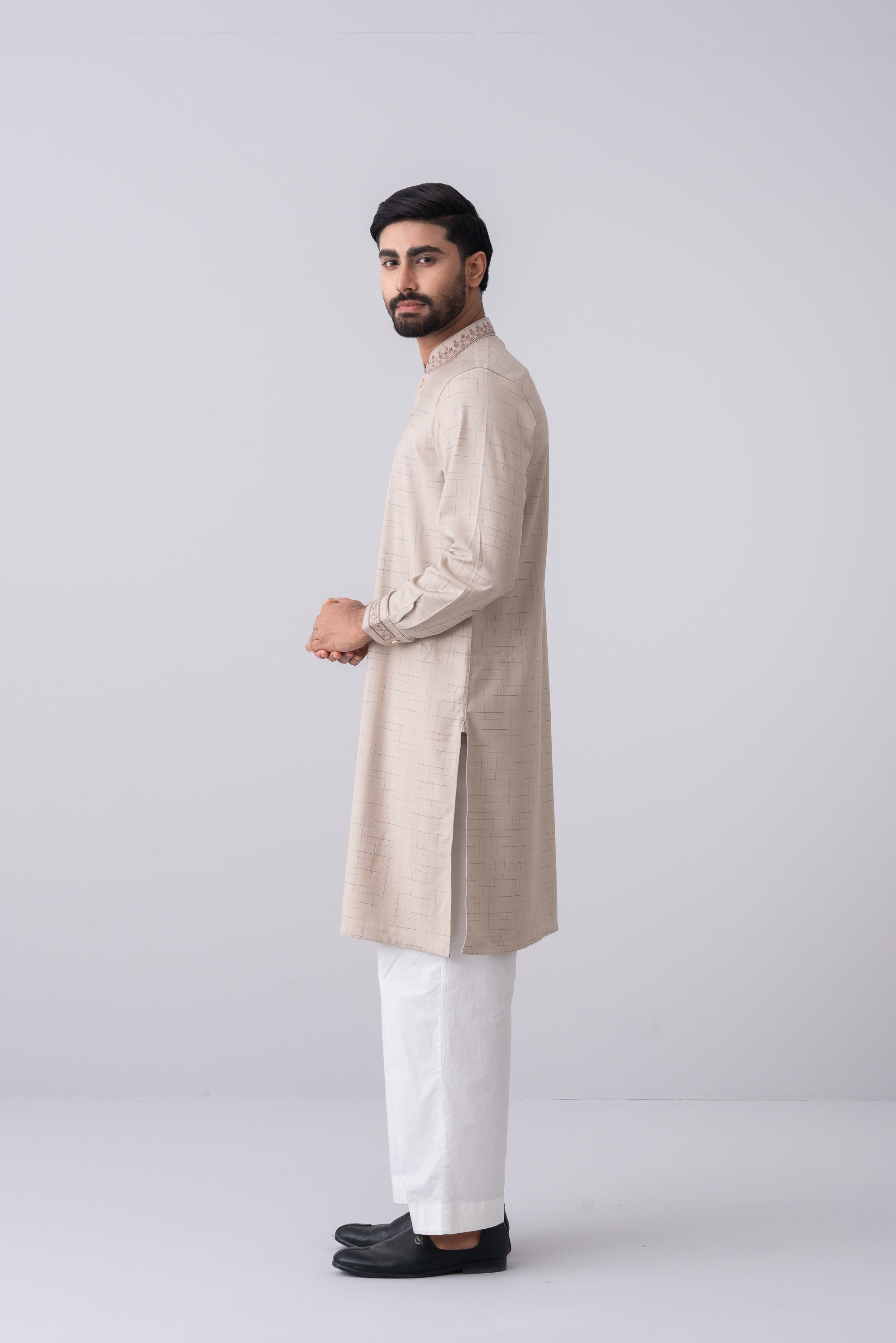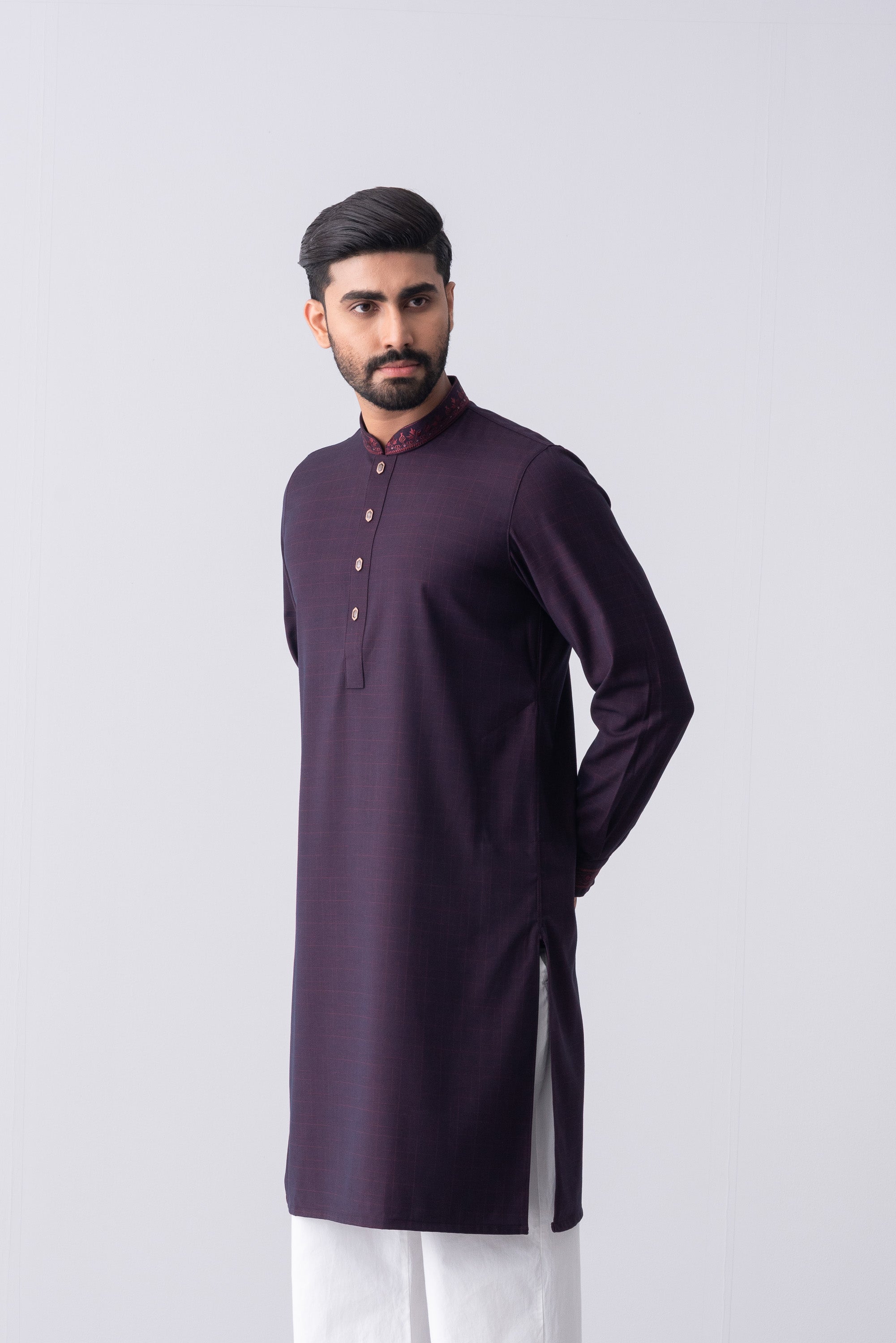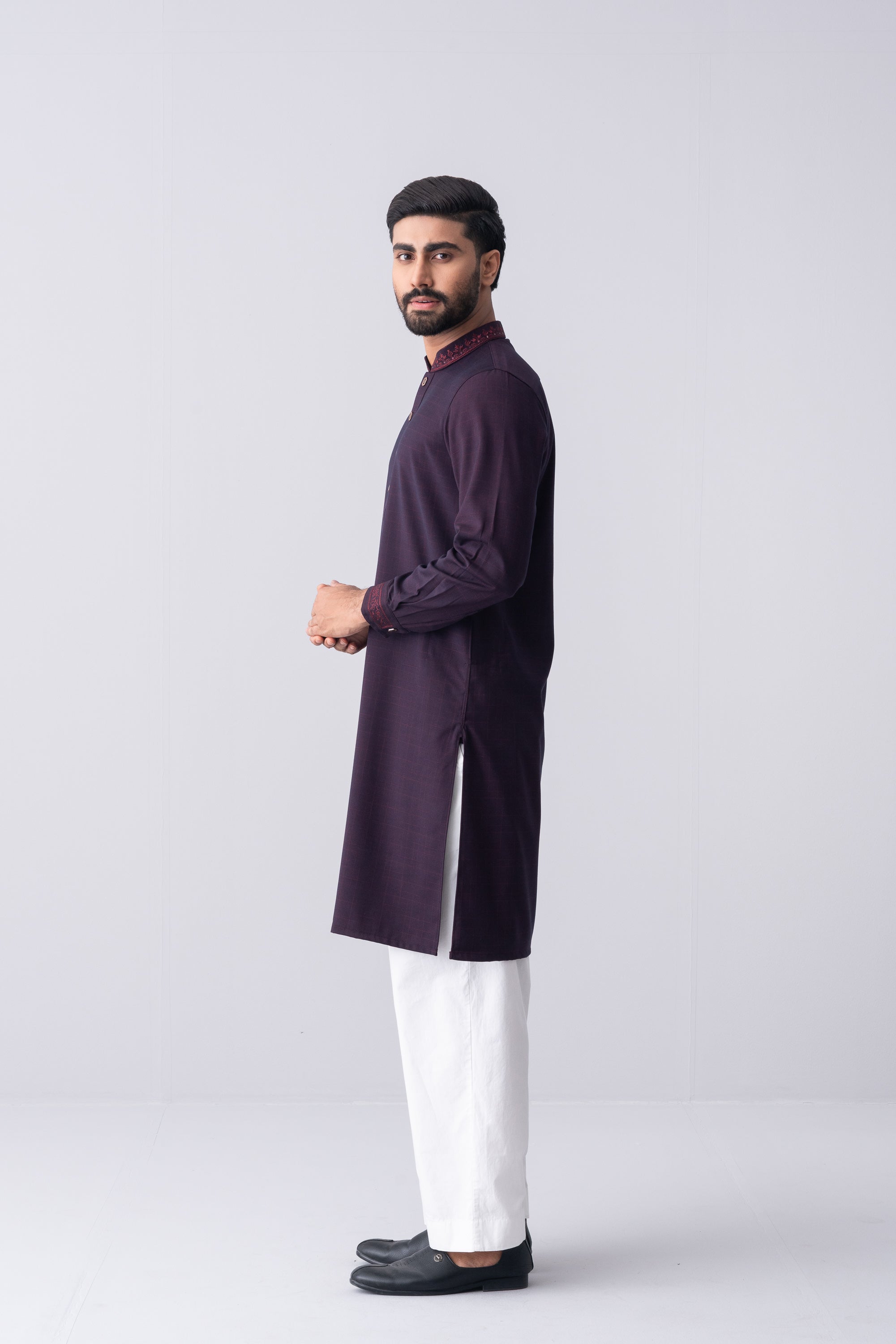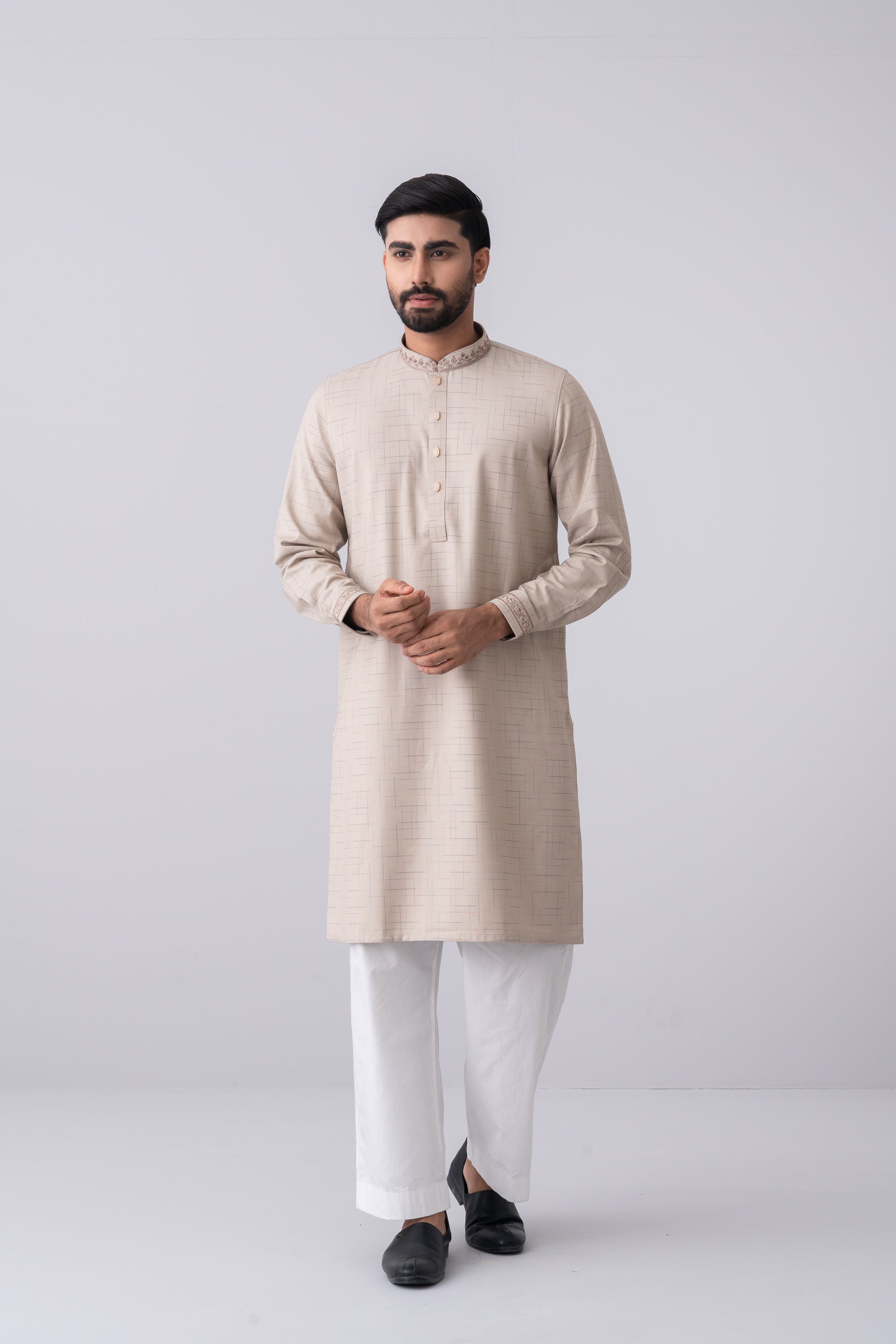 A regular-fit Panjabi crafted from premium TR fabric with 94% tencel 5% rayon and 1% spandex breathable fabric, featuring embroidery on band and cuff with decorative snap buttons, offers a stylish yet comfortable formal look. Perfect for effortless elegance and all-day ease.